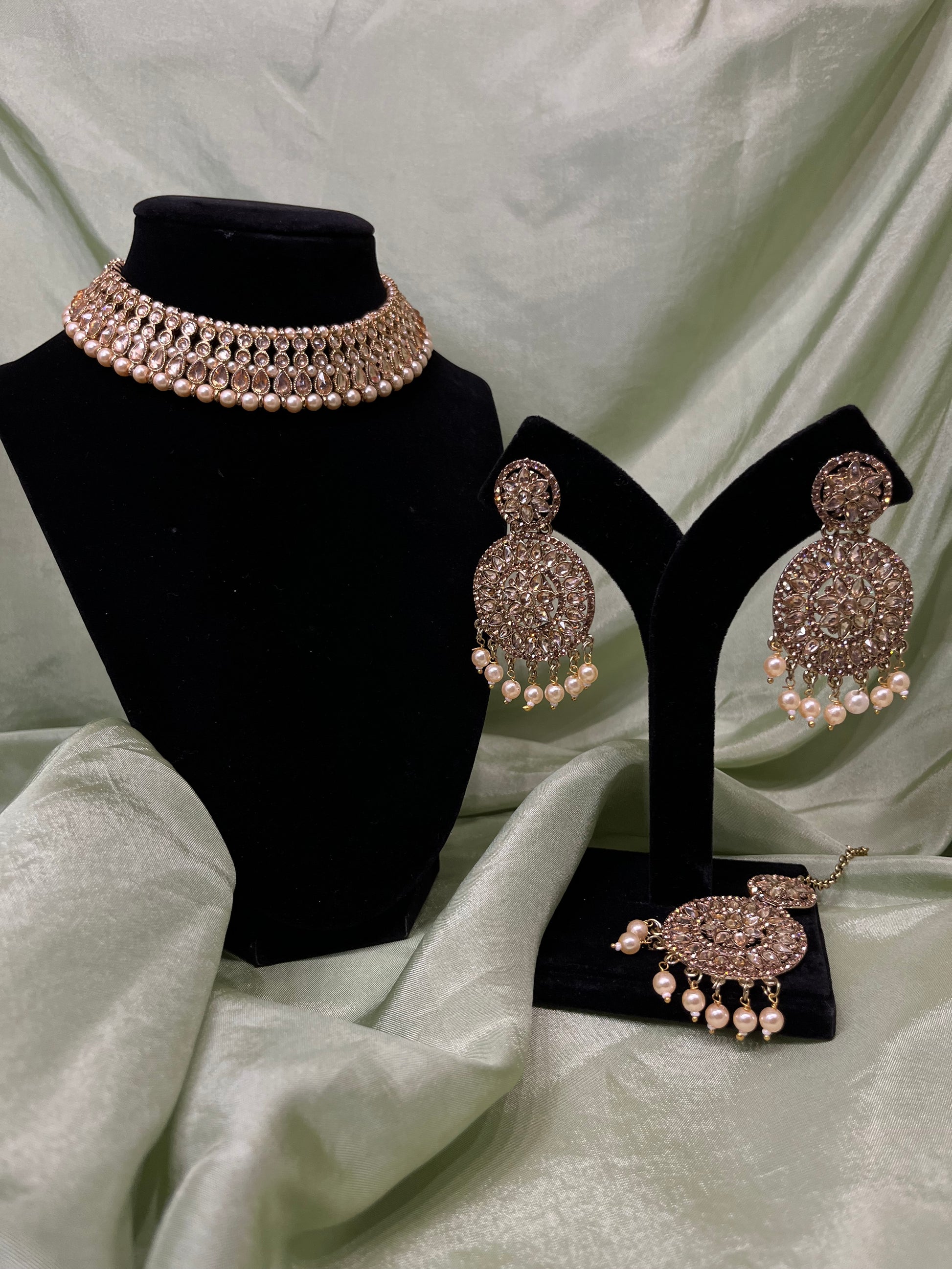 Gold necklace with pearl details; comes with round shape earrings and tikka.