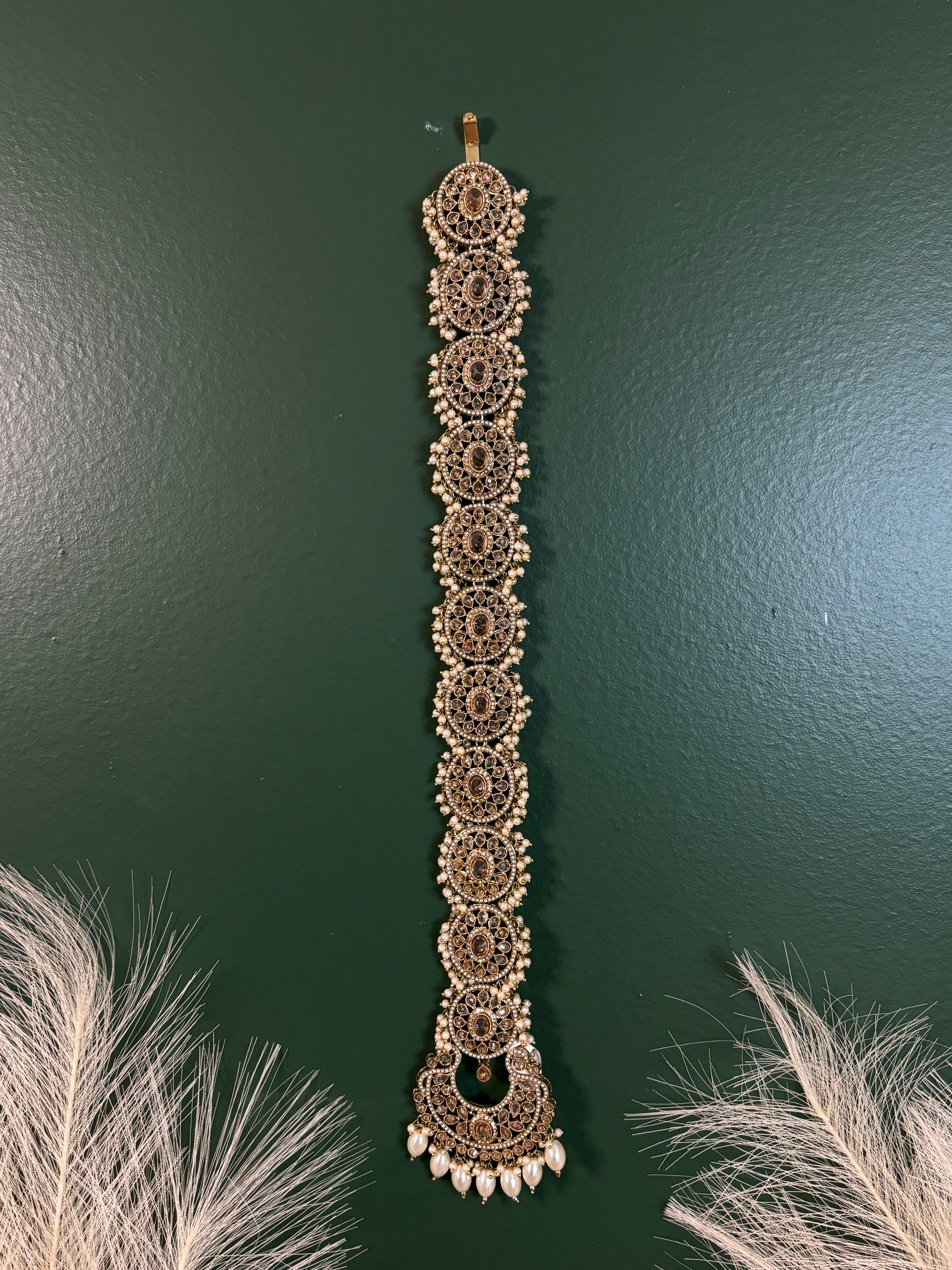 Gold choti (braid accessory) in polki with pearl details; comes with hooks to secure on top of braid