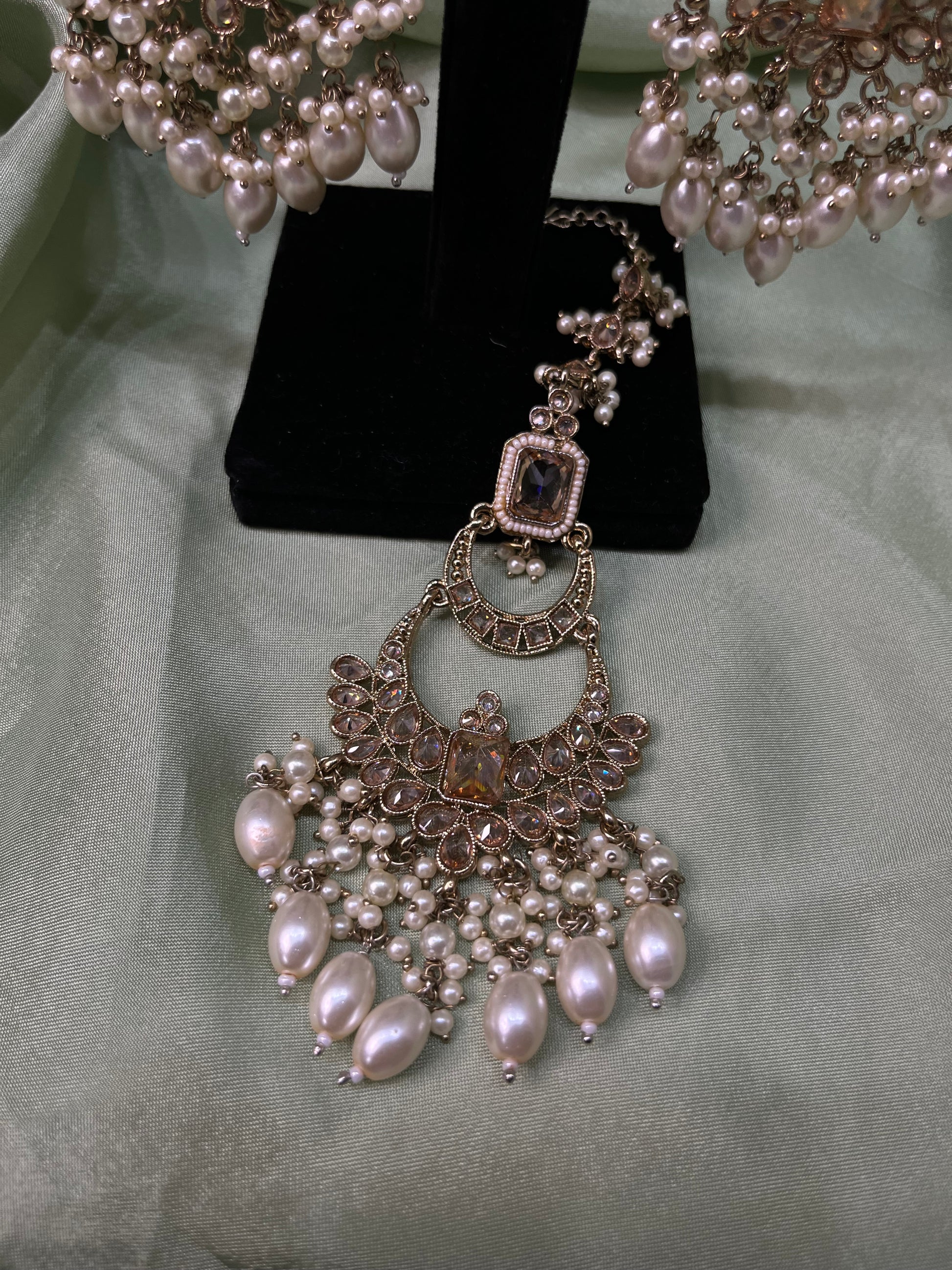Heavy structured gold bridal choker set with pearl details; comes with earrings and tikka.