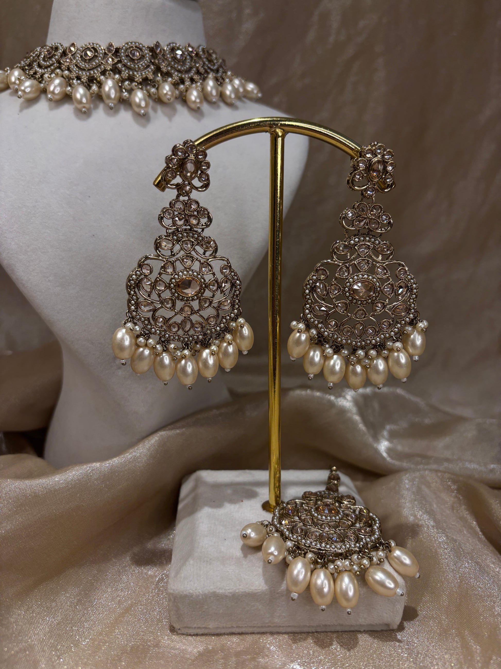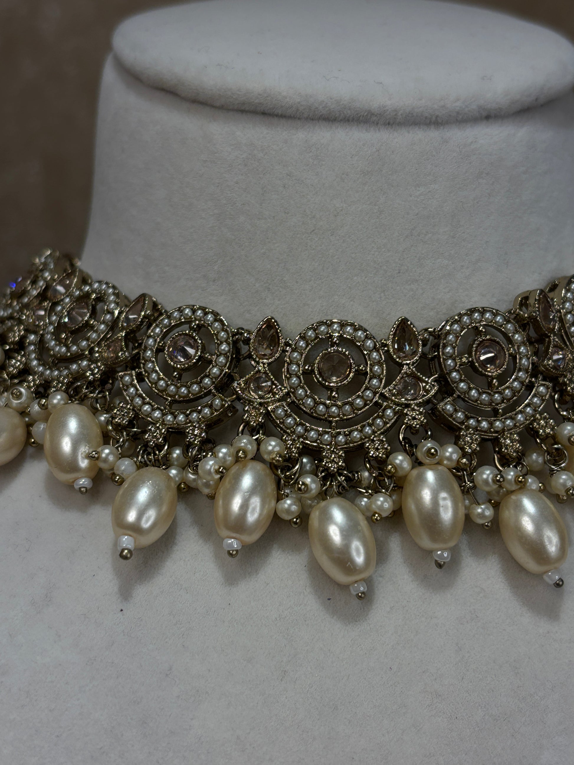 Gold choker with small champagne coloured pearls; can also be worn as a necklace