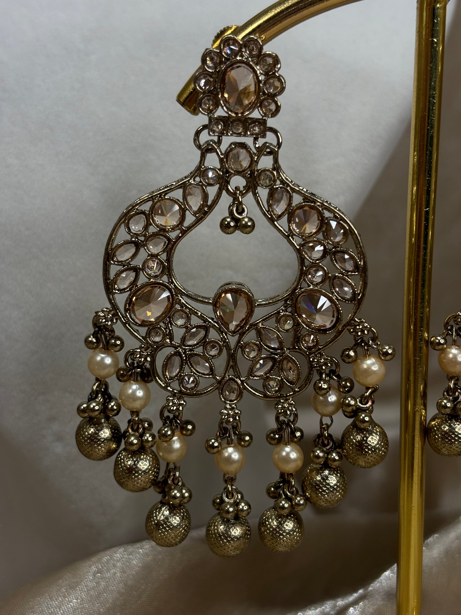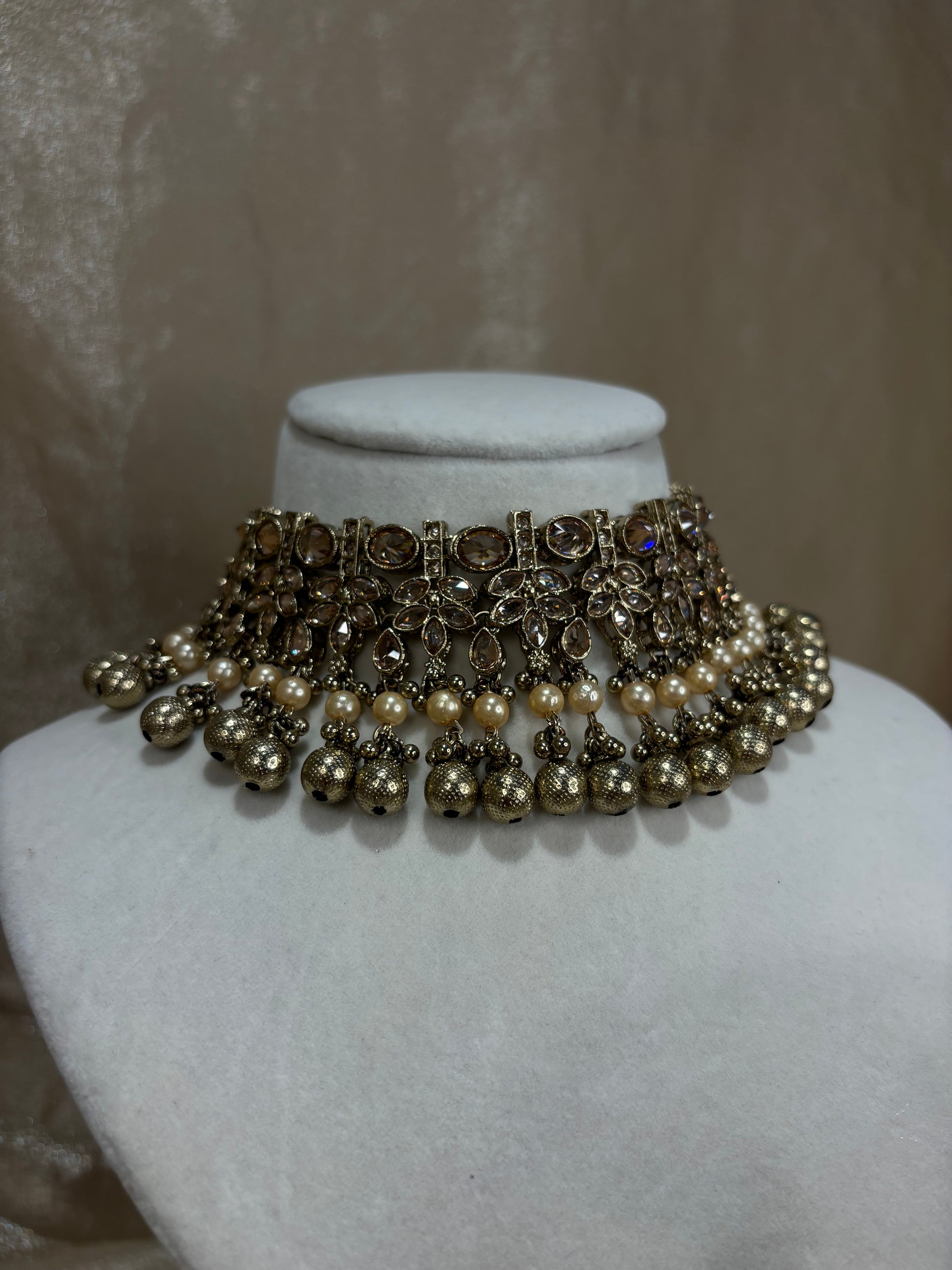 Metal gold choker set; comes with detailed earrings and tikka