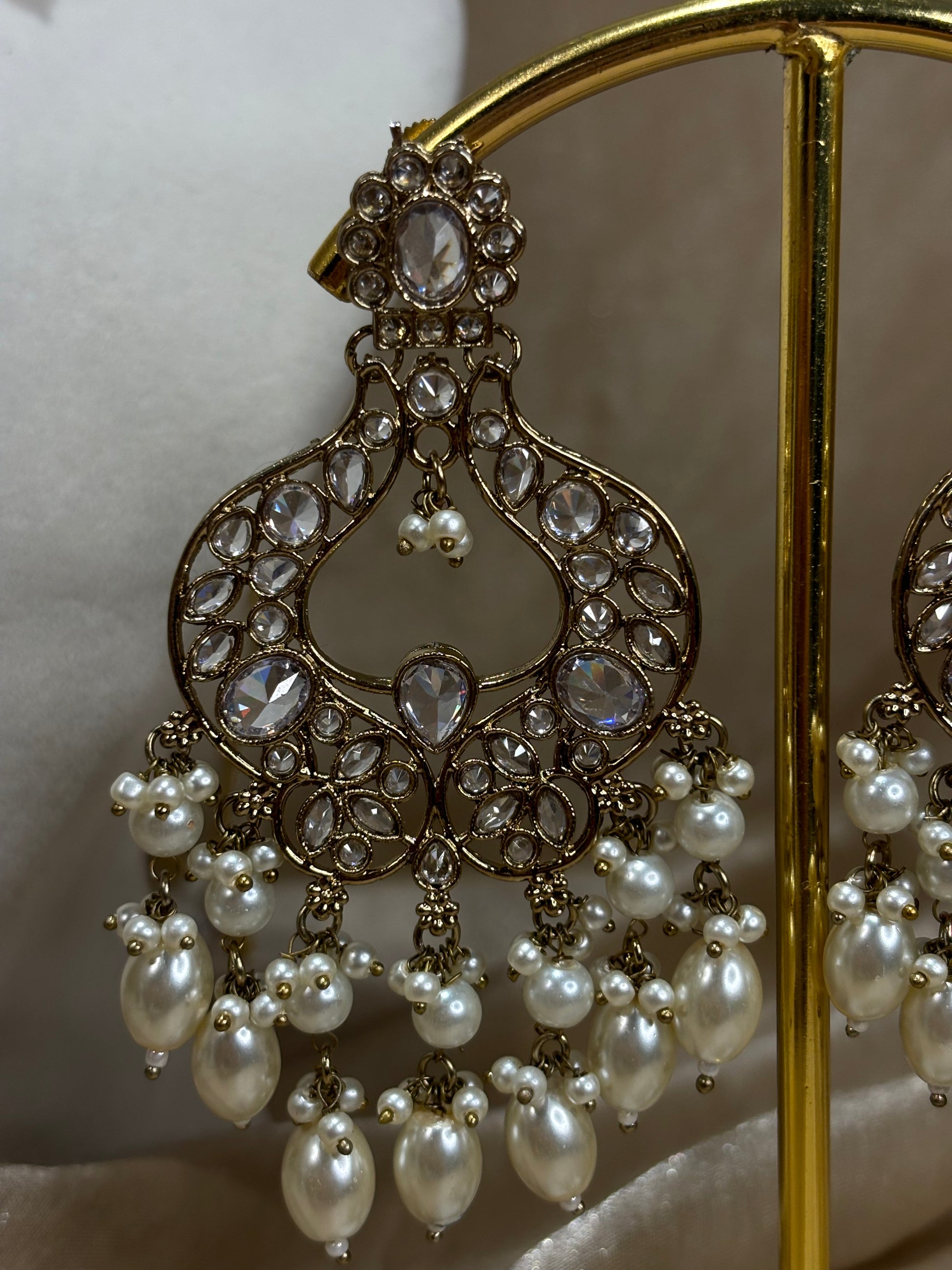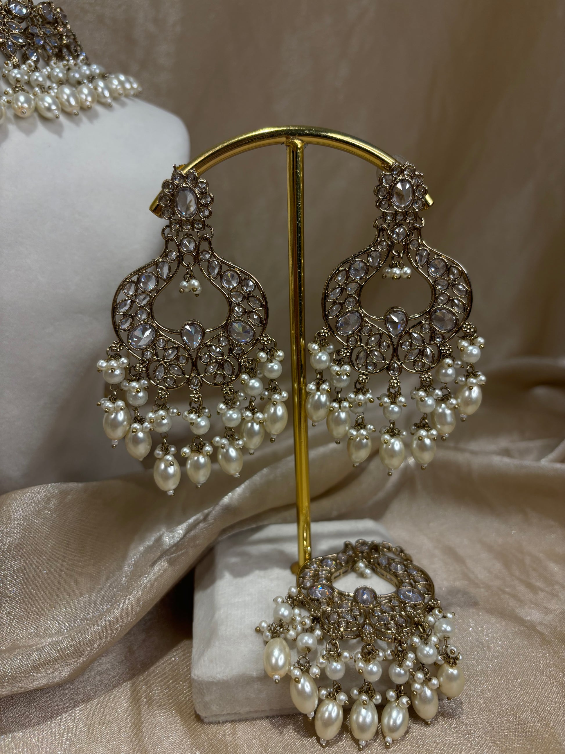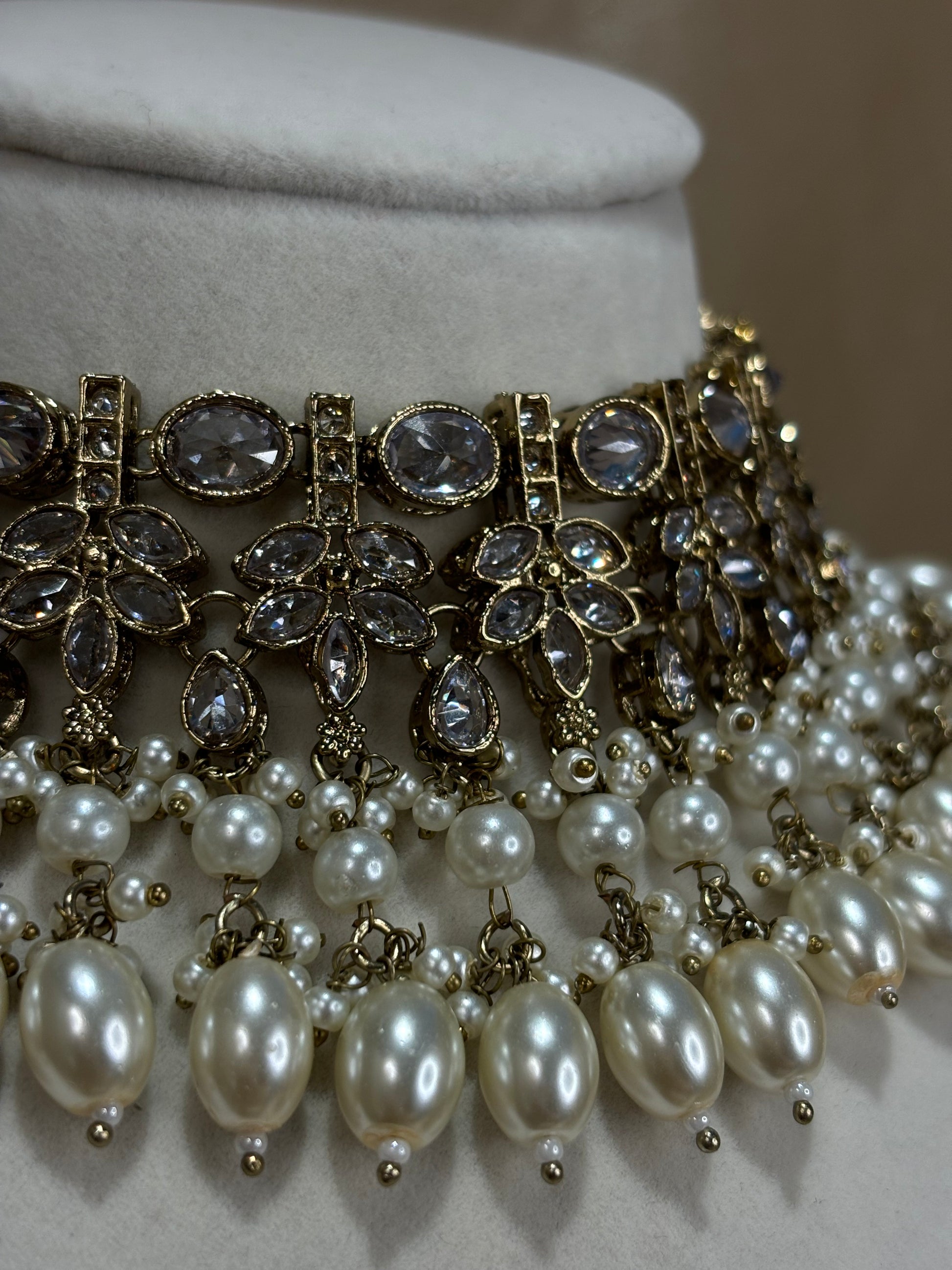 Gold choker set with white pearl details; comes with detailed earrings and tikka
