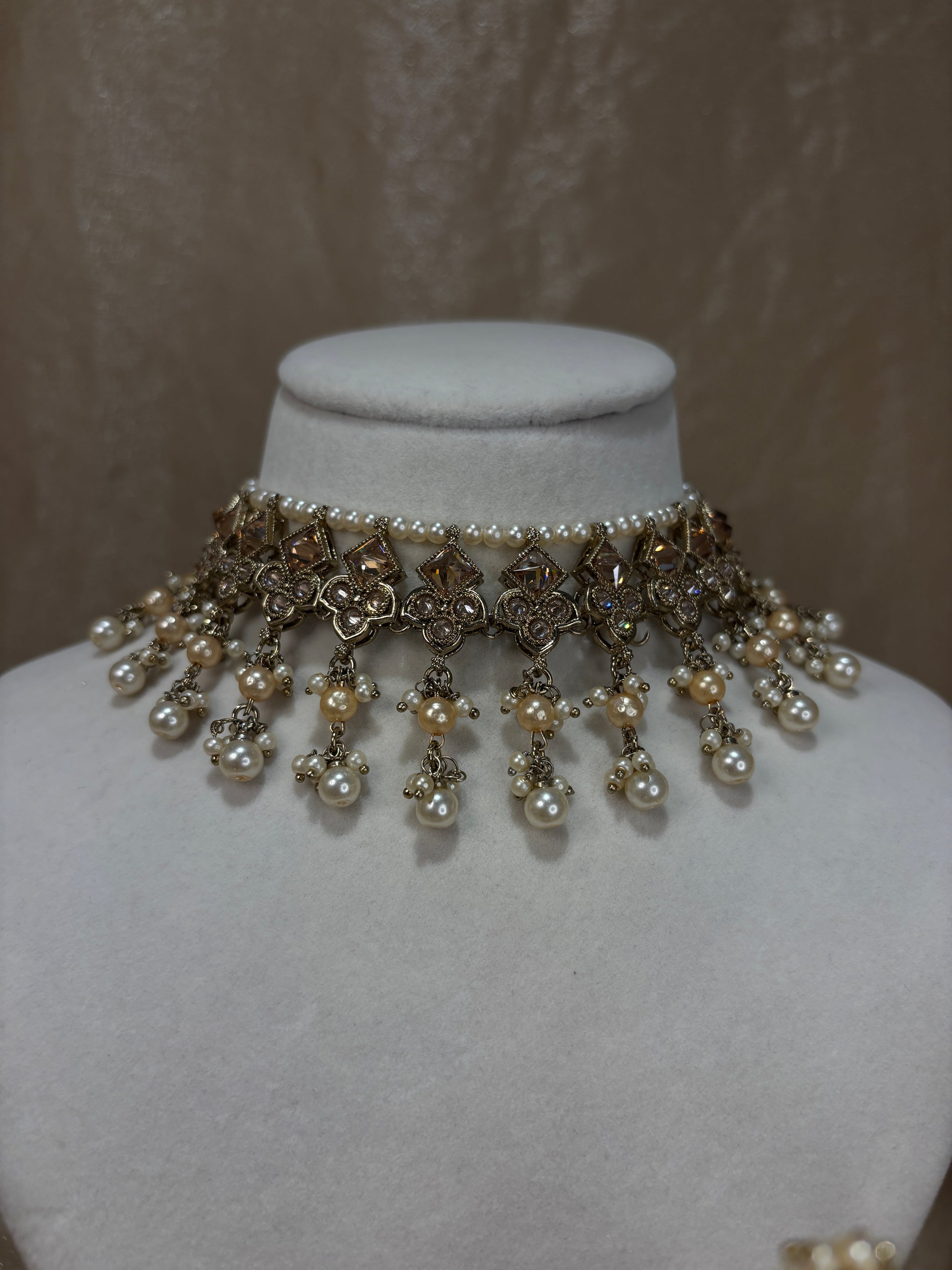 Gold set with small pearl details; can be worn as a necklace and choker