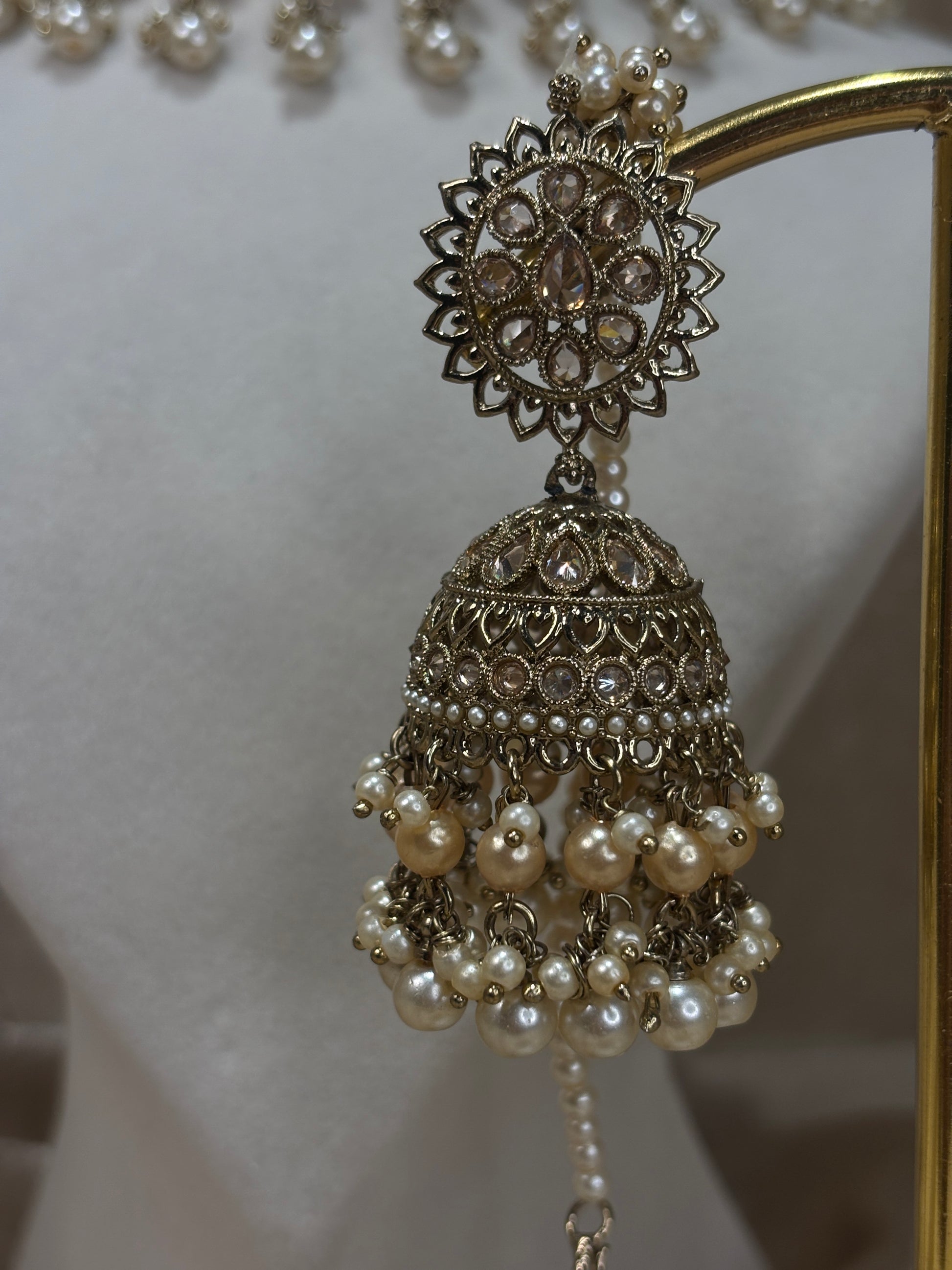 comes with jhumki earrings (With over the ear sahare) and oversized tikka