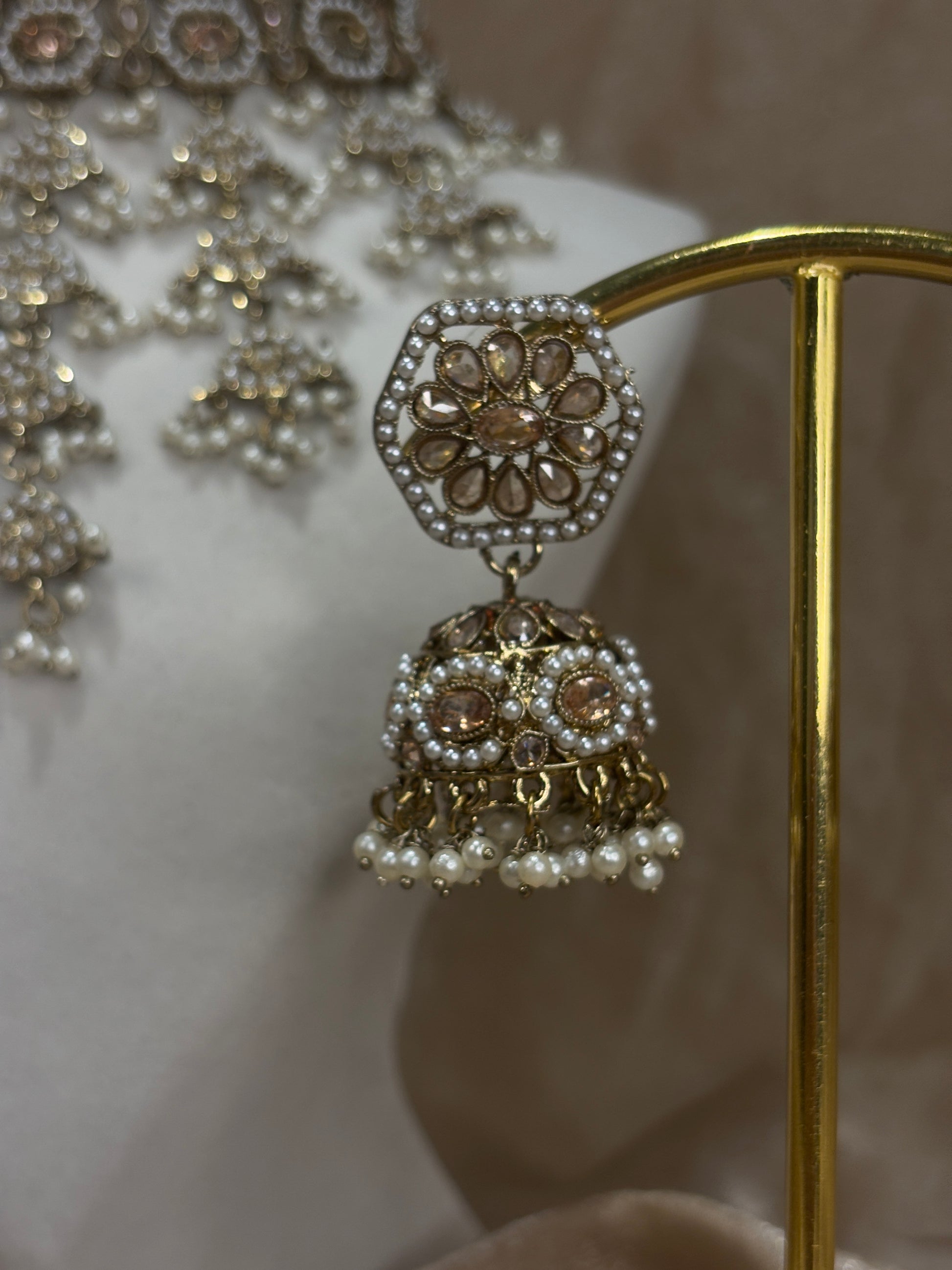 Gold choker in v-shape design with pearl details; comes with jhumki and tikka