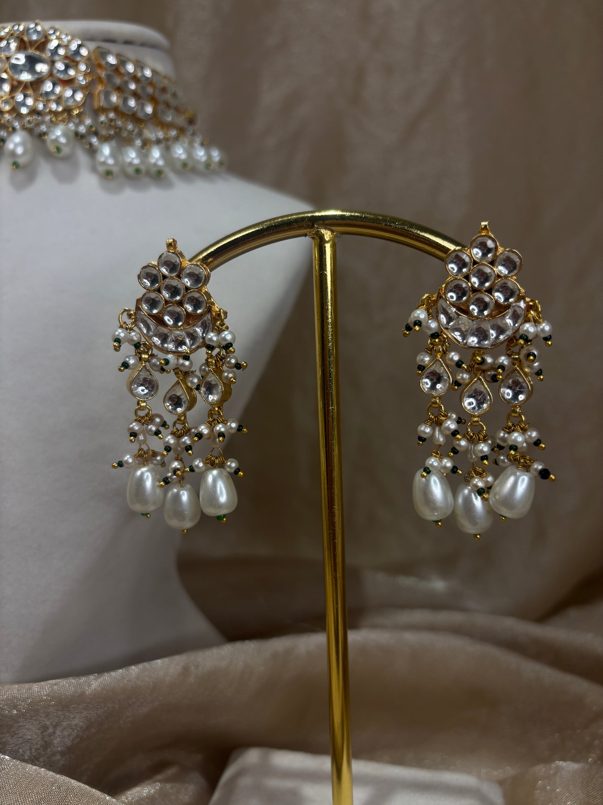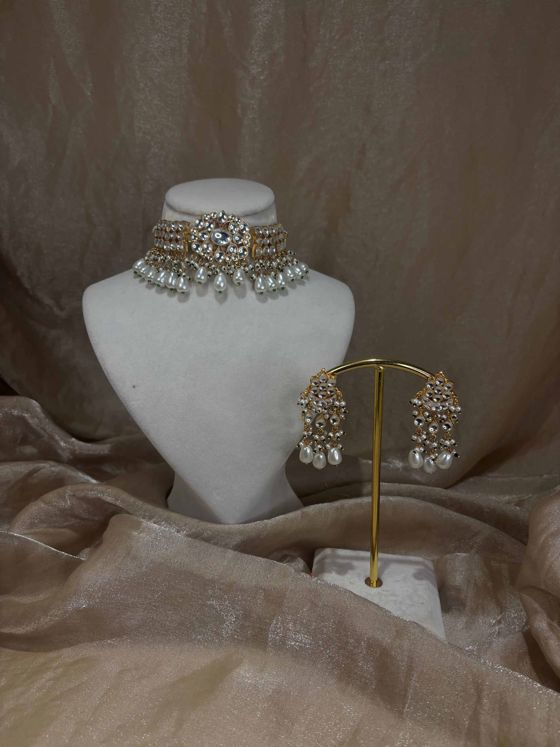 22k gold plated ahmedabadi pachi kundan gold choker with pearl details; comes with earrings
