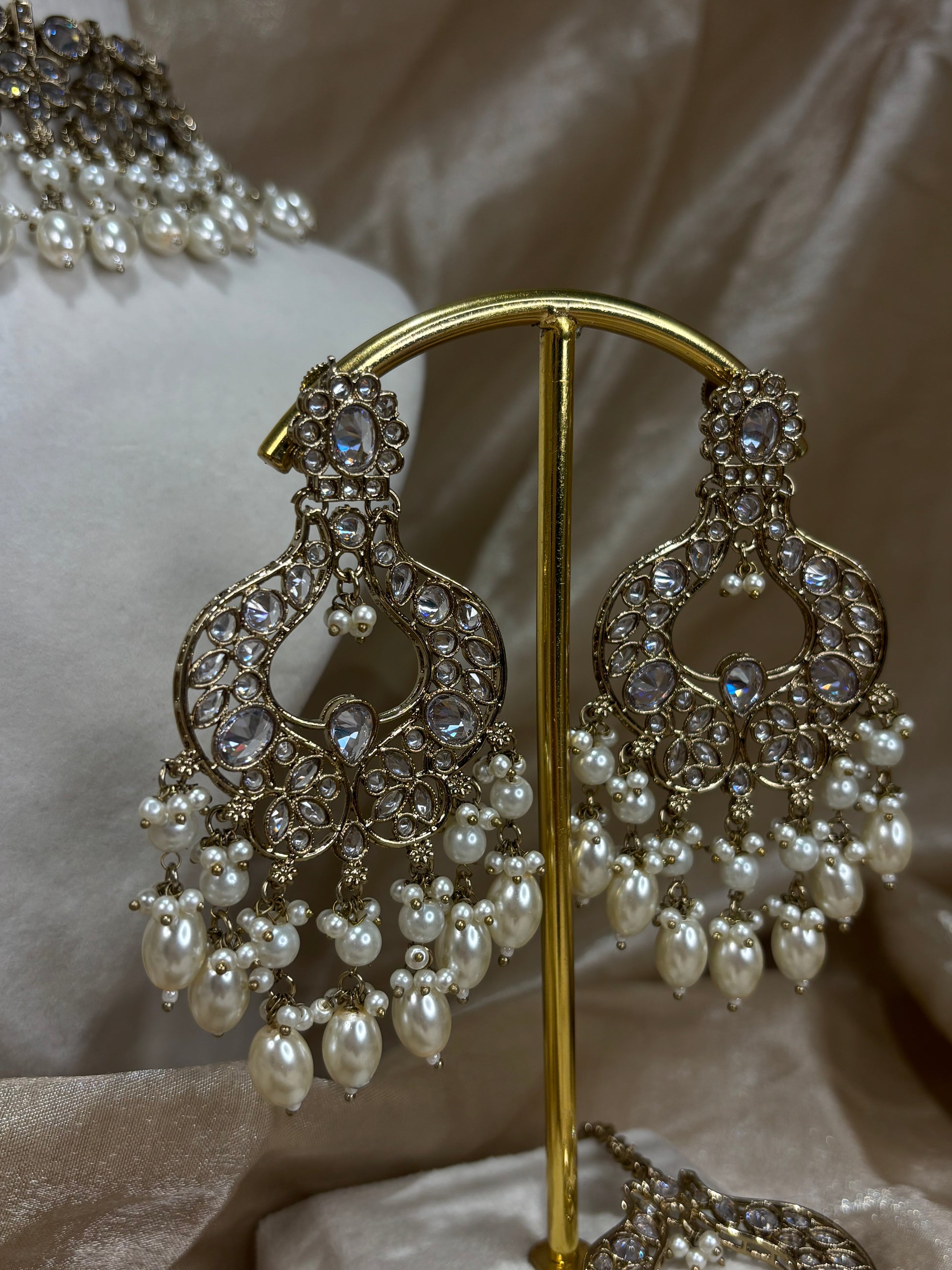 Gold choker set with pearl details; comes with unique negative space earrings and tikka.