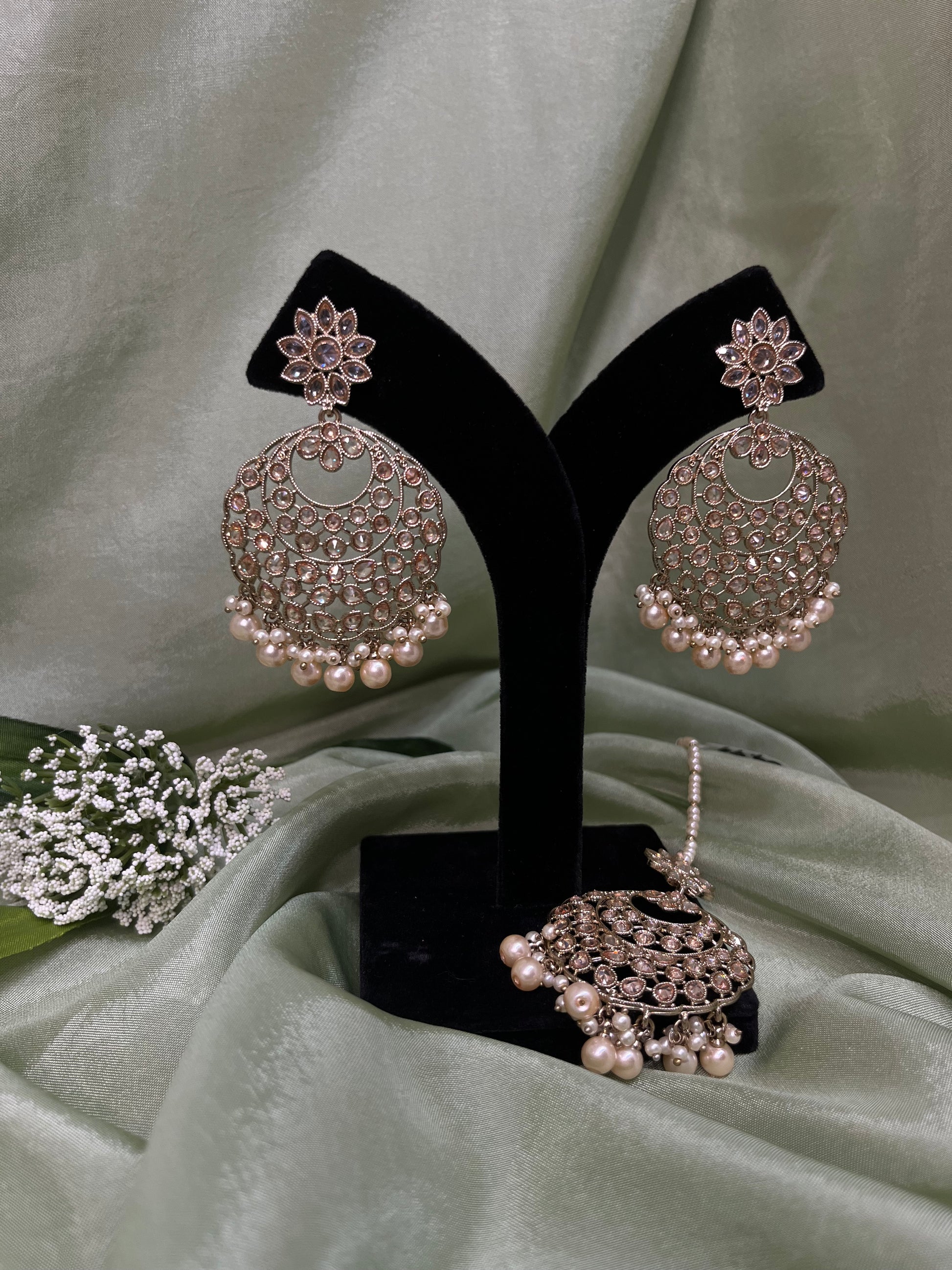 Gold earring/tikka set with pearl details in polki.
