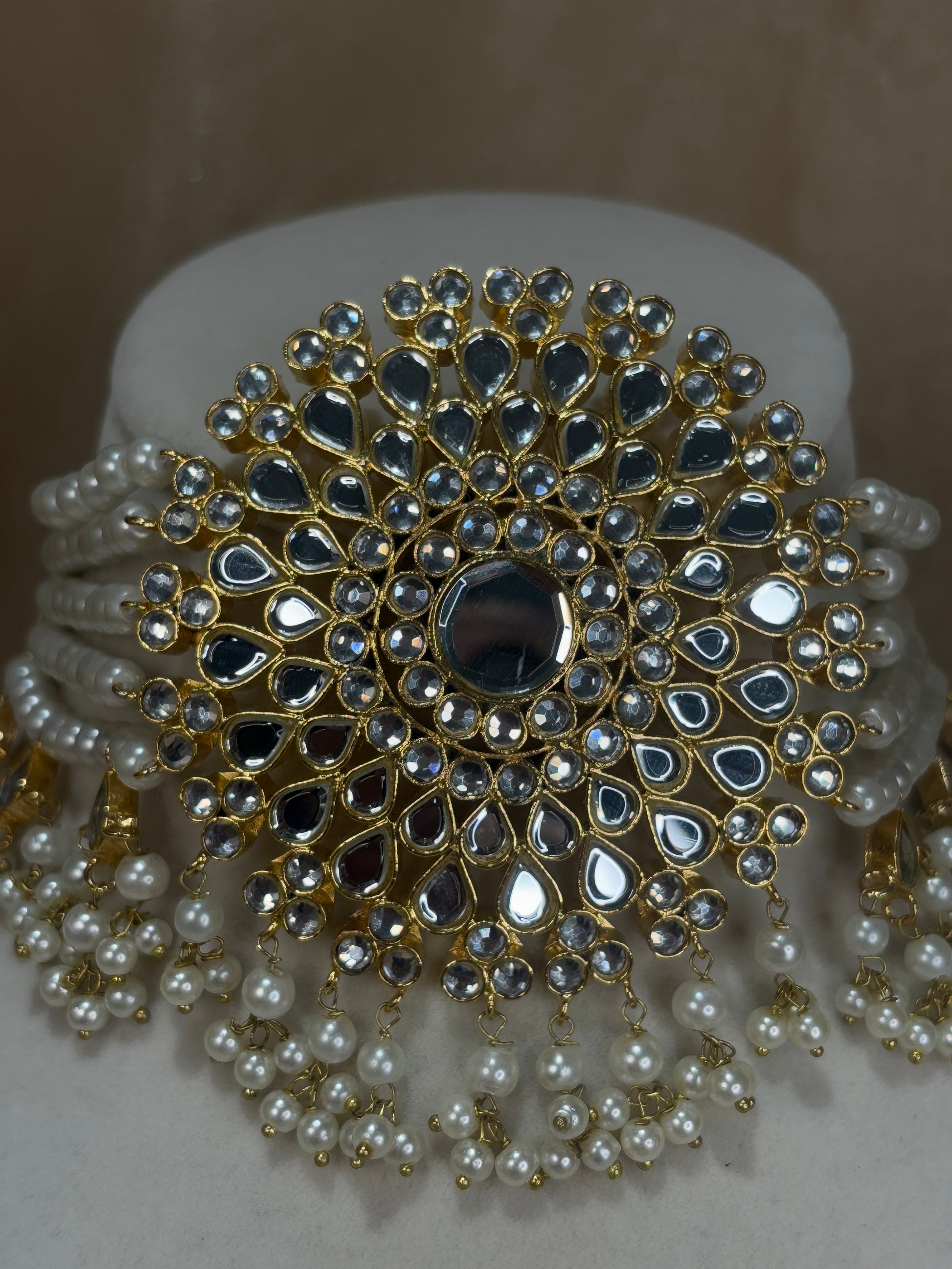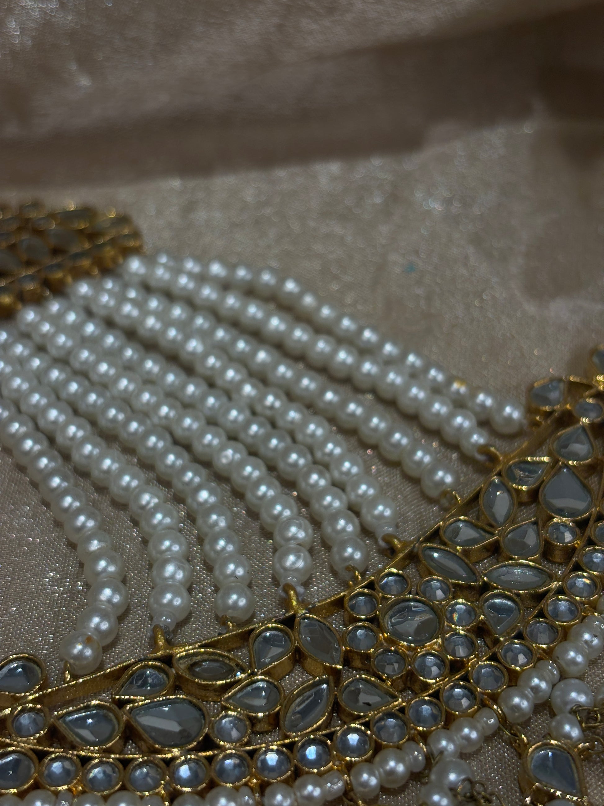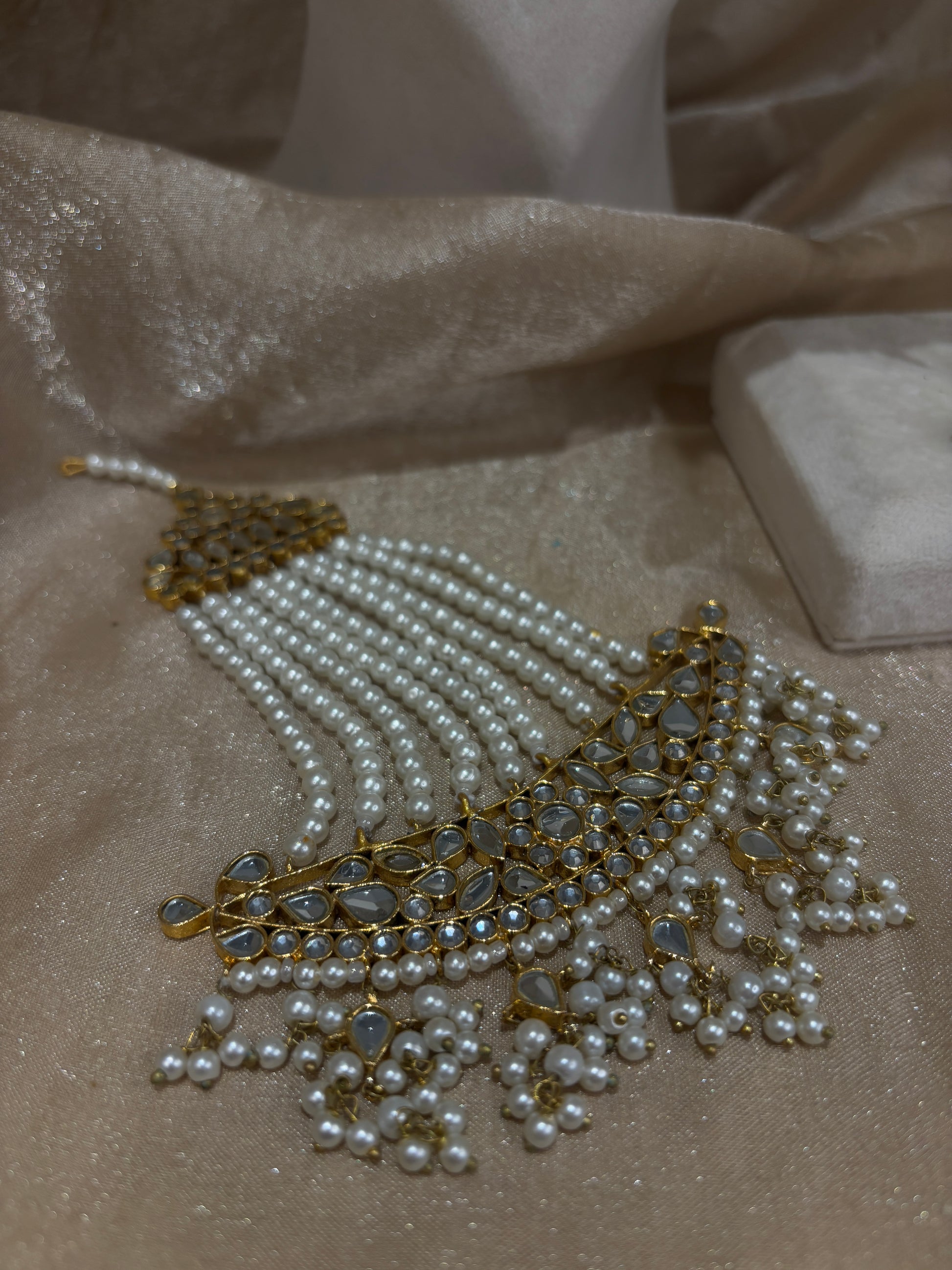 Gold 22k gold plated Pakistani farshi kundan set with pearl details; comes with studs (with over the ear sahare), tikka and passa