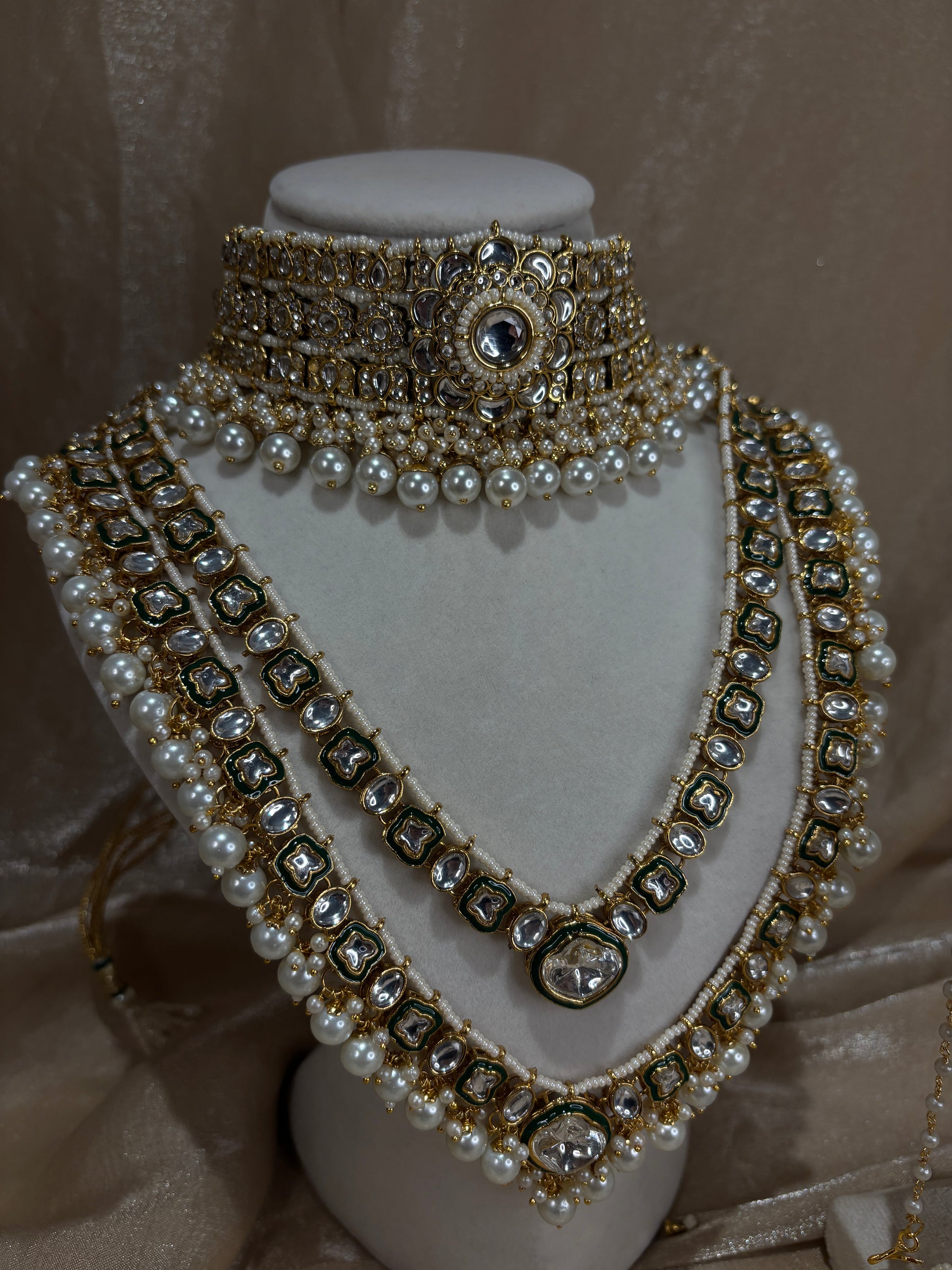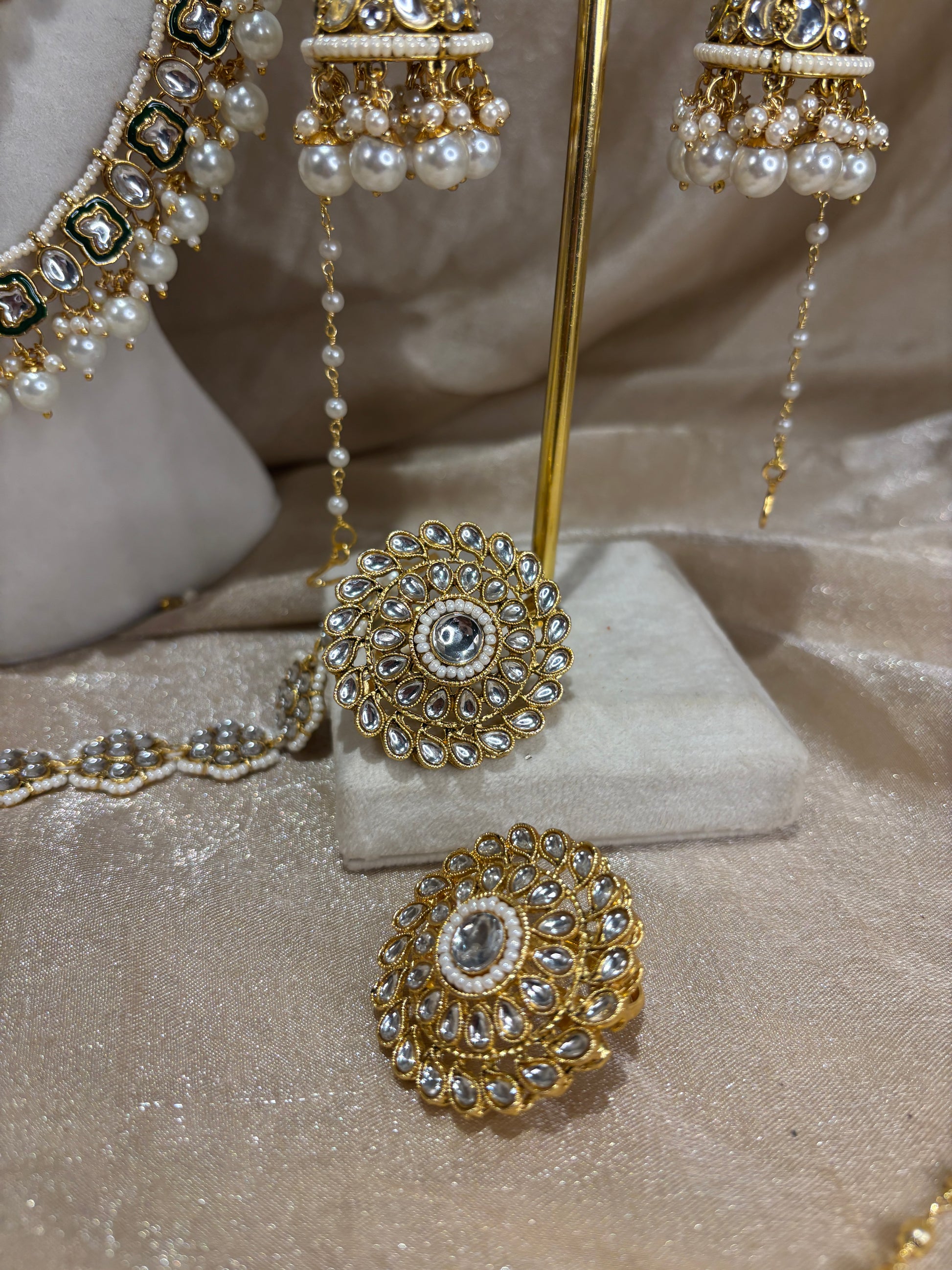 Gold kundan bridal set; comes with kundan choker, 2 layer kundan necklace, earrings, tikka, matha Patti, two statement rings and nose ring