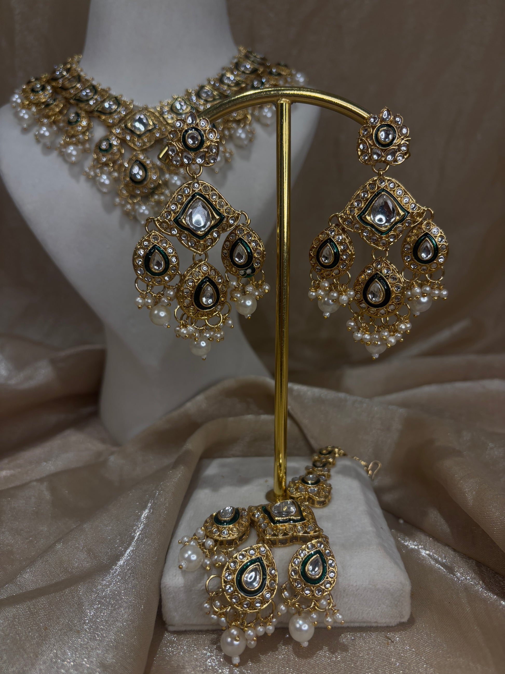 Gold kundan necklace set with pearl details; comes with earrings and tikka