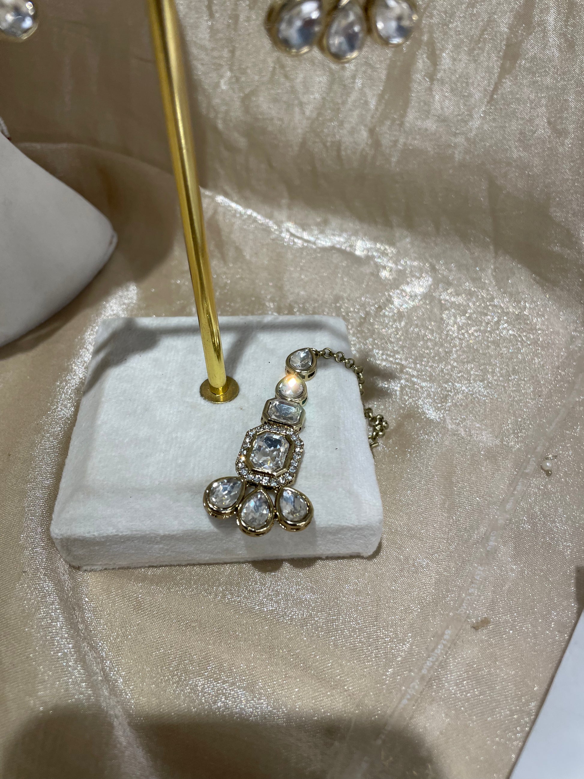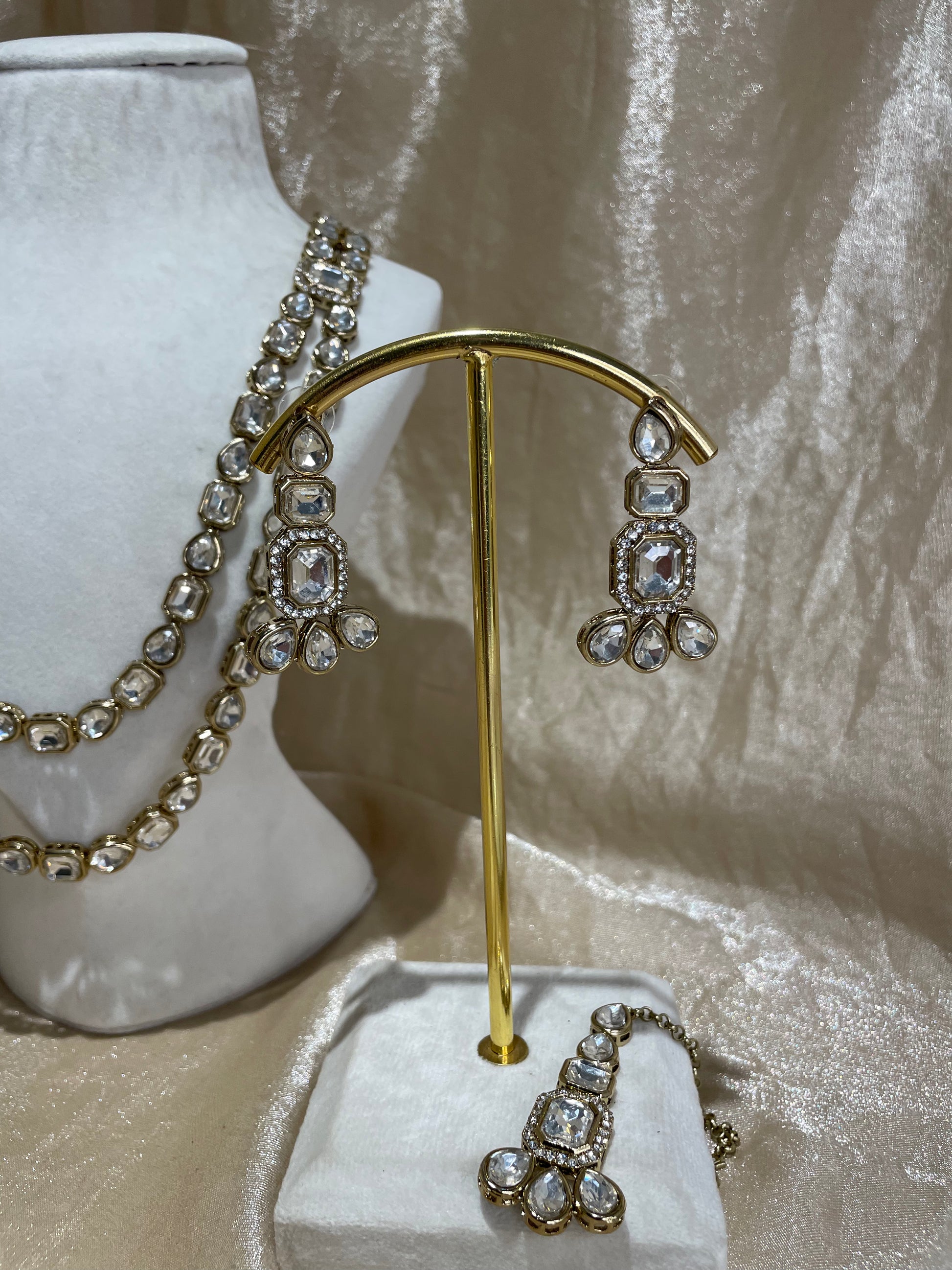 long gold kundan necklace set; comes with earrings and tikka