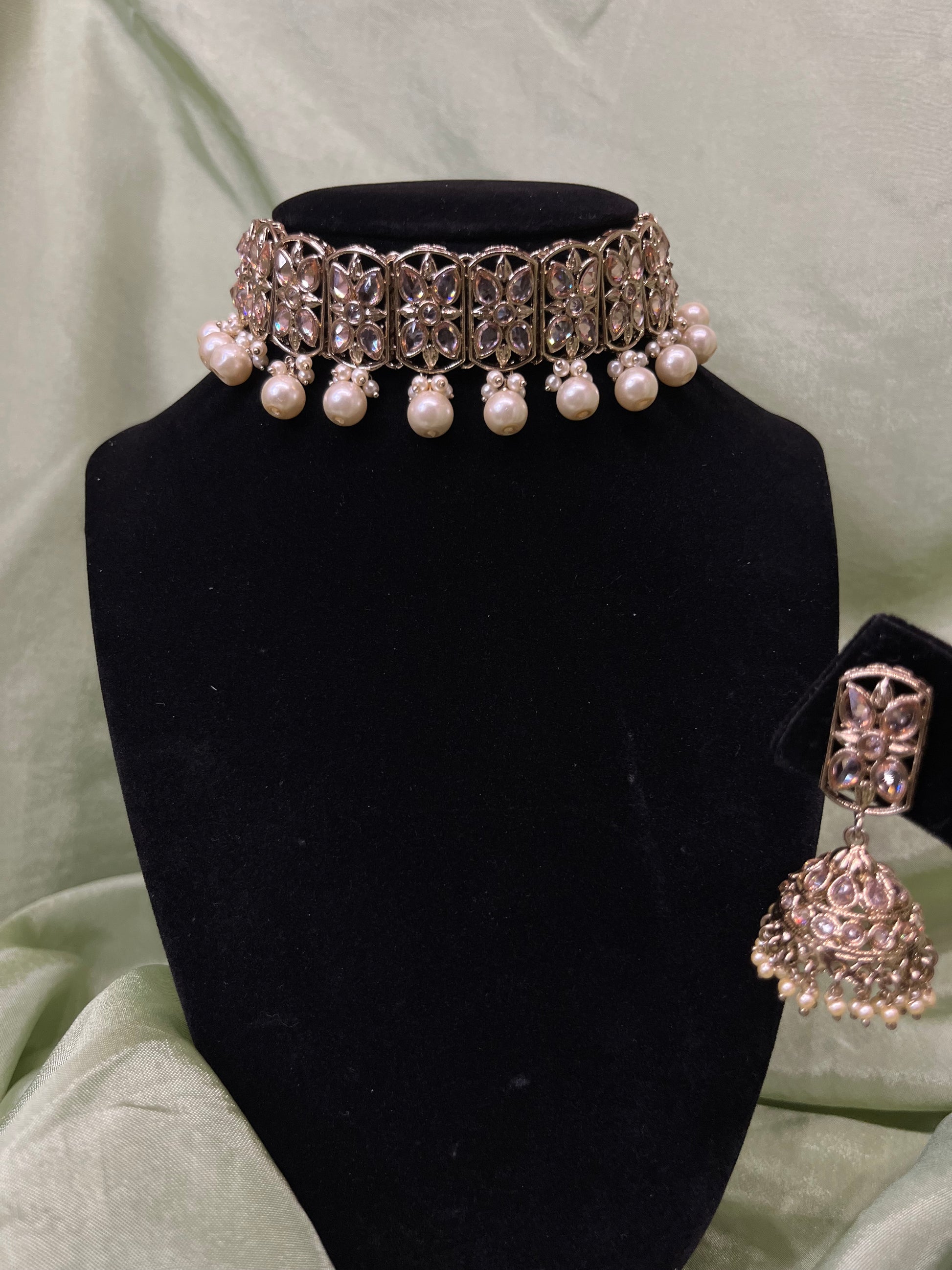 Gold choker with pearl details, comes with mini jhumkis and tikka; choker may also be worn as a necklace.
