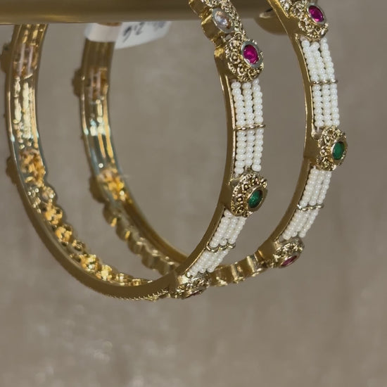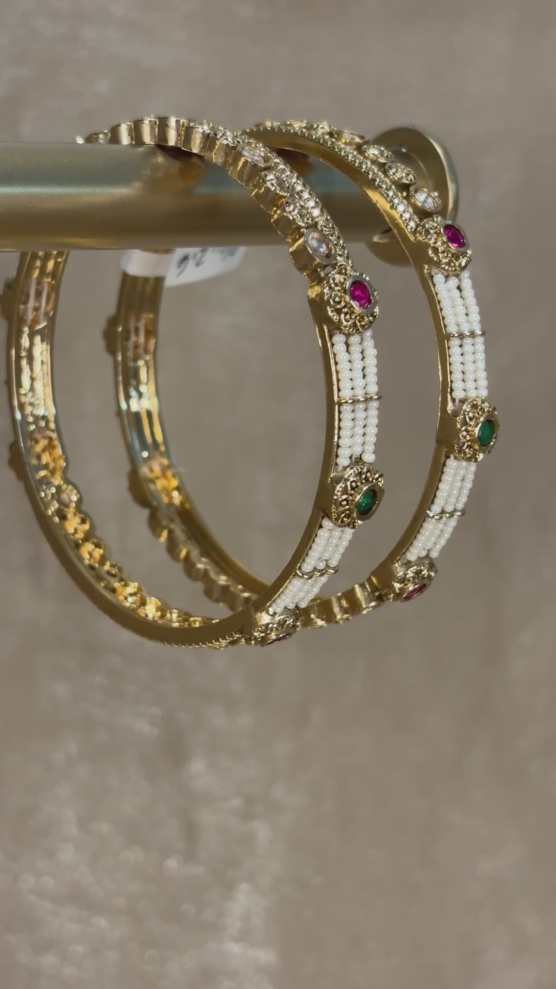 Gold plated kare iwth pearl details and accents of emerald green and hot pink; comes in a set of 2