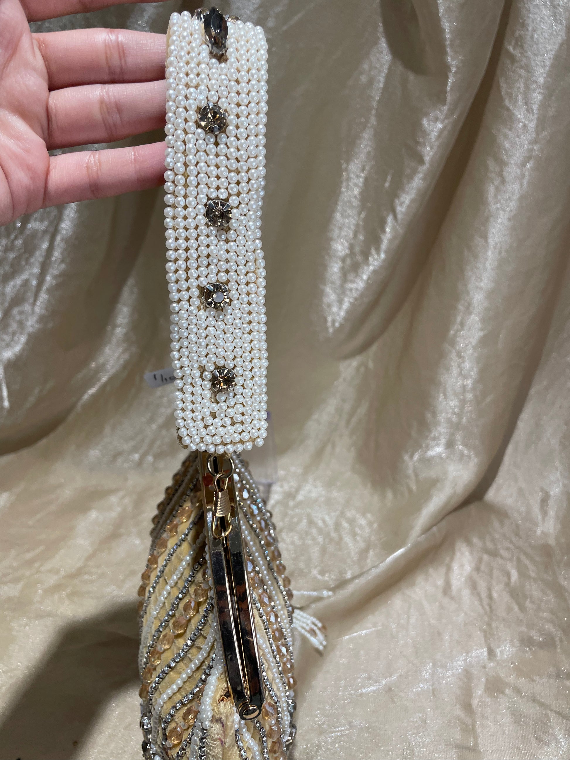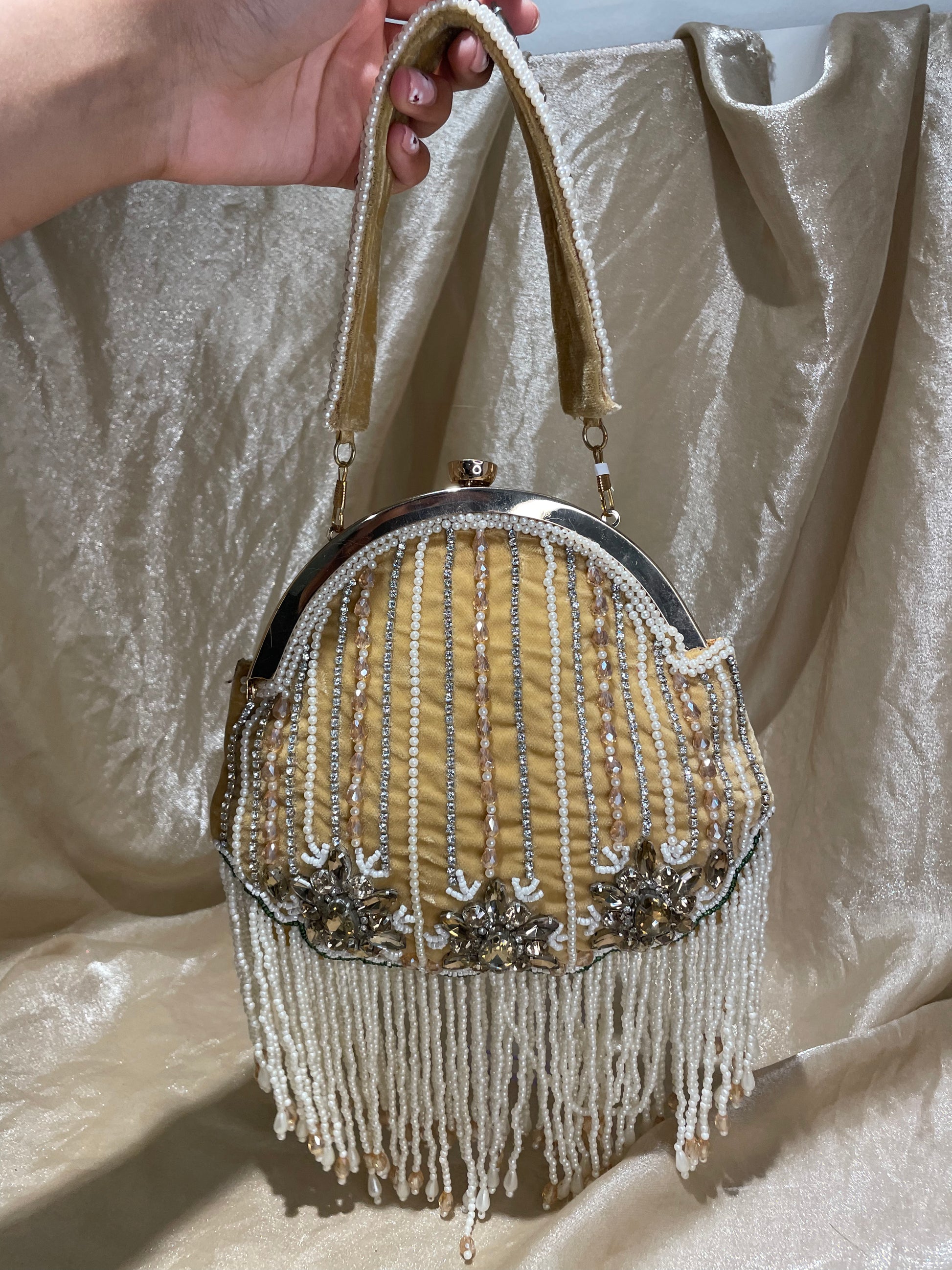 gold potli purse with detailed embroidery on front and back of purse, pearl fringe detail, embroidery on shoulder strap, and metal closure