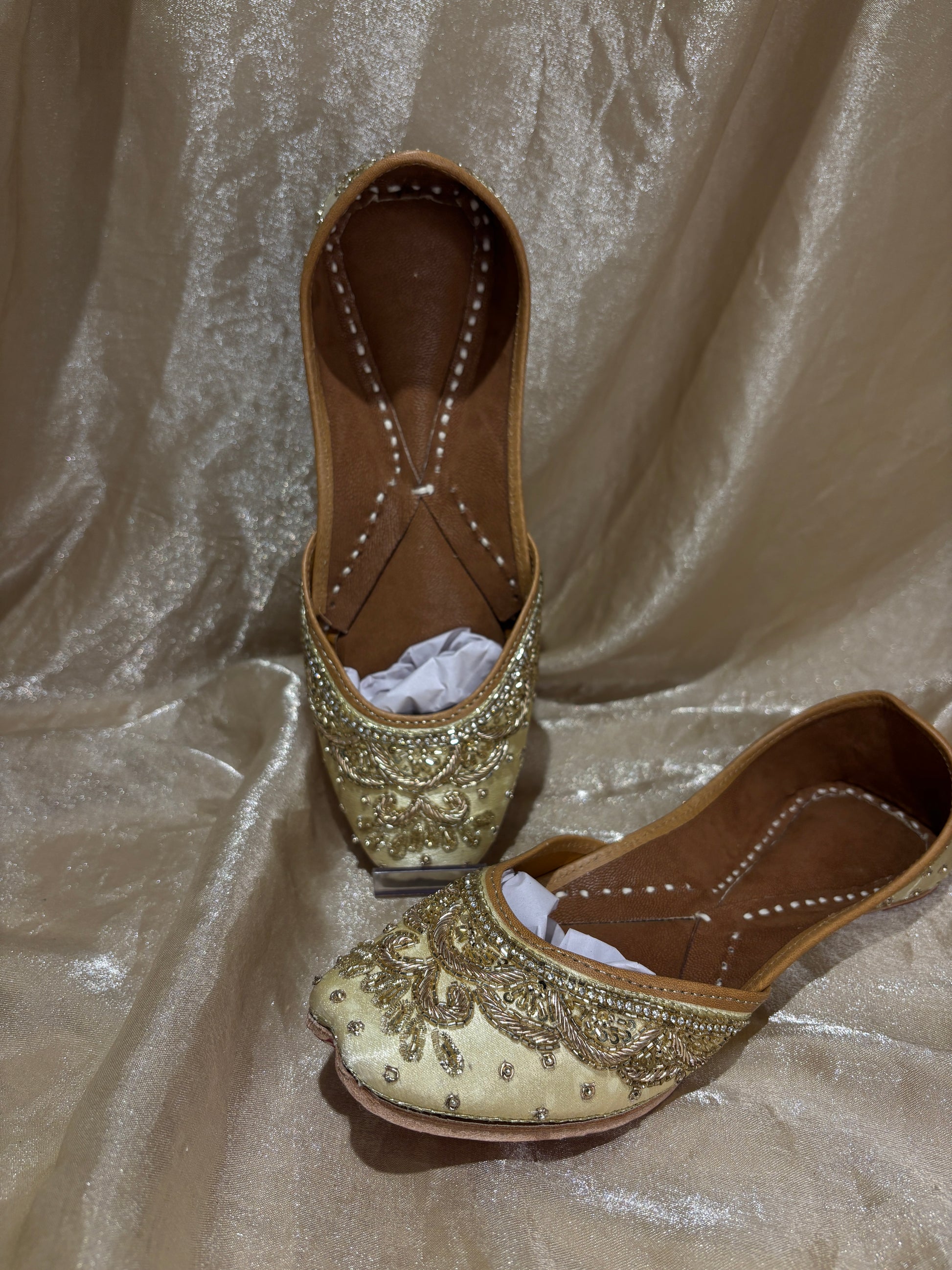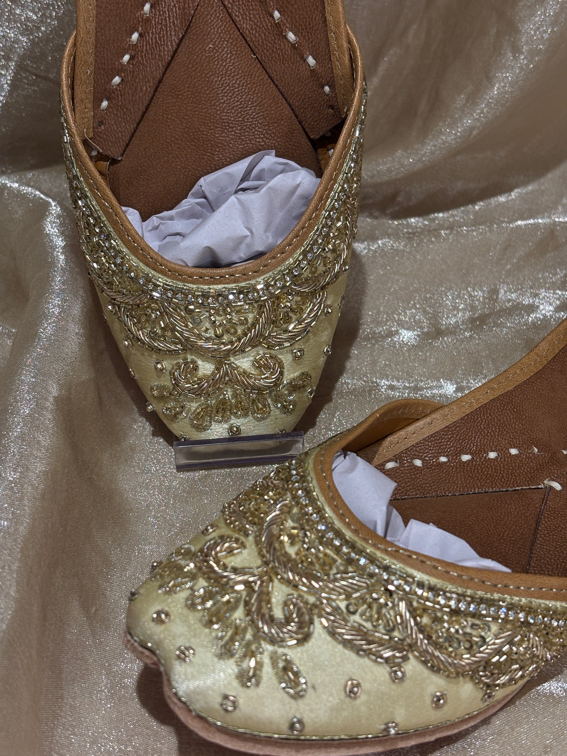 gold punjabi jutti with detailed embroidery; all juttis come with double padding for ultimate comfort