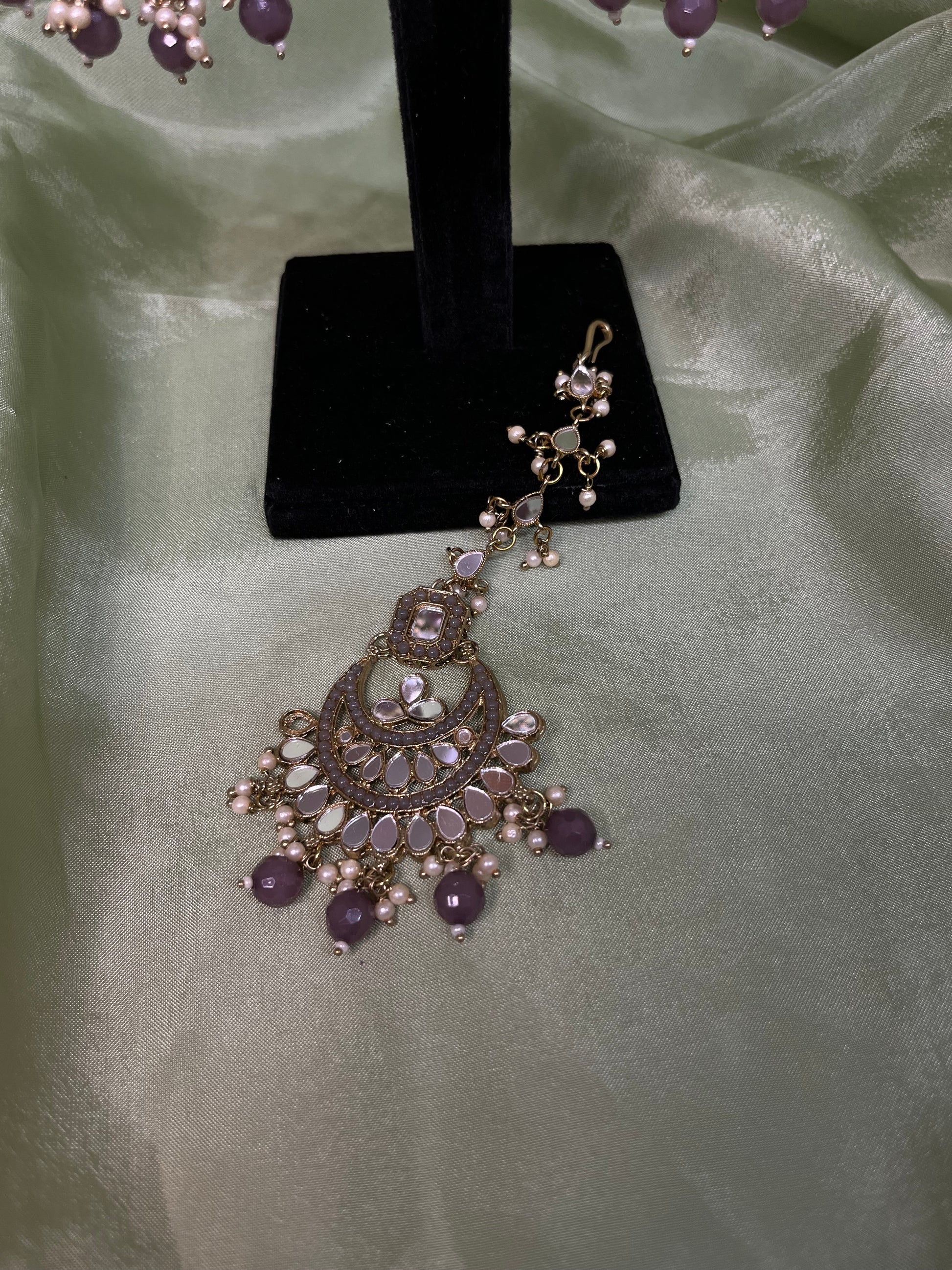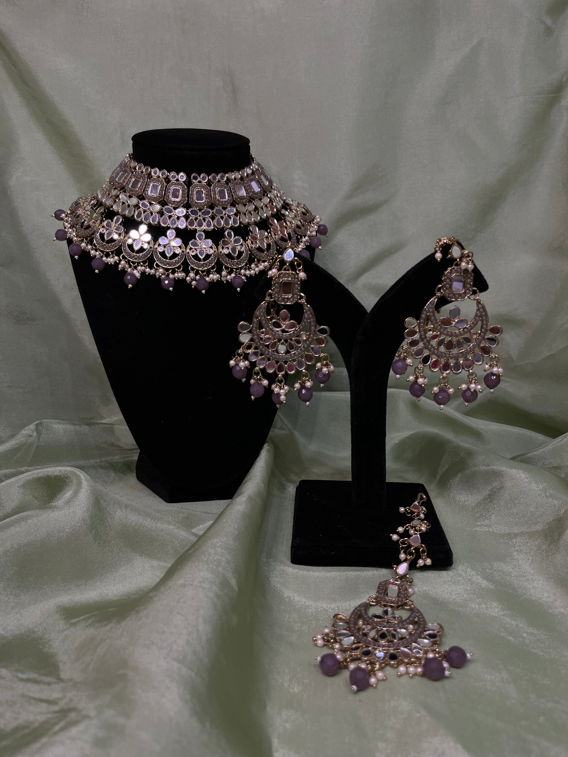 Heavy mirror work necklace set in gray; comes with Sahara earrings and tikka.