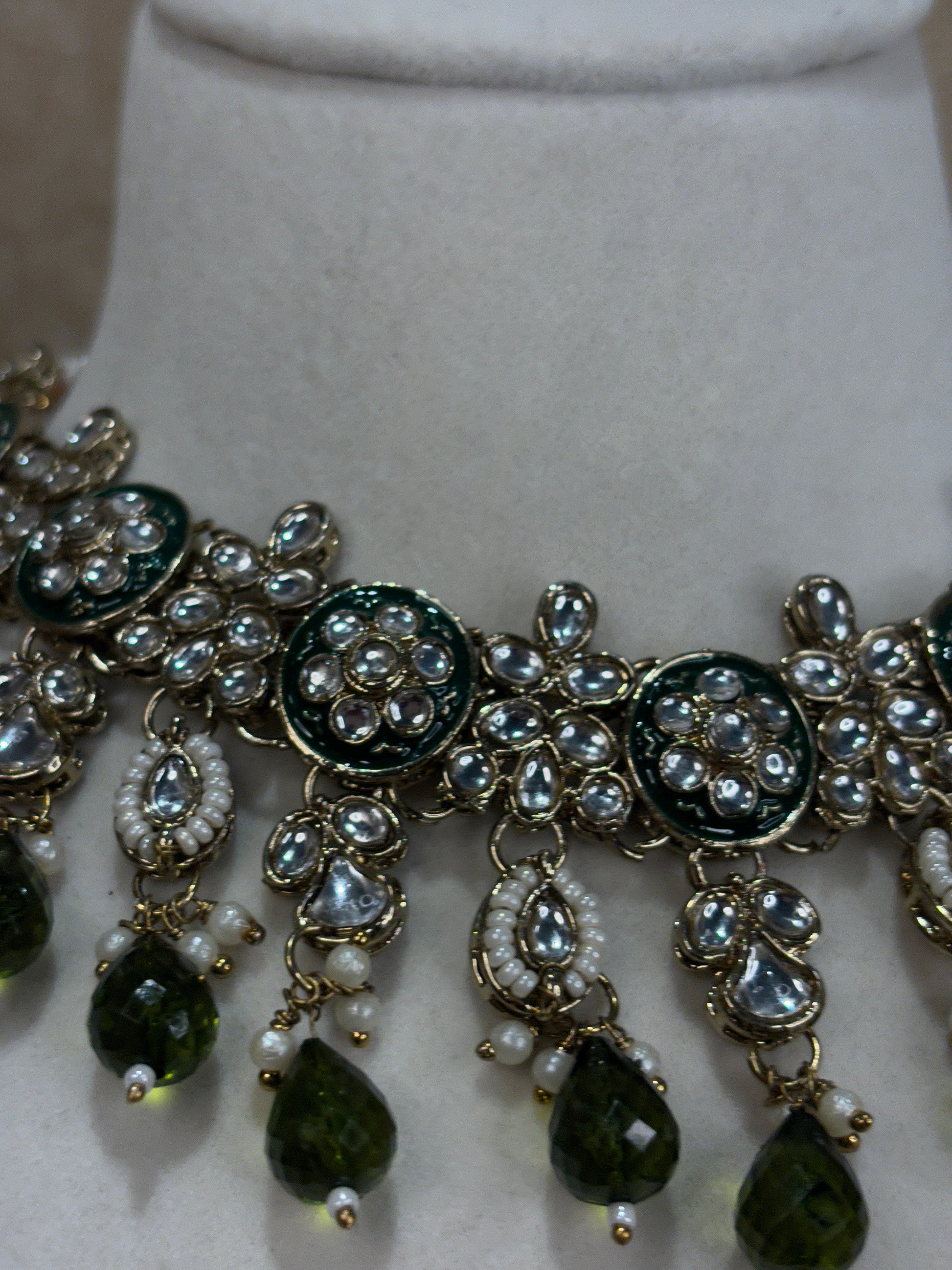 Mehndi green/moss green white kundan necklace set with emerald green accents; comes with earrings and tikka