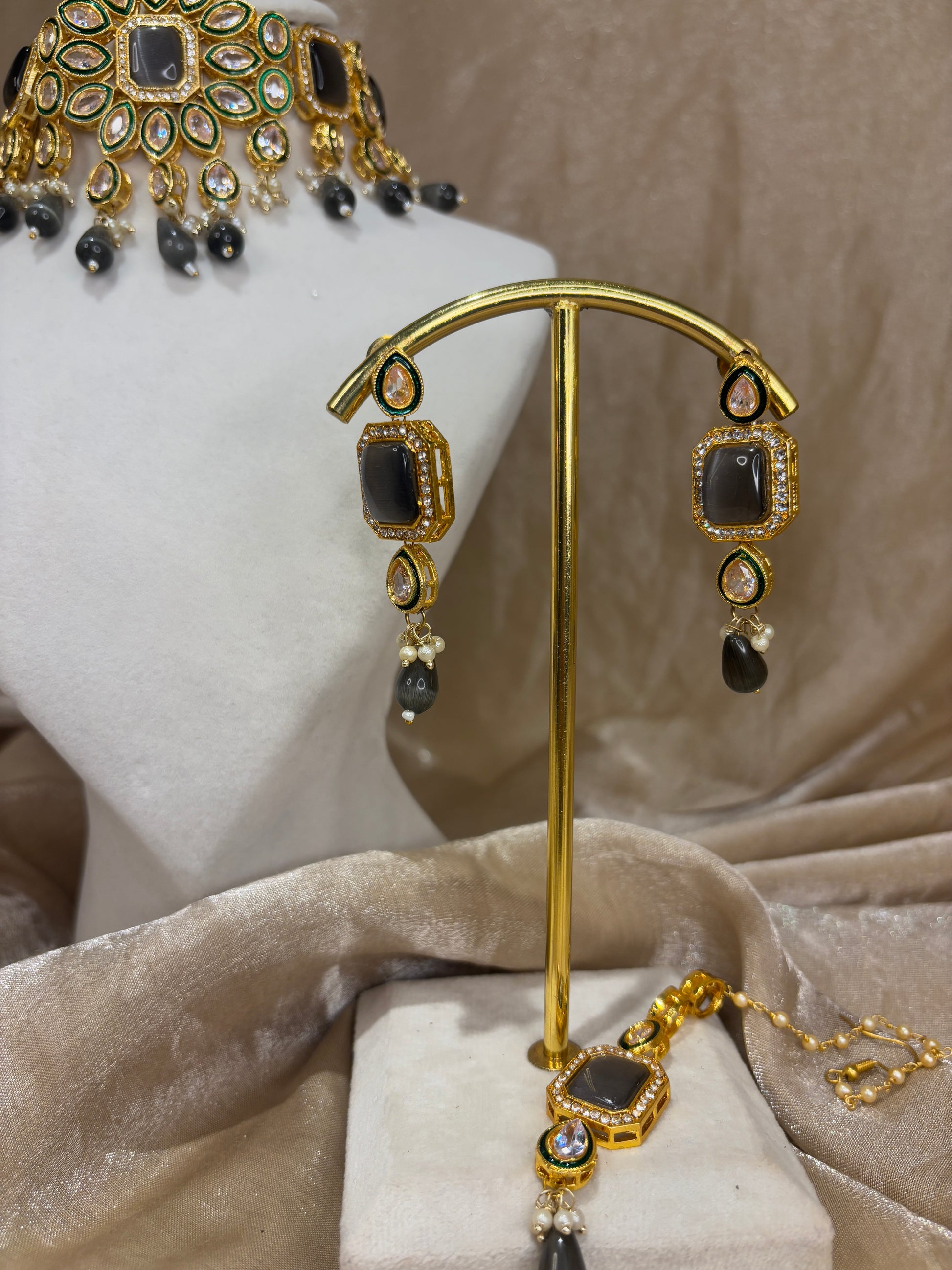 Gray Mona Lisa choker set with pearl details; comes with earrings and tikka
