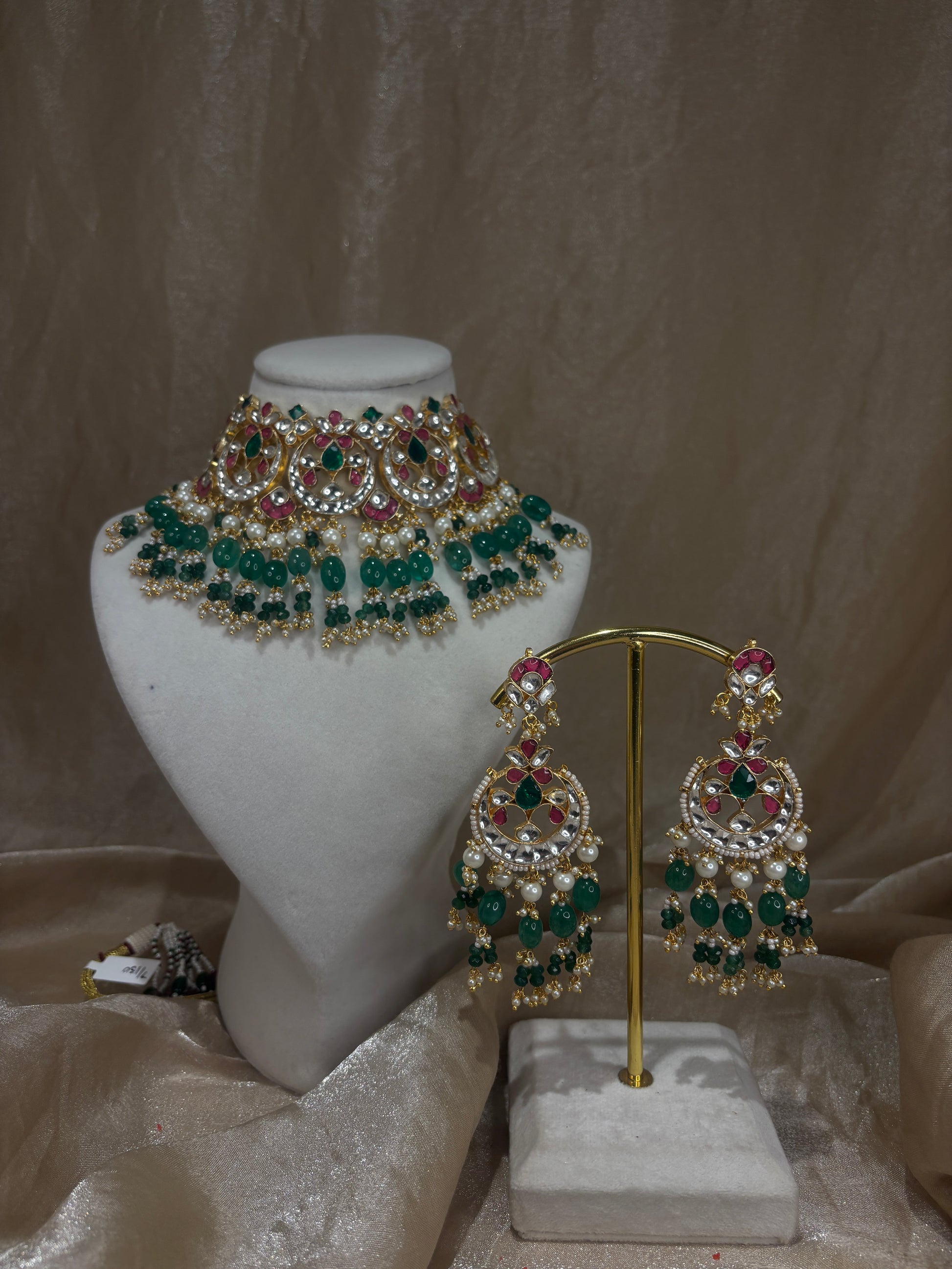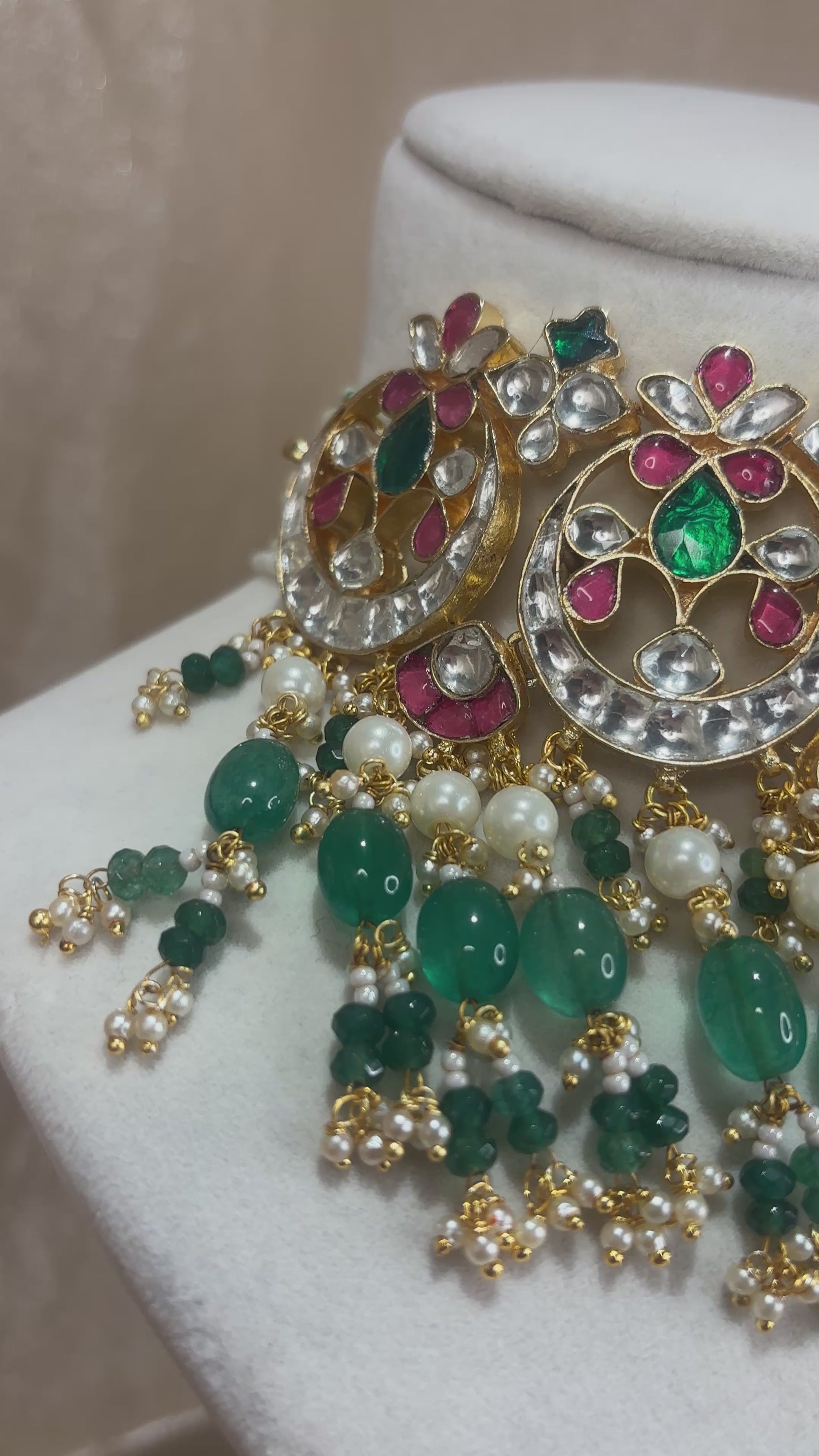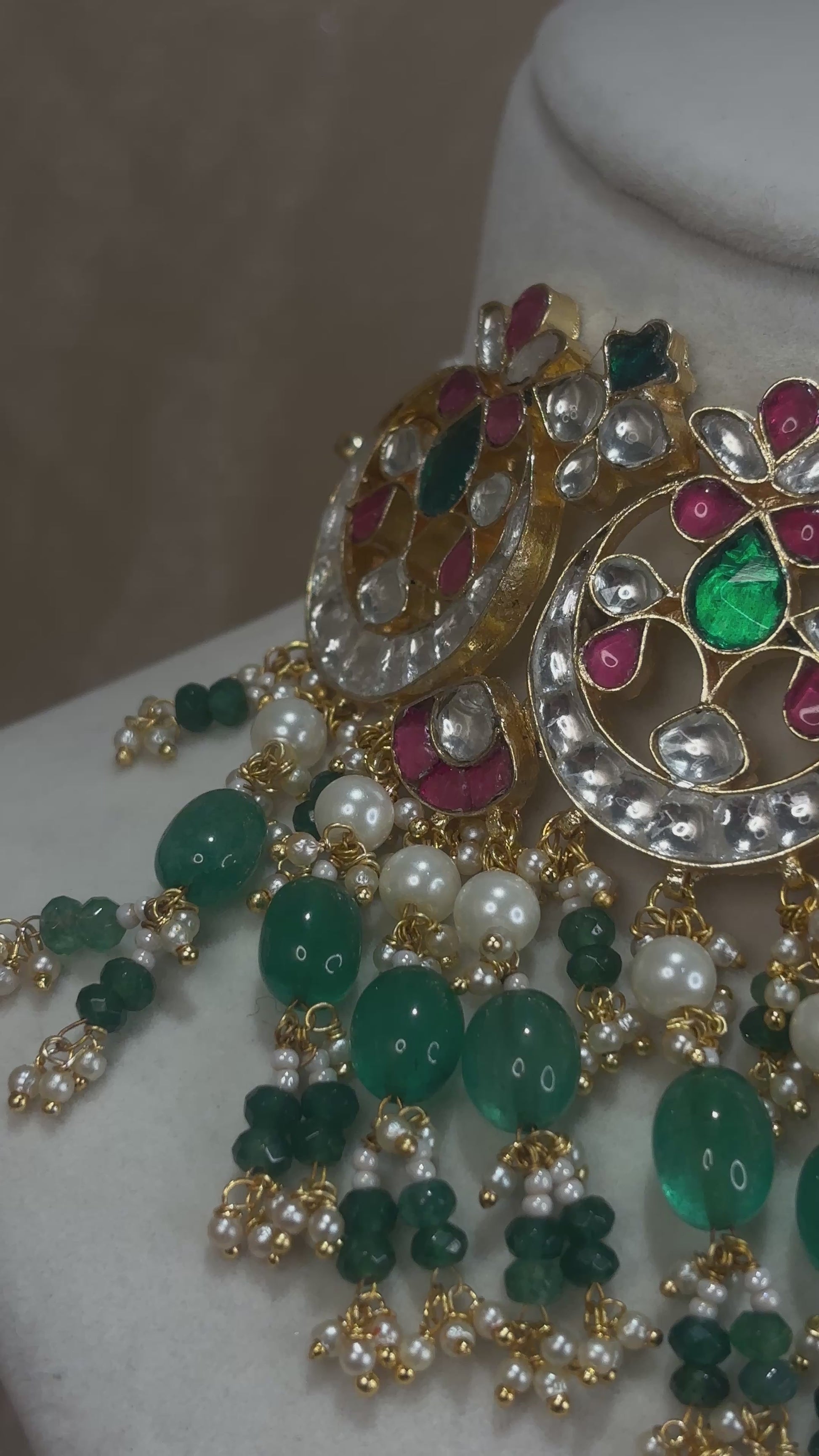 Heavy emerald green and hot pink 22k gold plated ahmedbadi pachi kundan choker with pearl details; comes with earrings