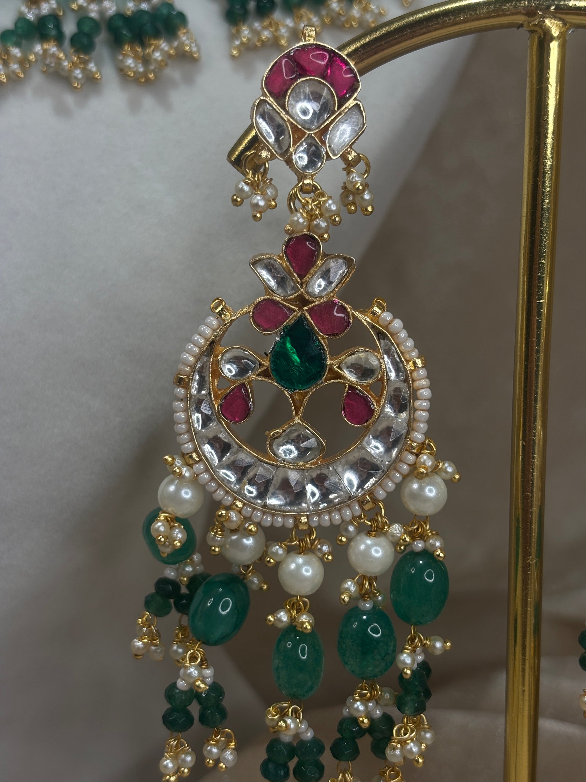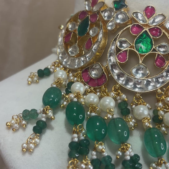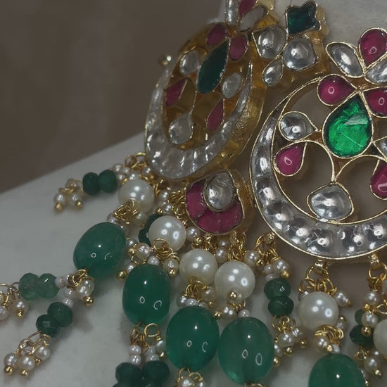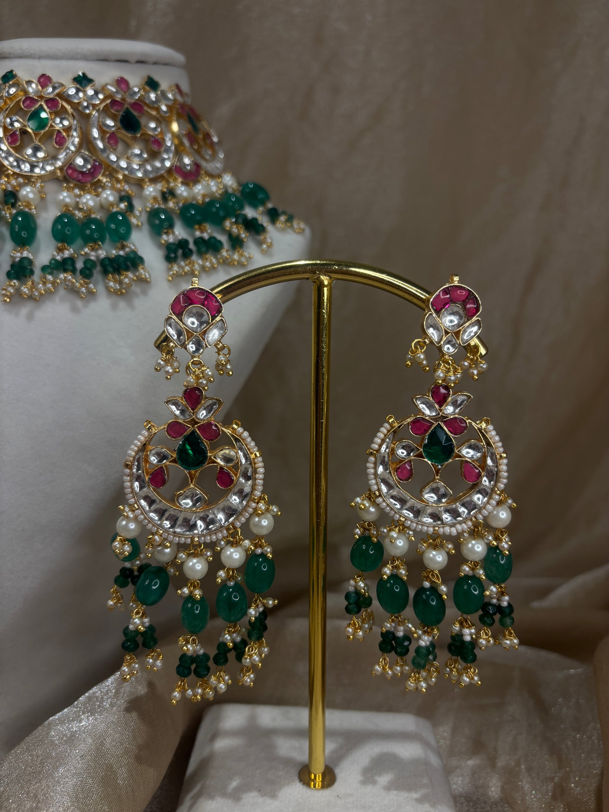 Heavy emerald green and hot pink 22k gold plated ahmedbadi pachi kundan choker with pearl details; comes with earrings