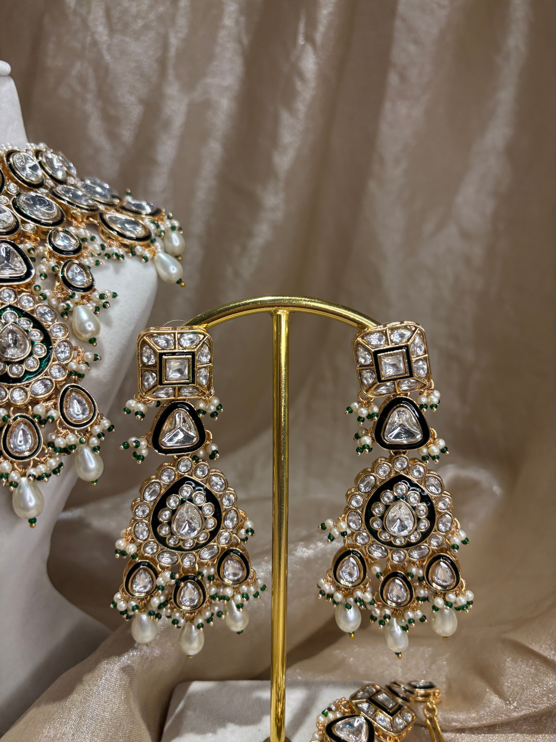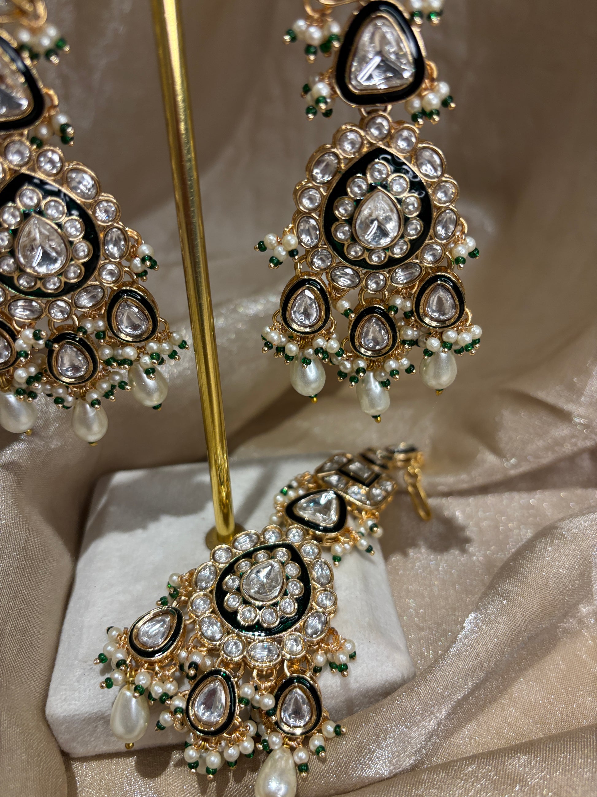 Heavy white pearl detailed gold kundan choker set; comes with earrings and tikka