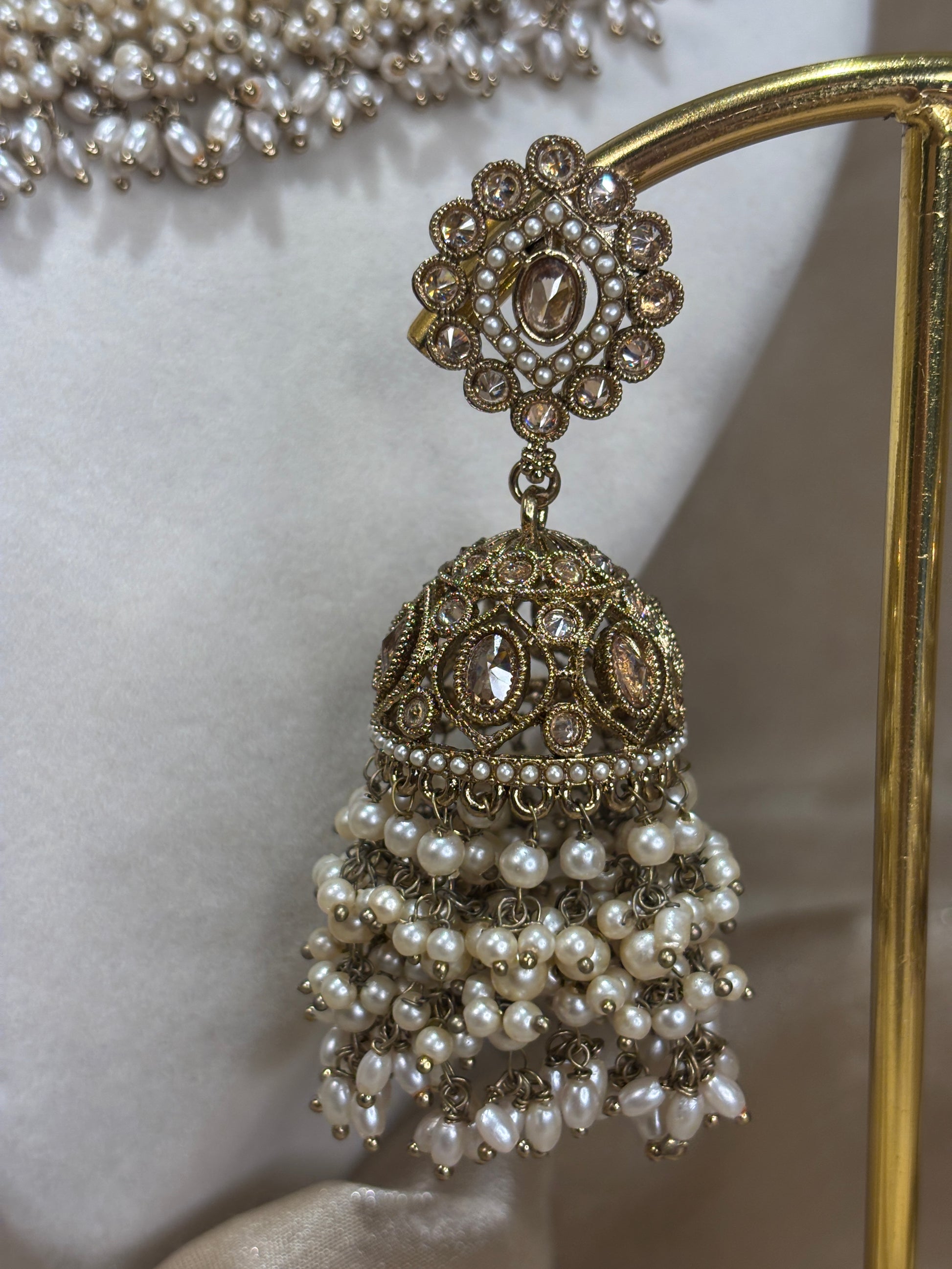 Heavy gold necklace set with intricate pearl details; comes with jhumki and tikka