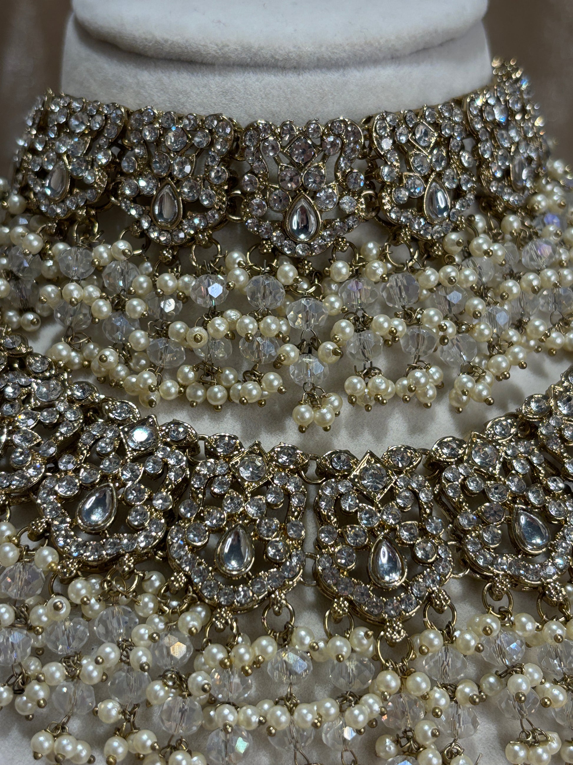 Heavy white/gold double layer set; comes with choker, necklace, passa, earrings and tikka