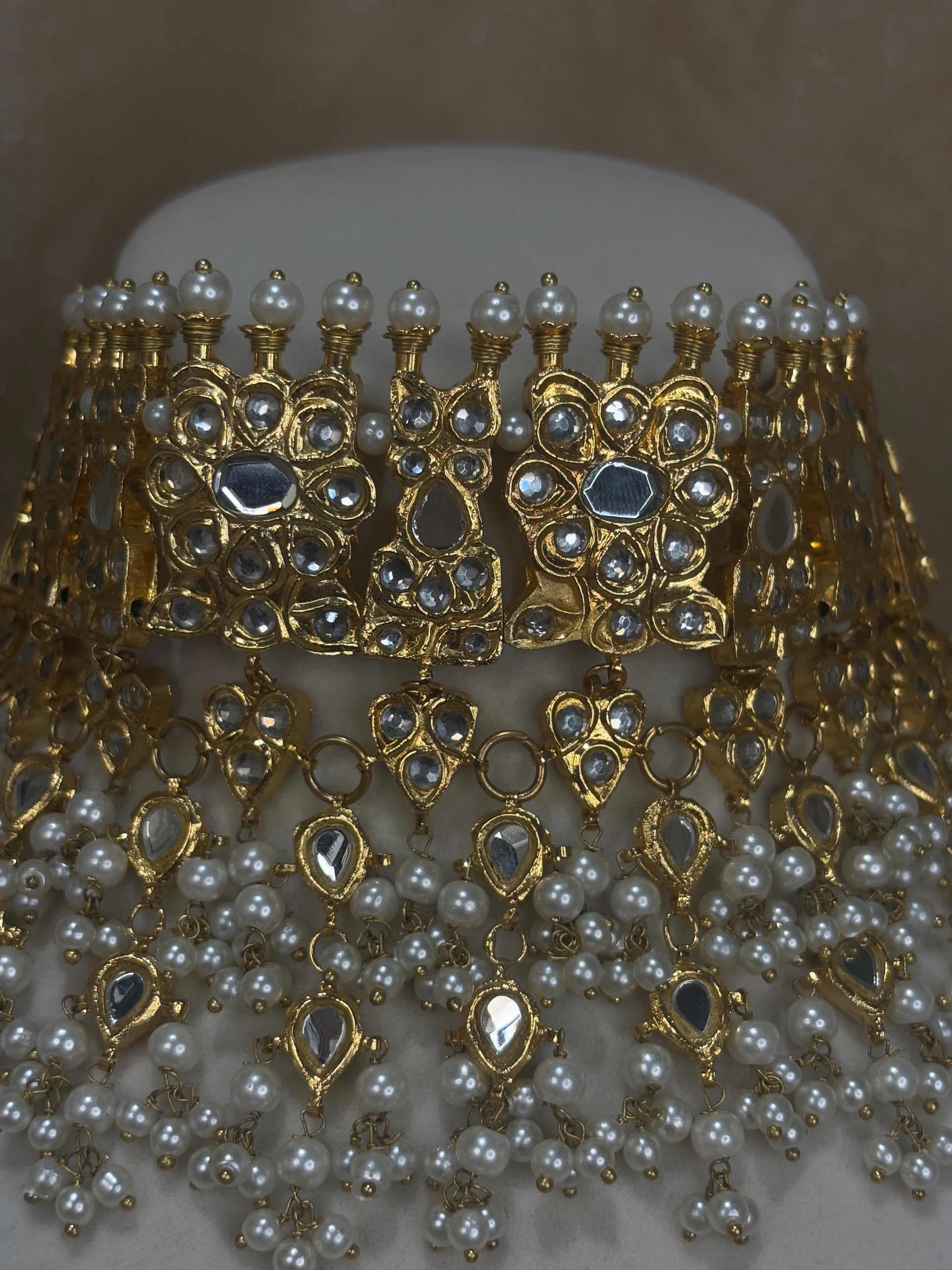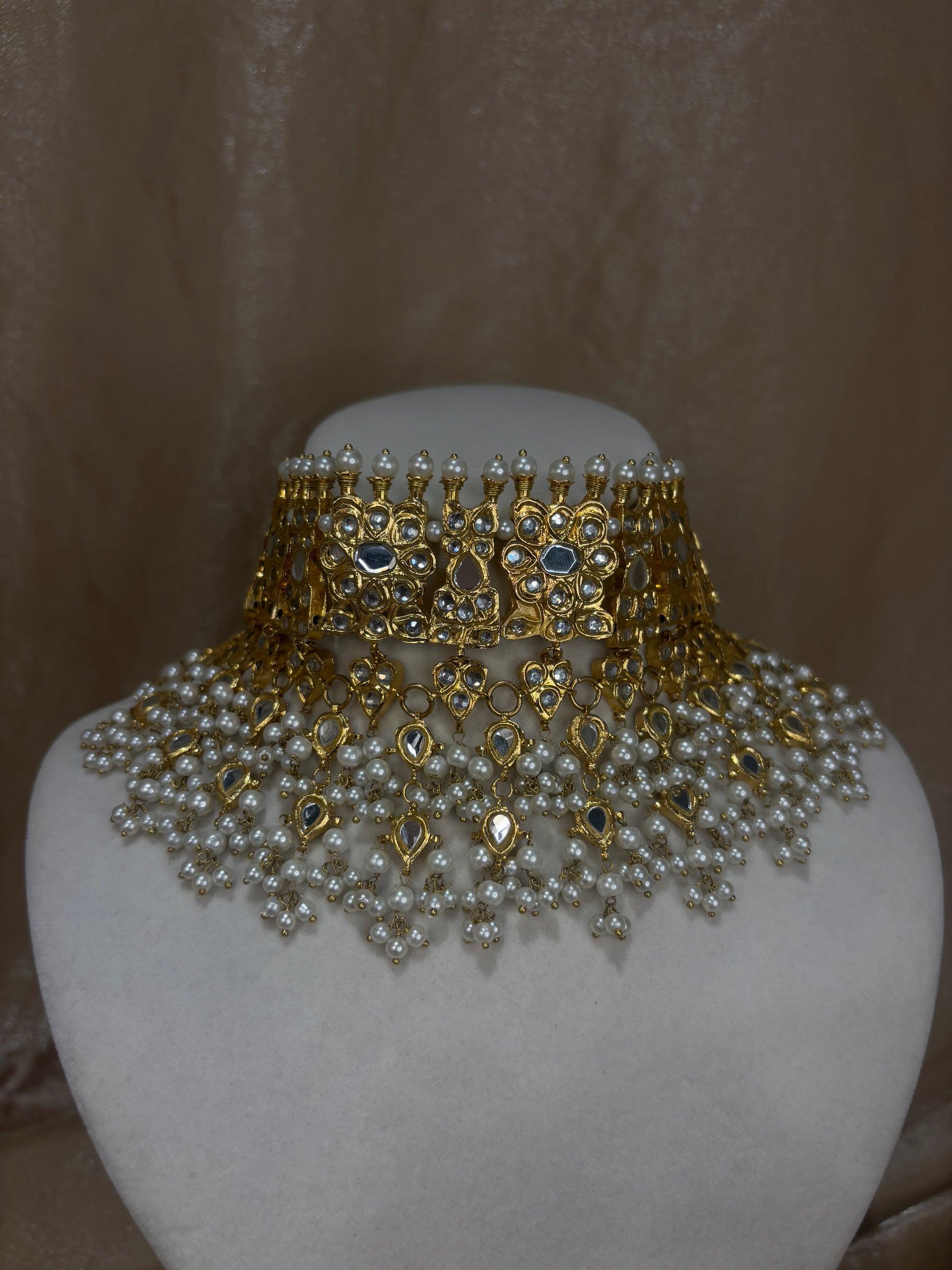 Heavy gold 22k gold plated Pakistani thappa kundan choker with pearl details; comes with v-shape earrings (with over the ear pearl sahare)