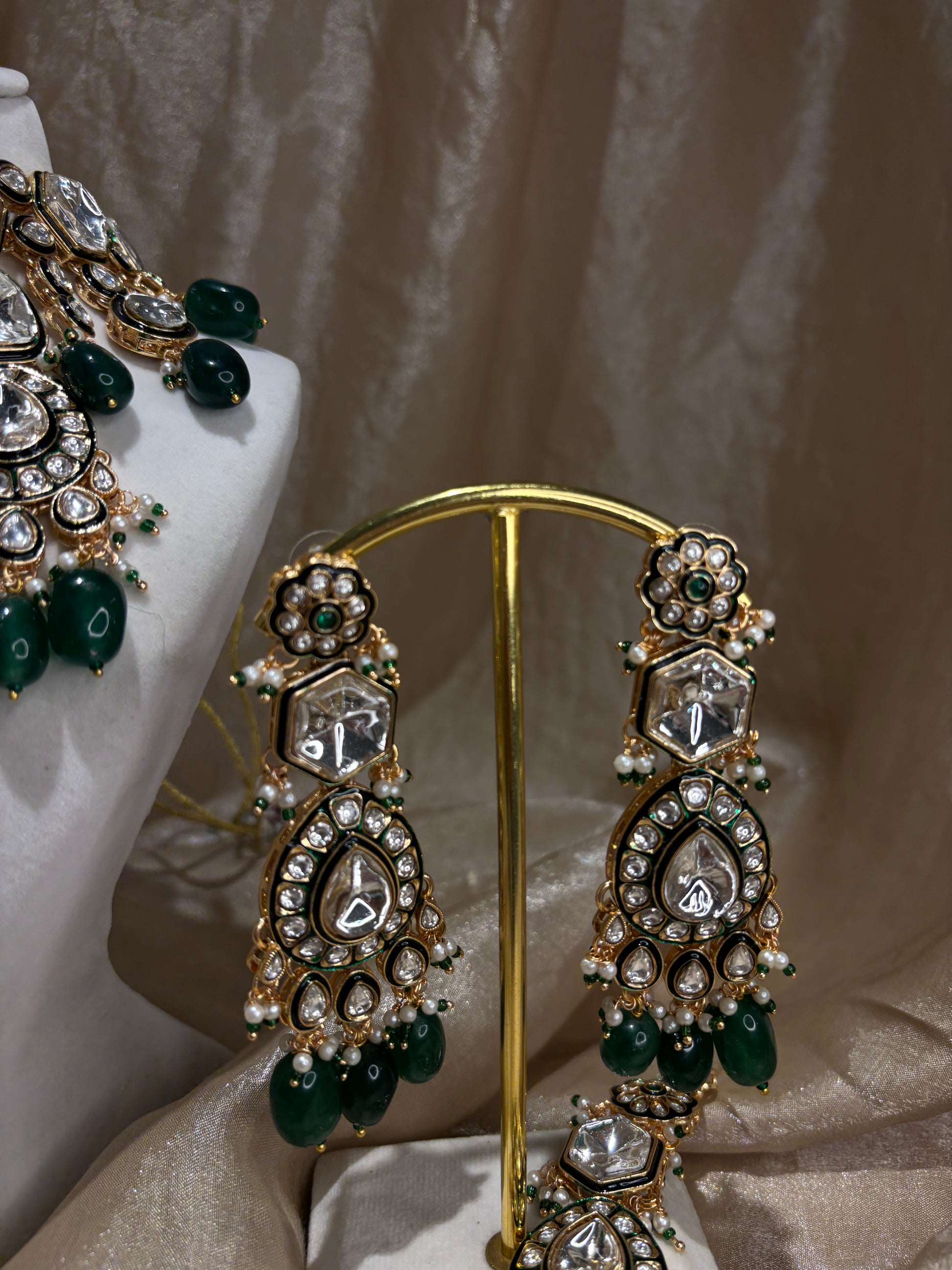 Heavy emerald green kundan choker set with green pearl details; comes with earrings and tikka