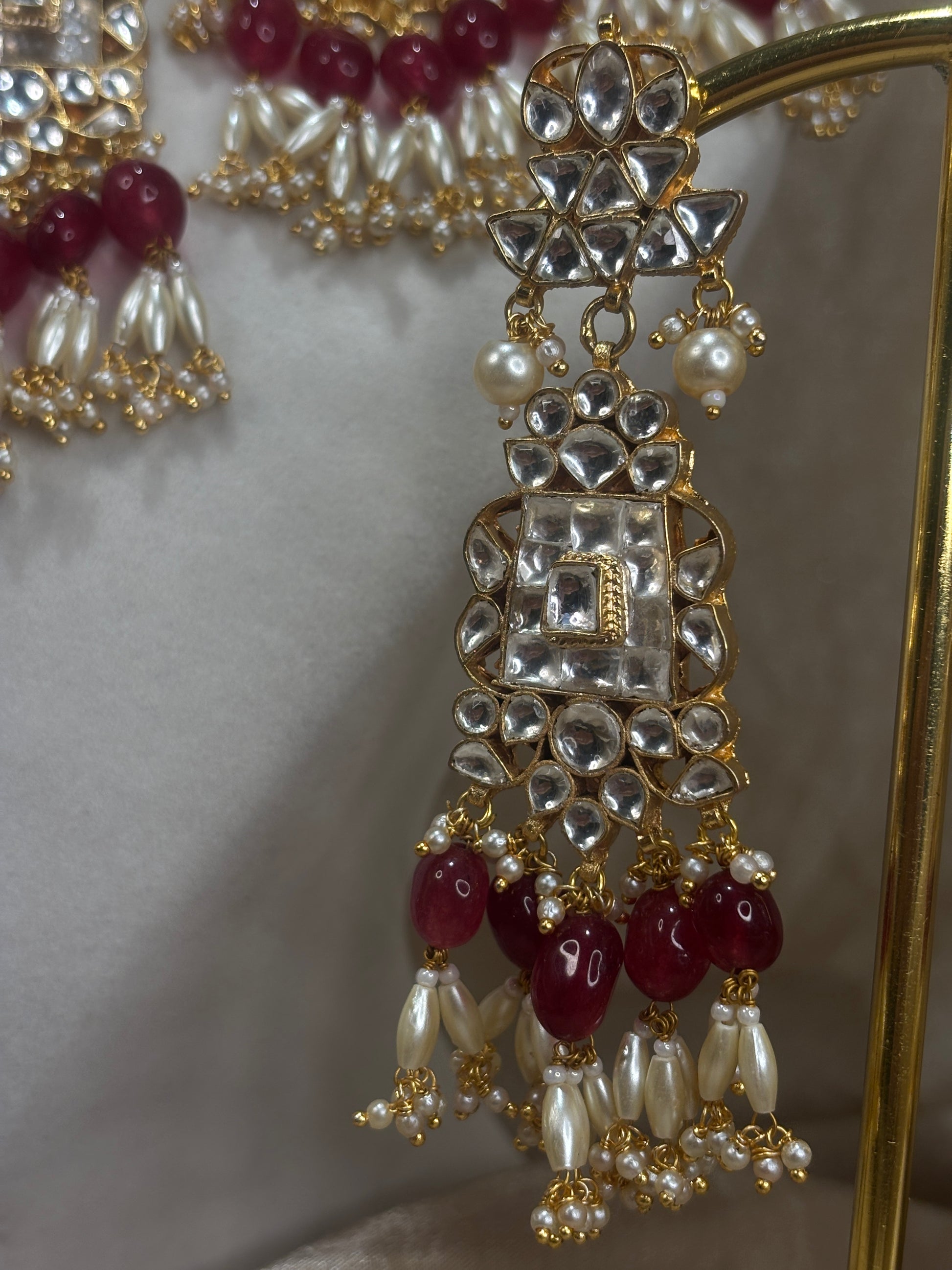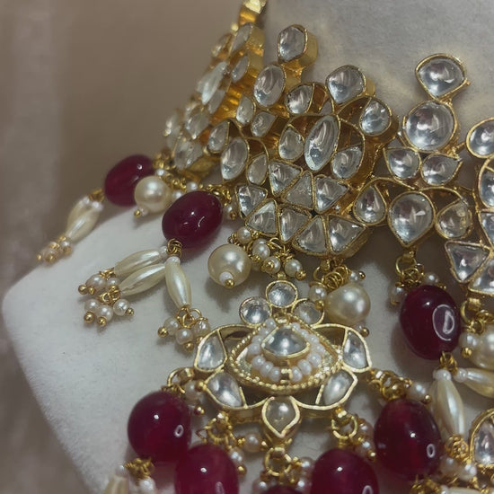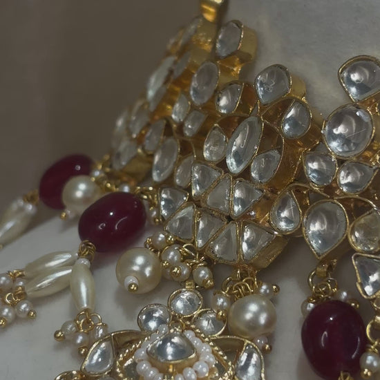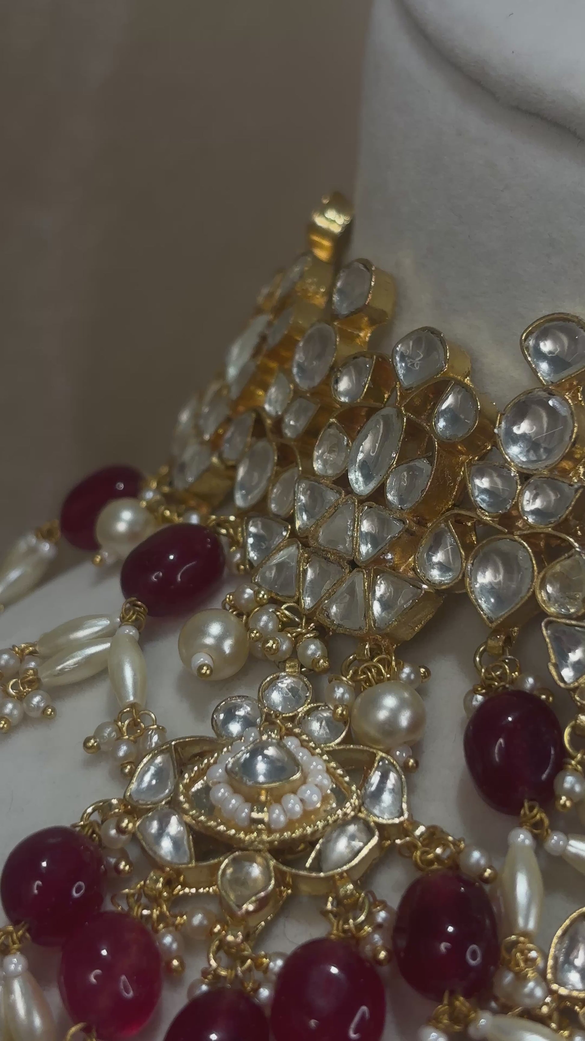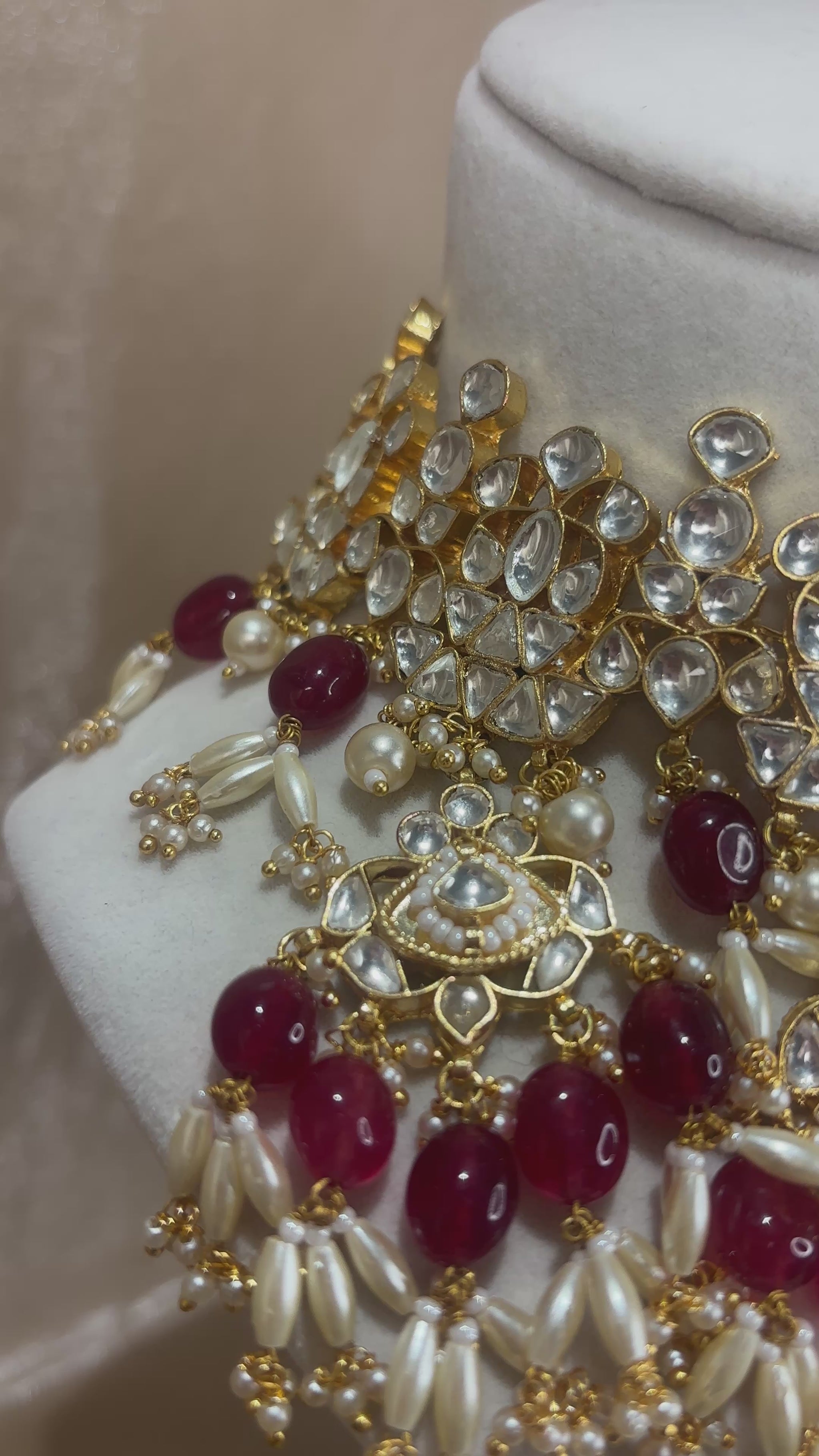 Heavy bridal 22k gold plated ahmedabadi pachi kundan choker with pearl details; comes with heavy earrings