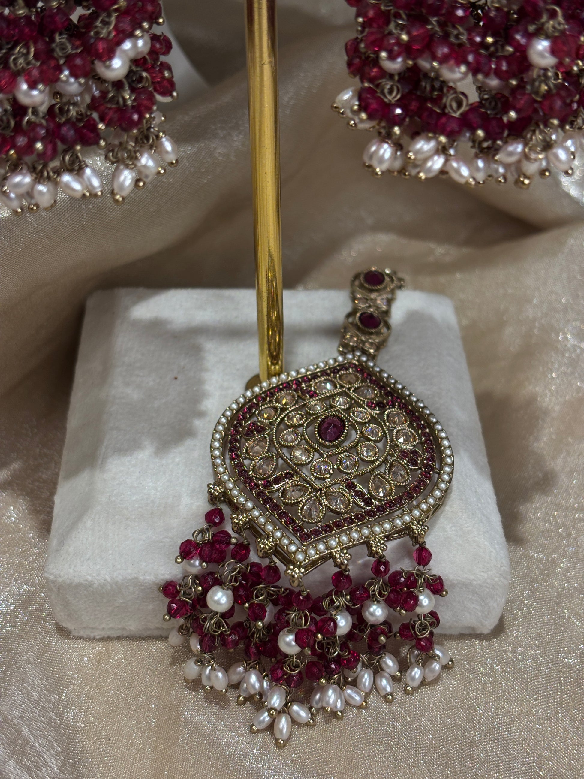 Heavy maroon necklace with intricate pearl details; comes with jhumki and tikka