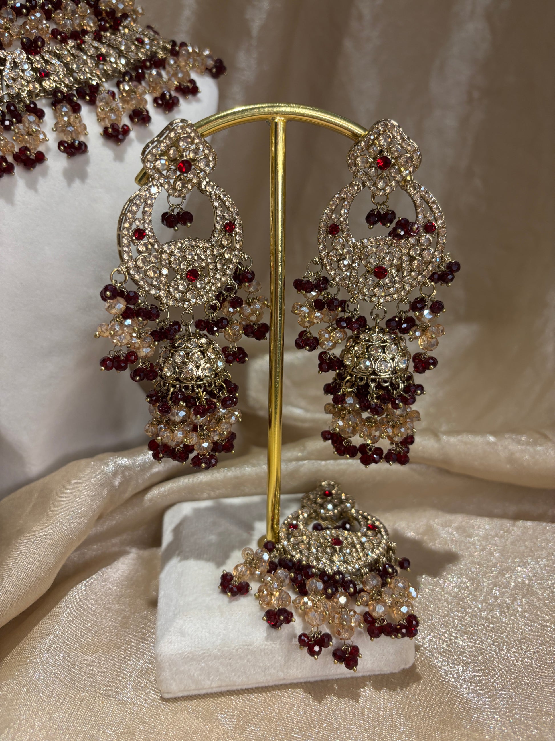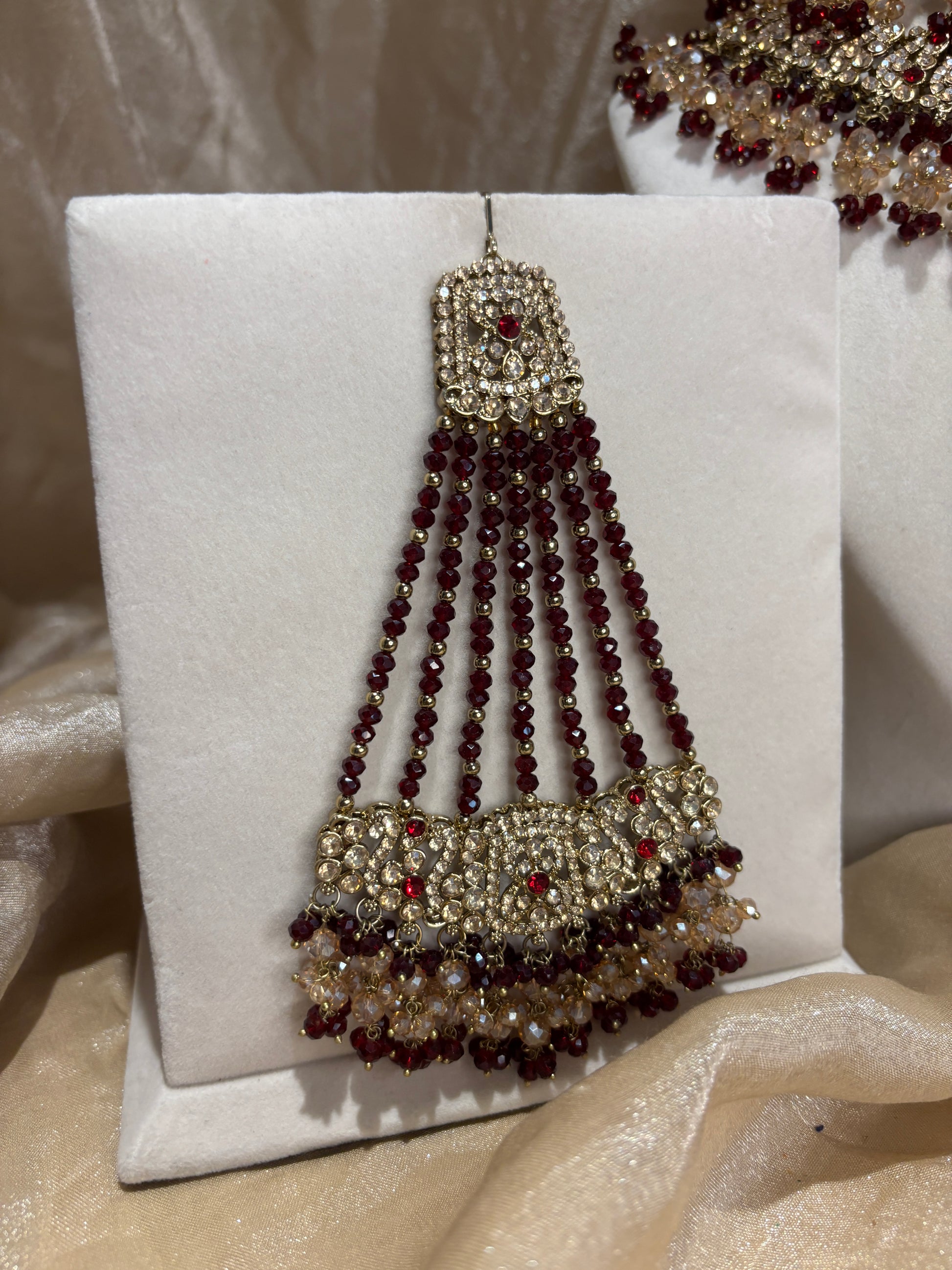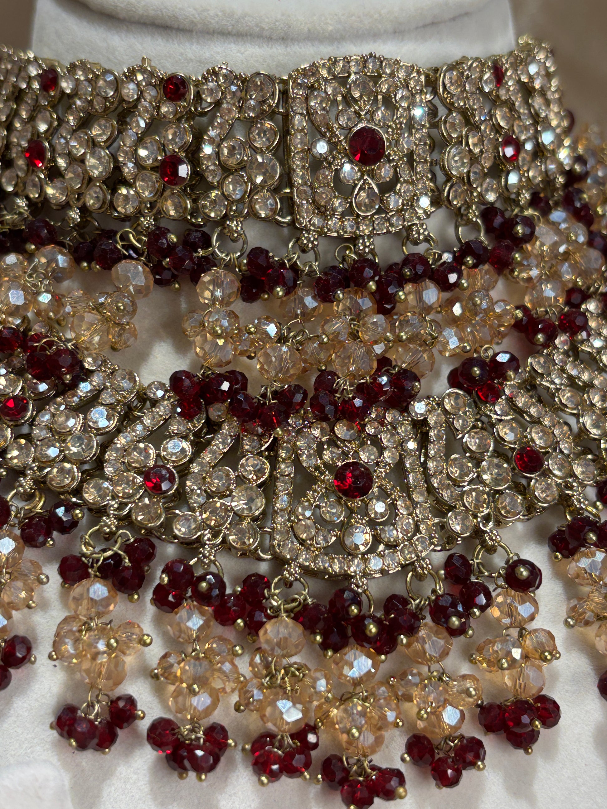 Heavy 2-tone maroon/gold double layer set; comes with choker, necklace, passa, earrings and tikka