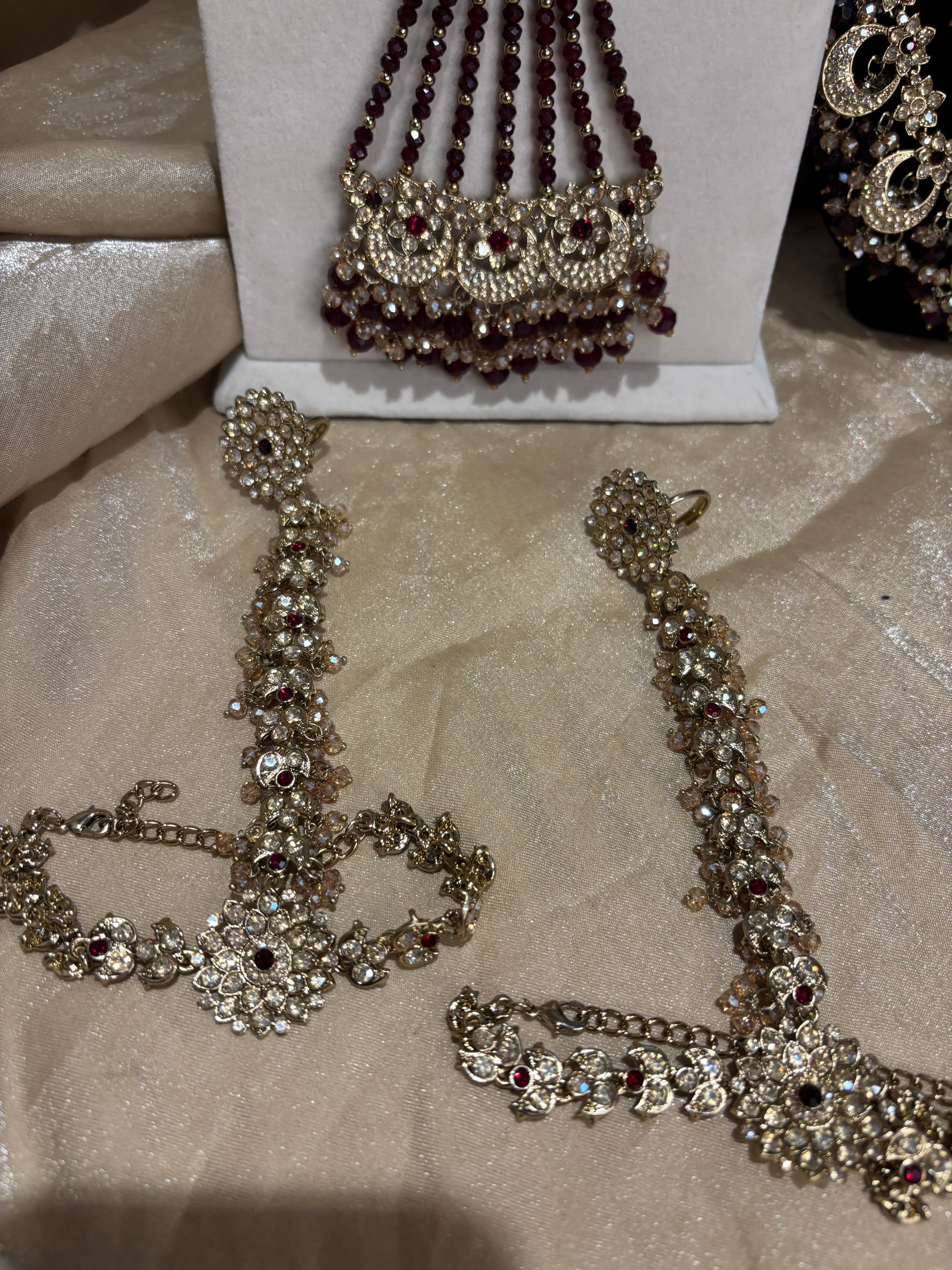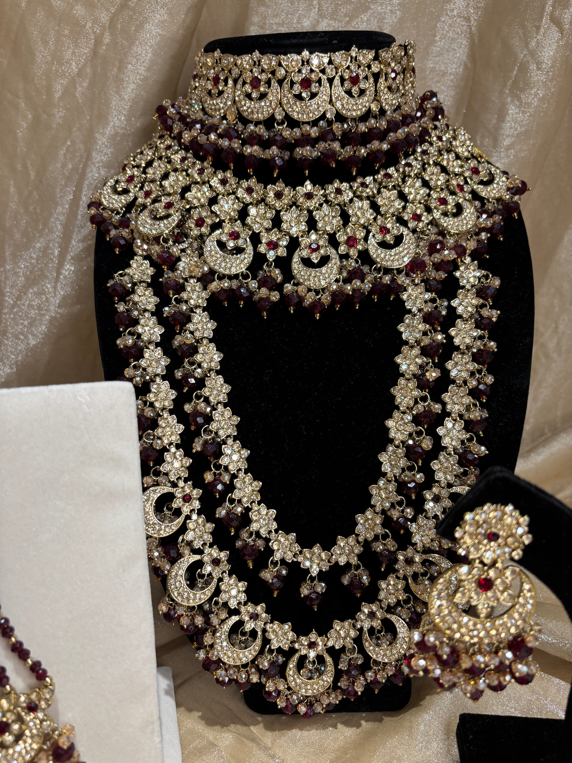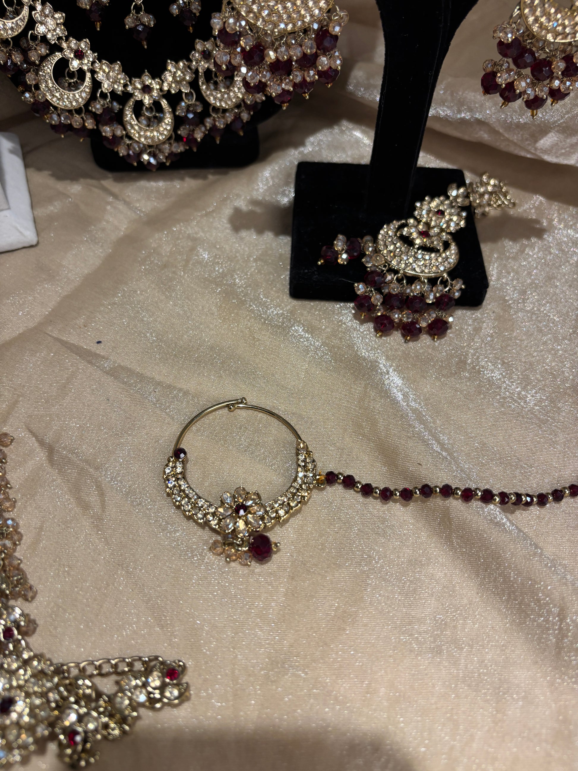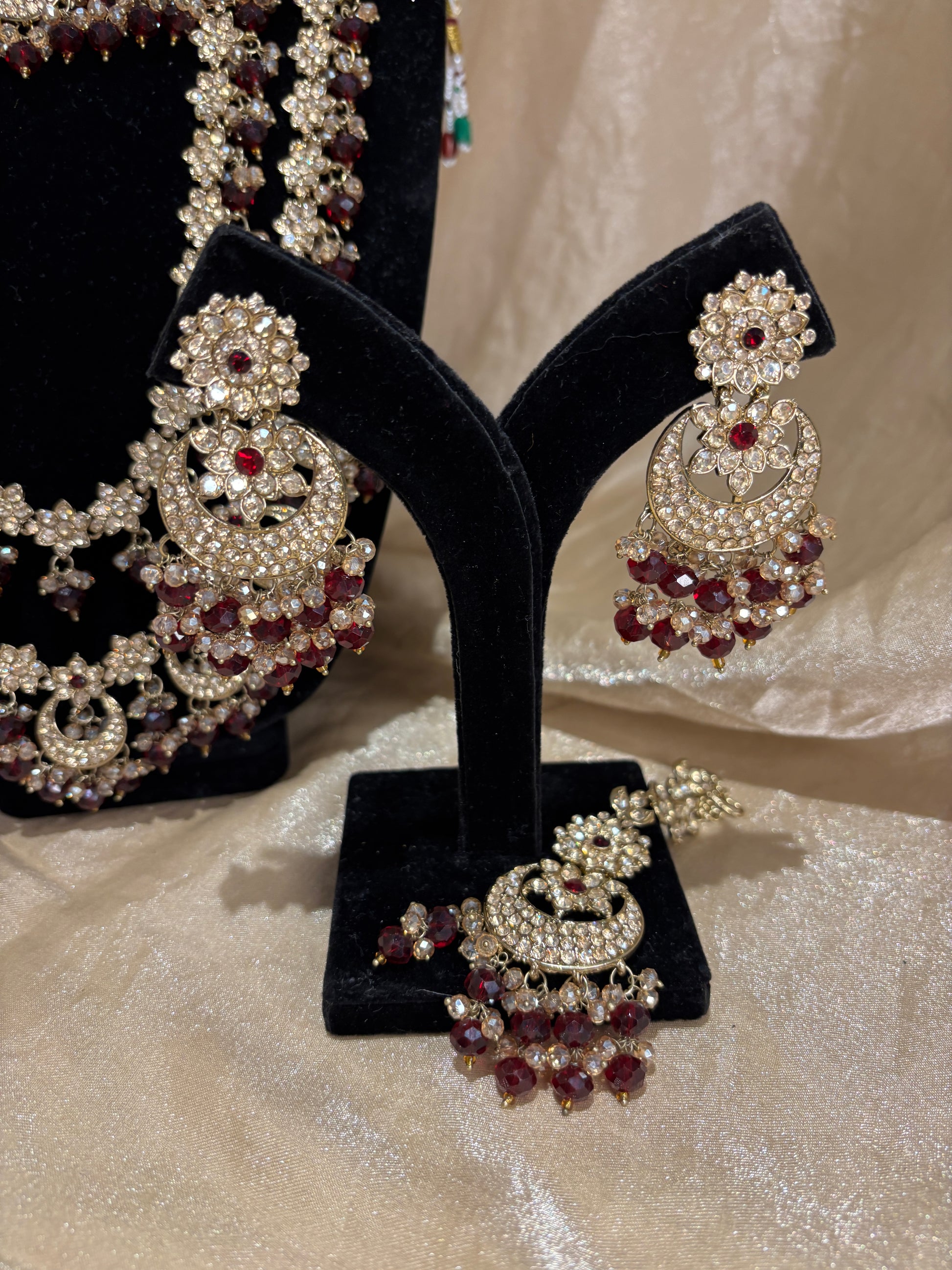 Heavy maroon 2-tone set; comes with choker, necklace, long set, earrings, tikka, matha Patti, passa, nose ring and hand accessories