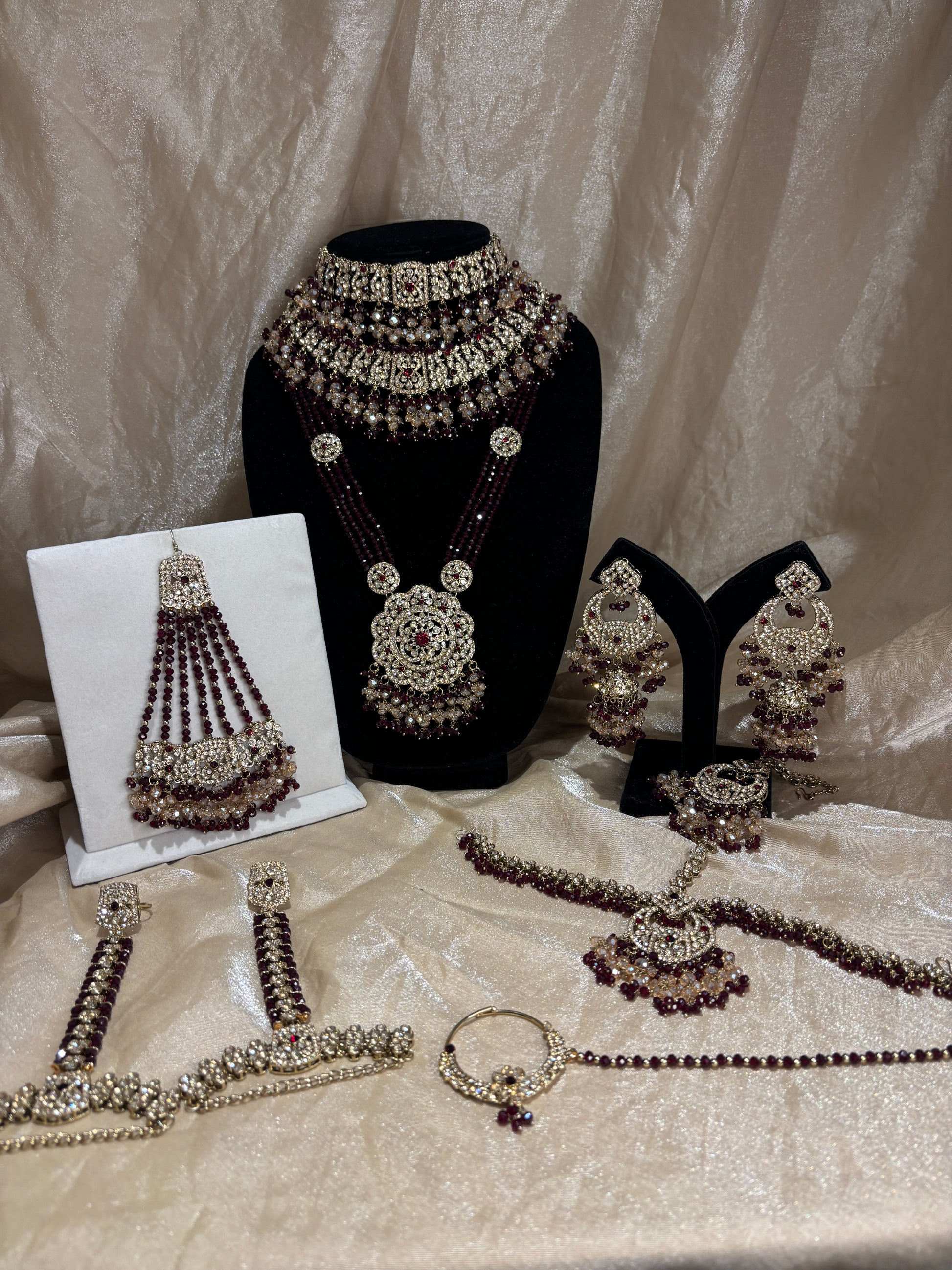 Heavy maroon; comes with choker, necklace, long set, earrings, tikka, matha Patti, passa, nose ring and hand accessories