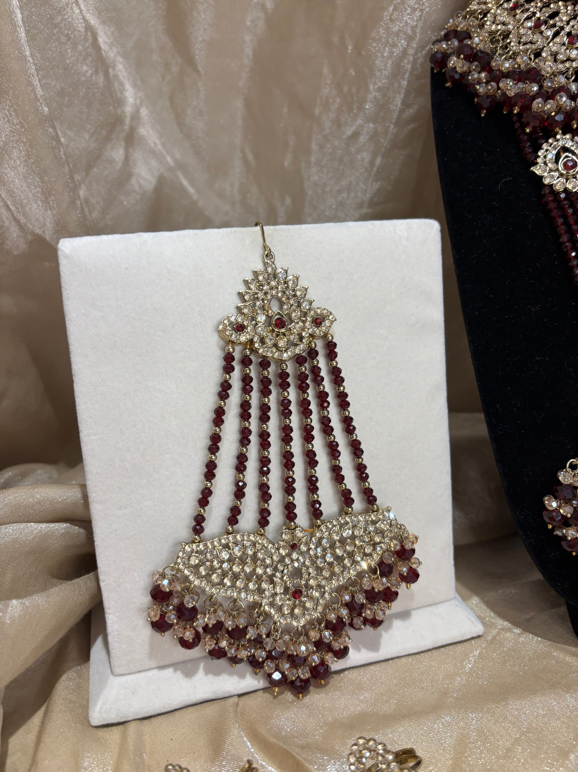 Heavy maroon 2-tone set; comes with choker, necklace, long set, earrings, tikka, matha Patti, passa, nose ring and hand accessories