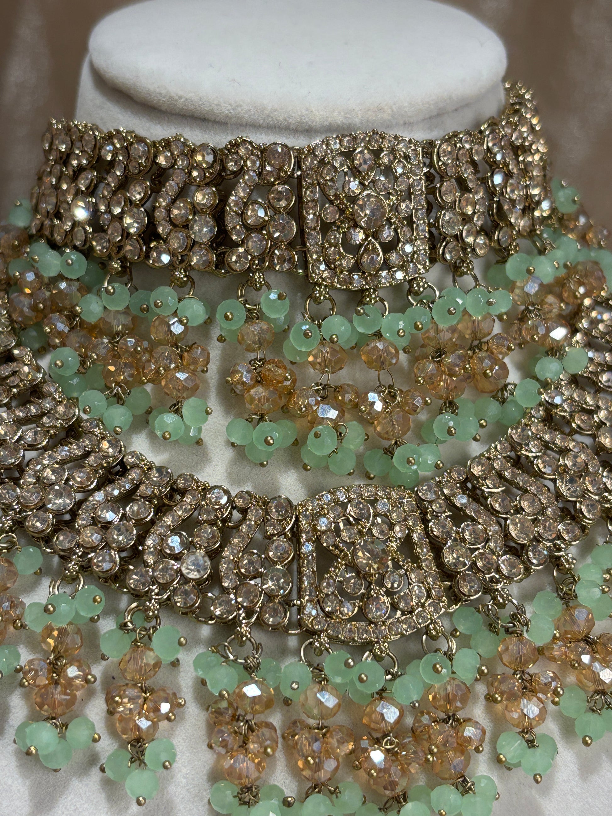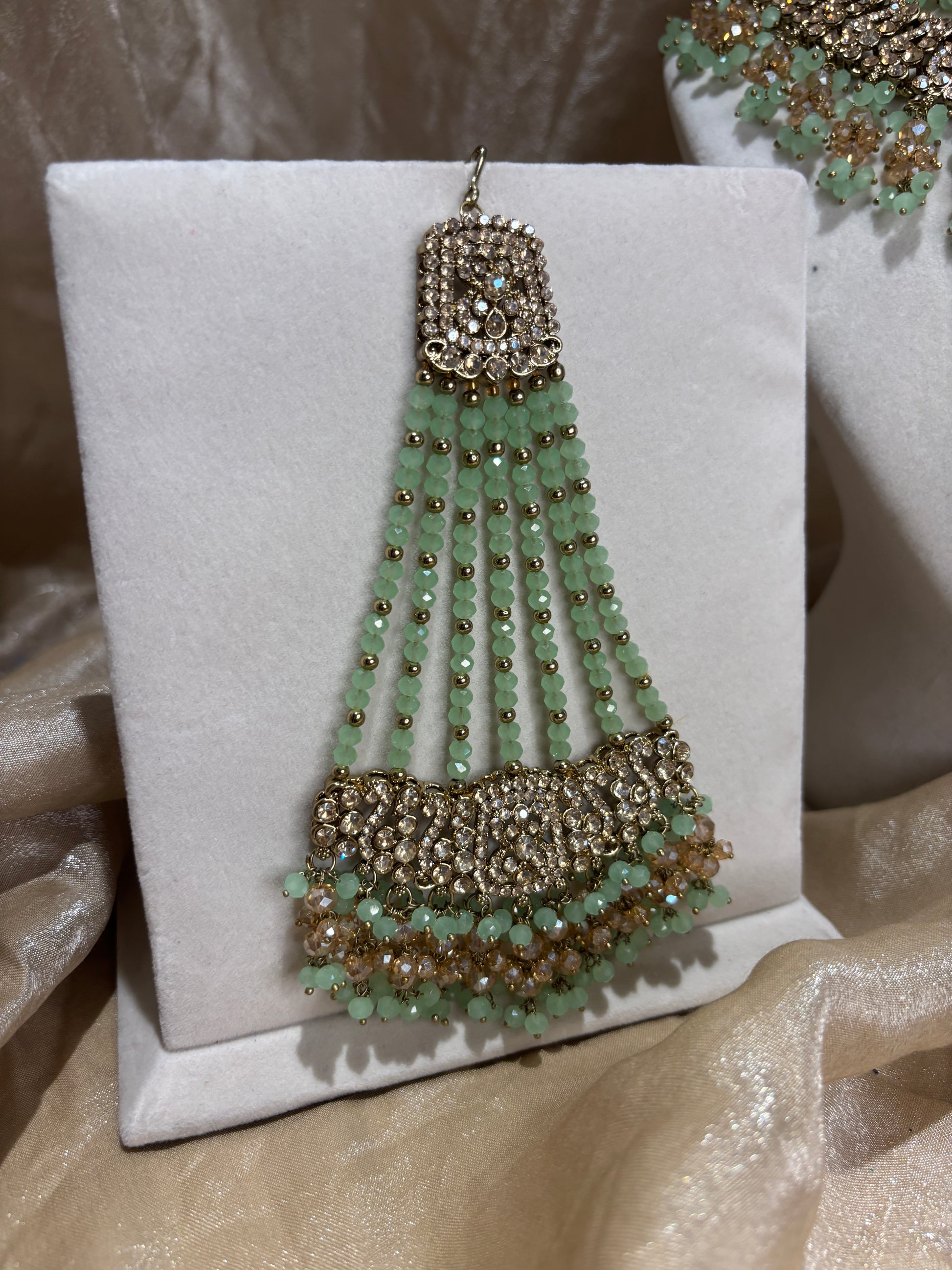Heavy 2-tone sea green (mint green) /gold double layer set; comes with choker, necklace, passa, earrings and tikka
