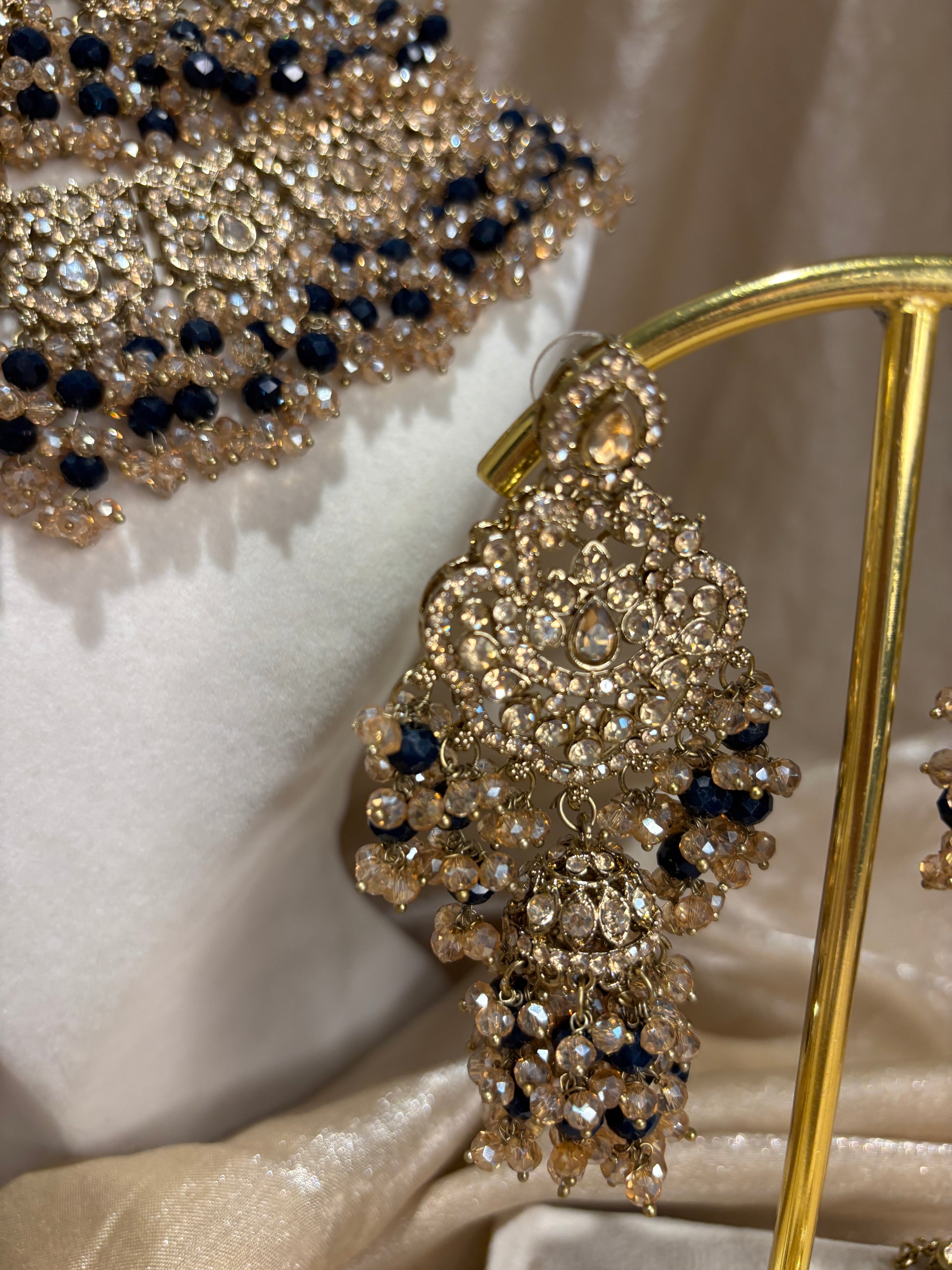 Heavy 2-tone navy blue/gold double layer set; comes with choker, necklace, passa, earrings and tikka