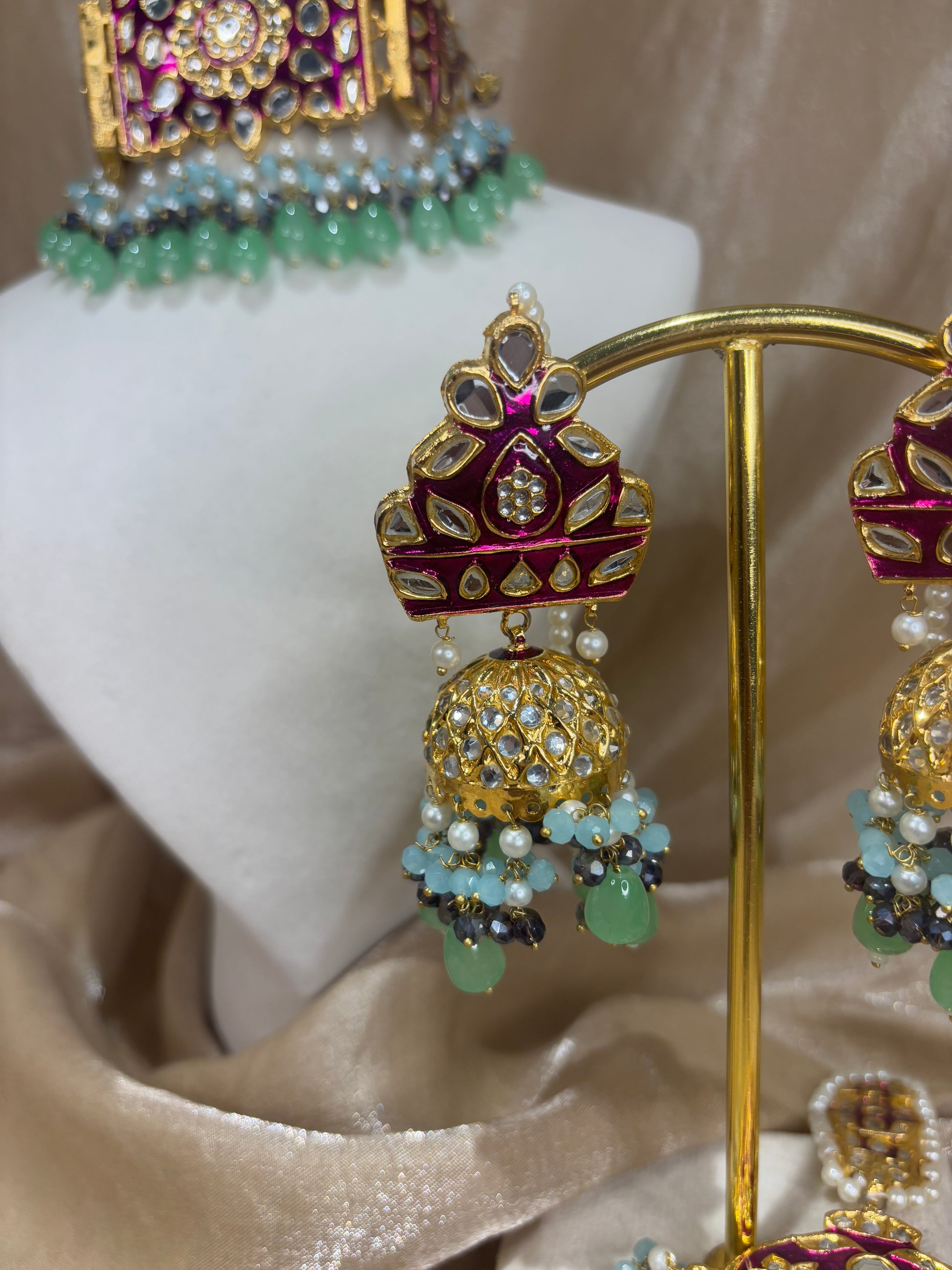 Hot pink and mint green 22k gold plated Pakistani thappa kundan; comes with earrings (With over the ear pearl sahare) and tikka