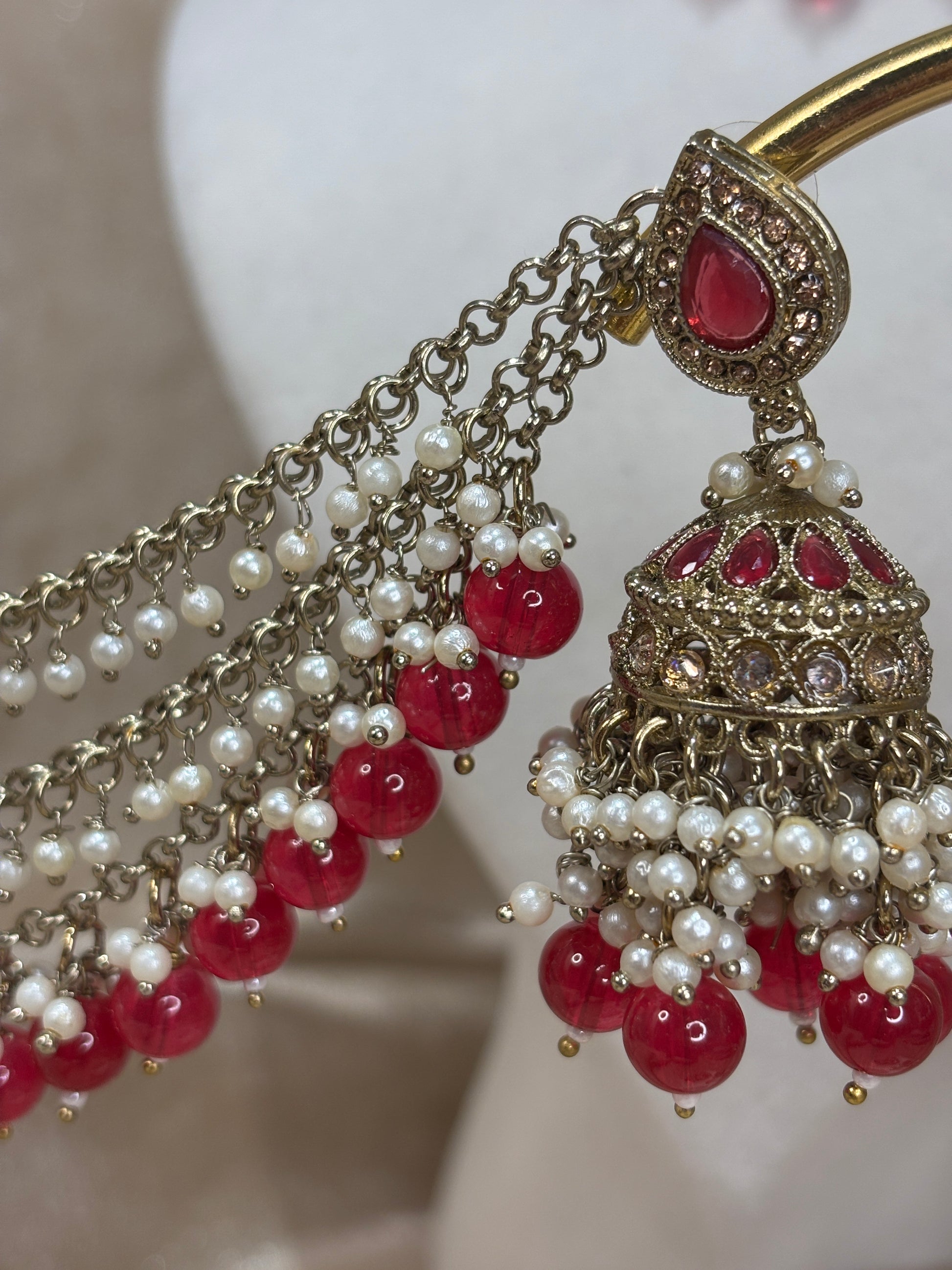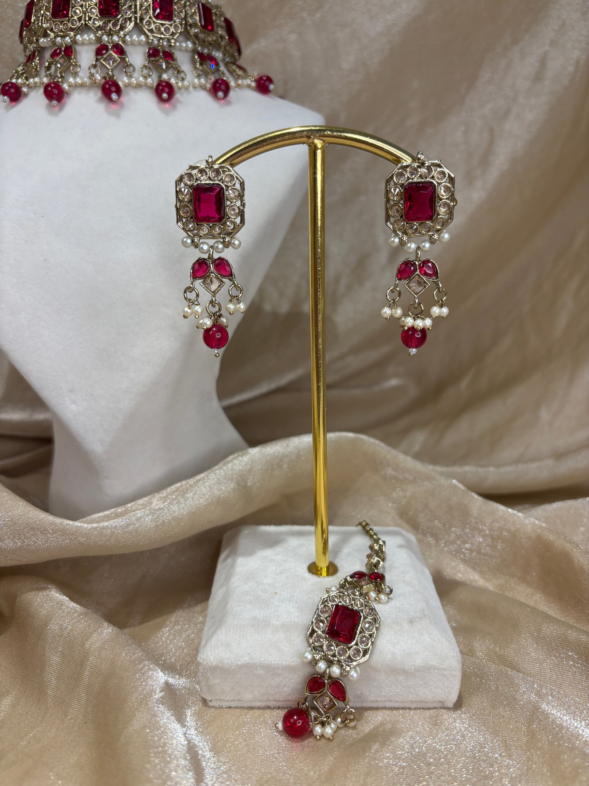Bright hot pink choker set with small pearl details; comes with earrings and tikka