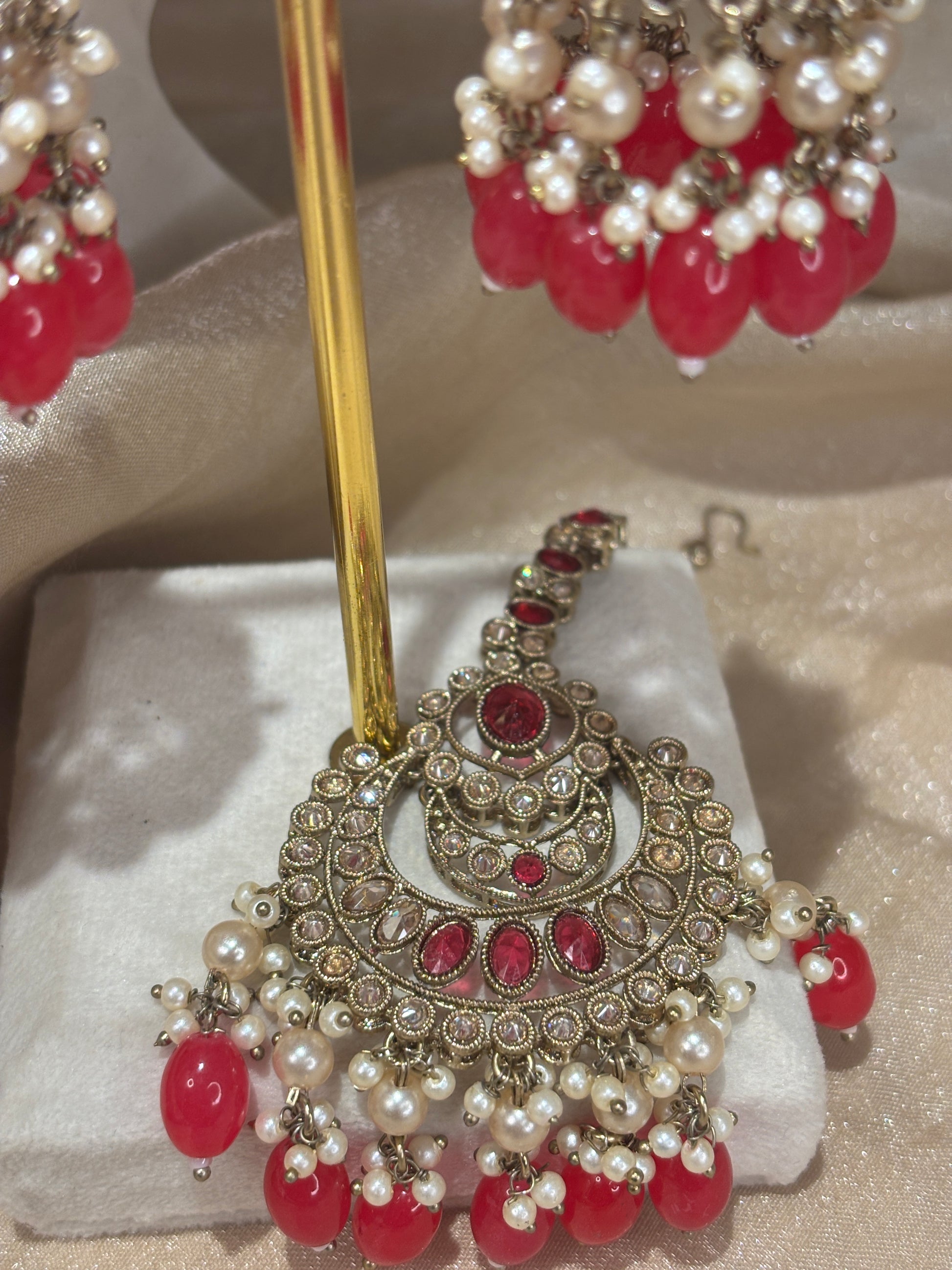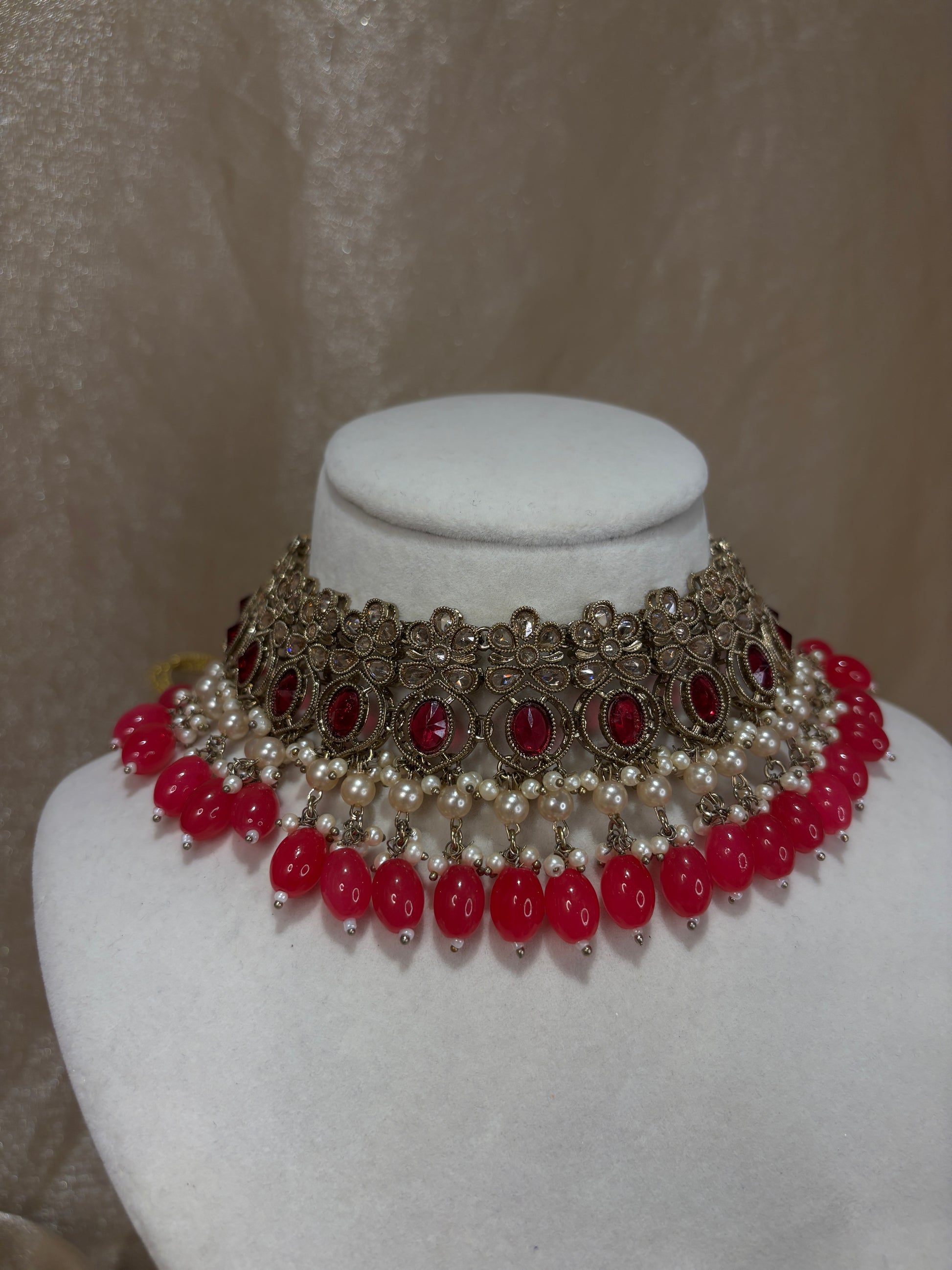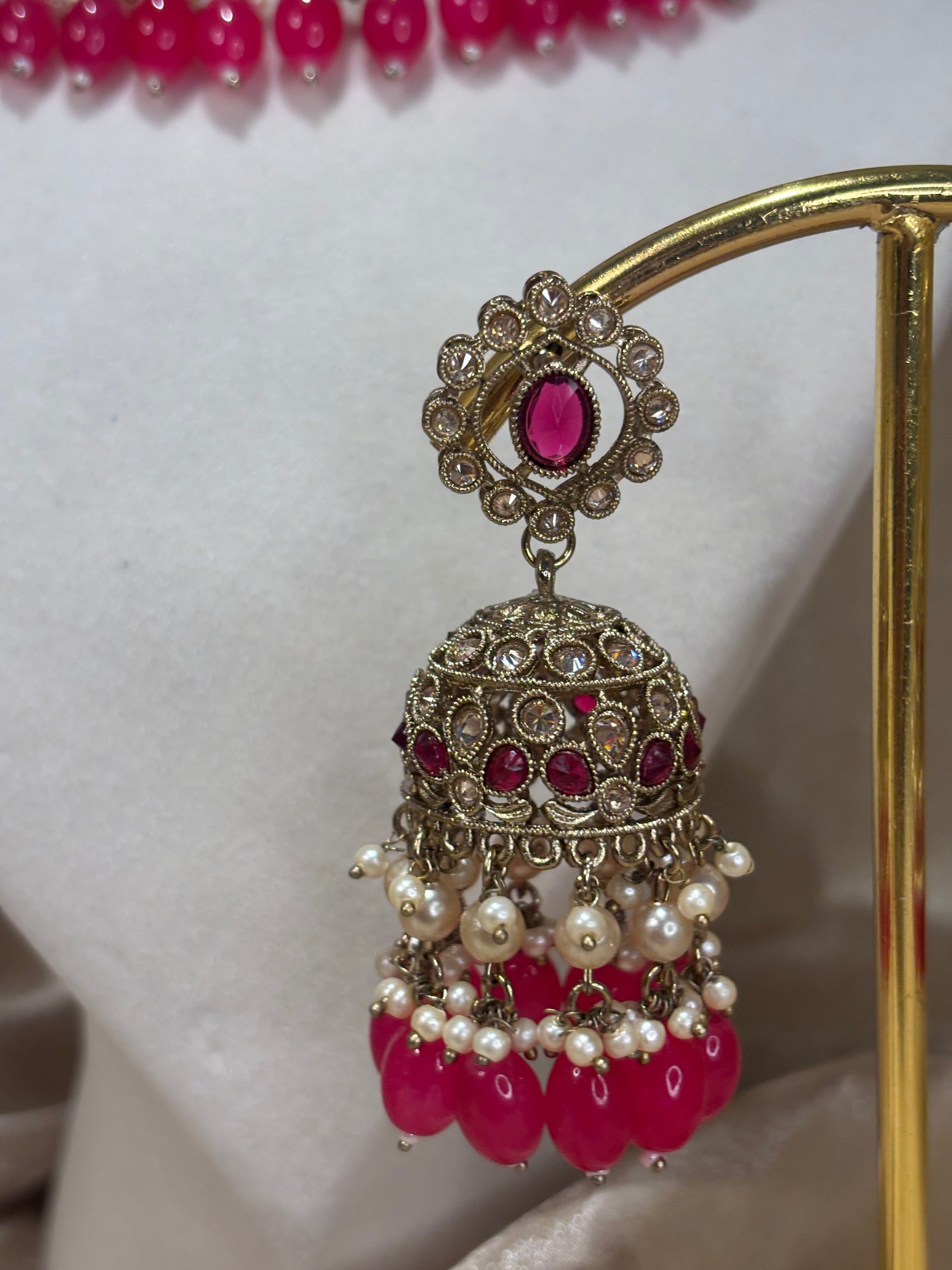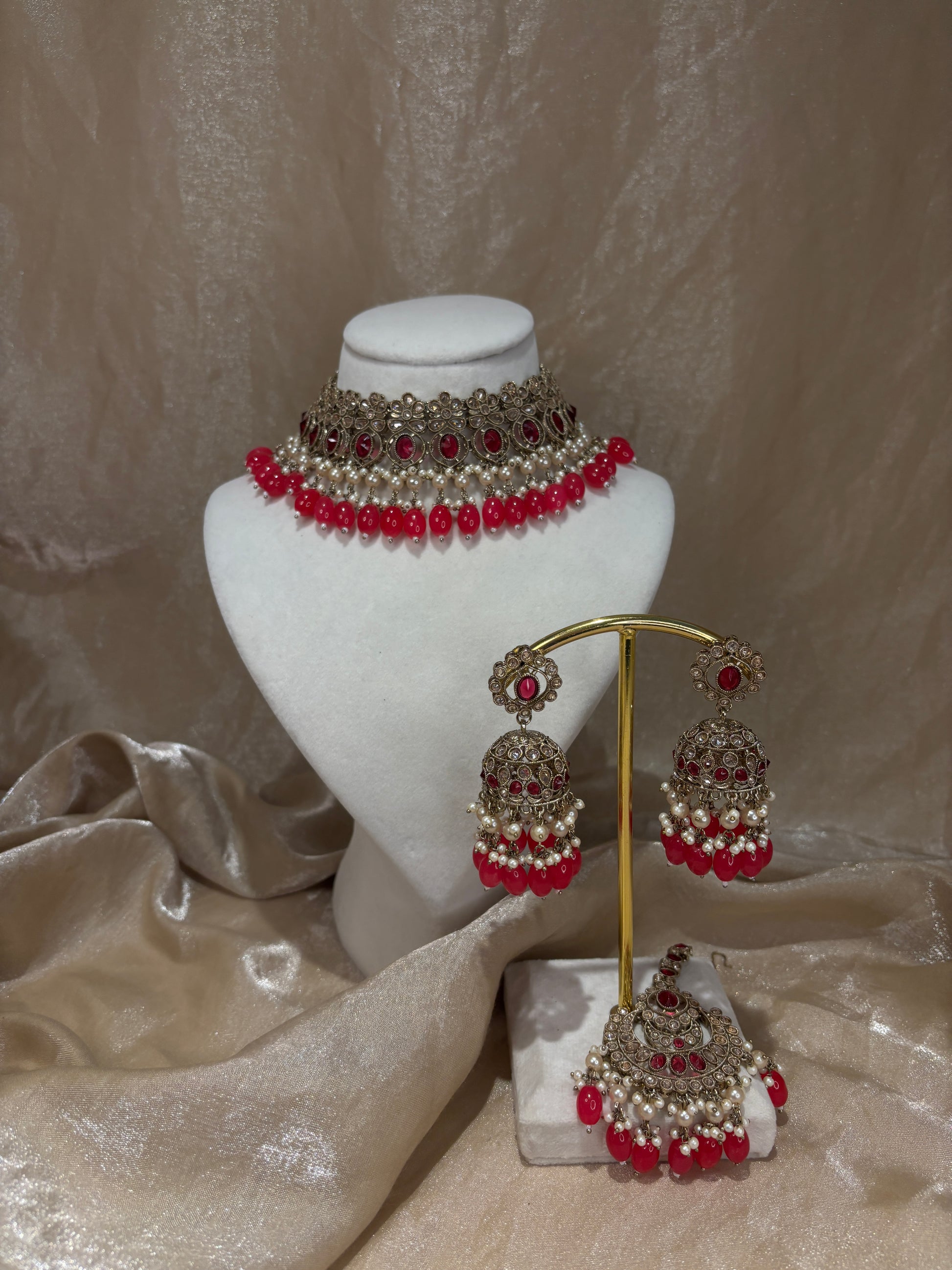 Hot pink choker with with pearl details; comes with jhumki and tikka