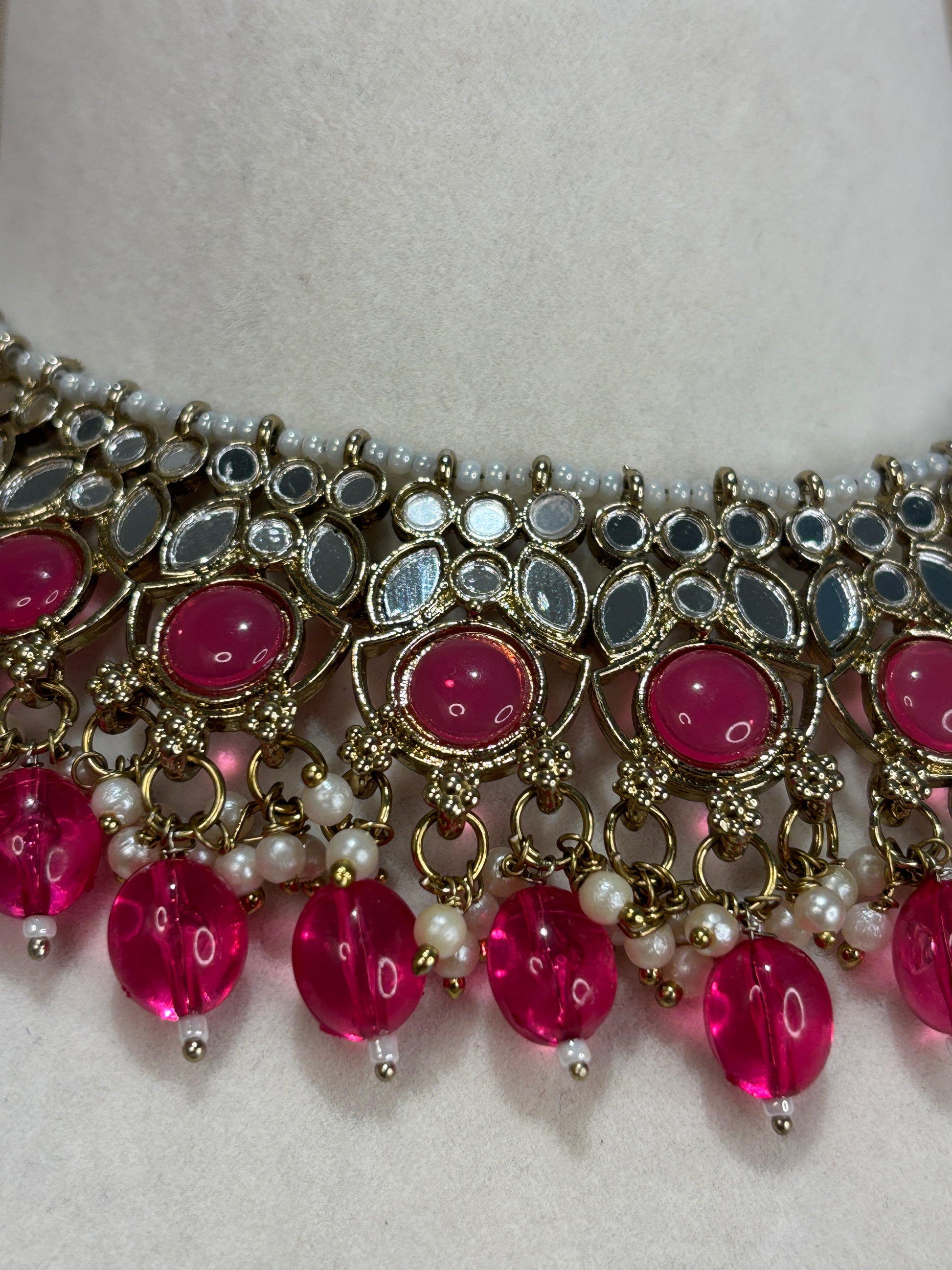 Bright hot pink mirror work necklace with small pearl details; comes with earrings and tikka