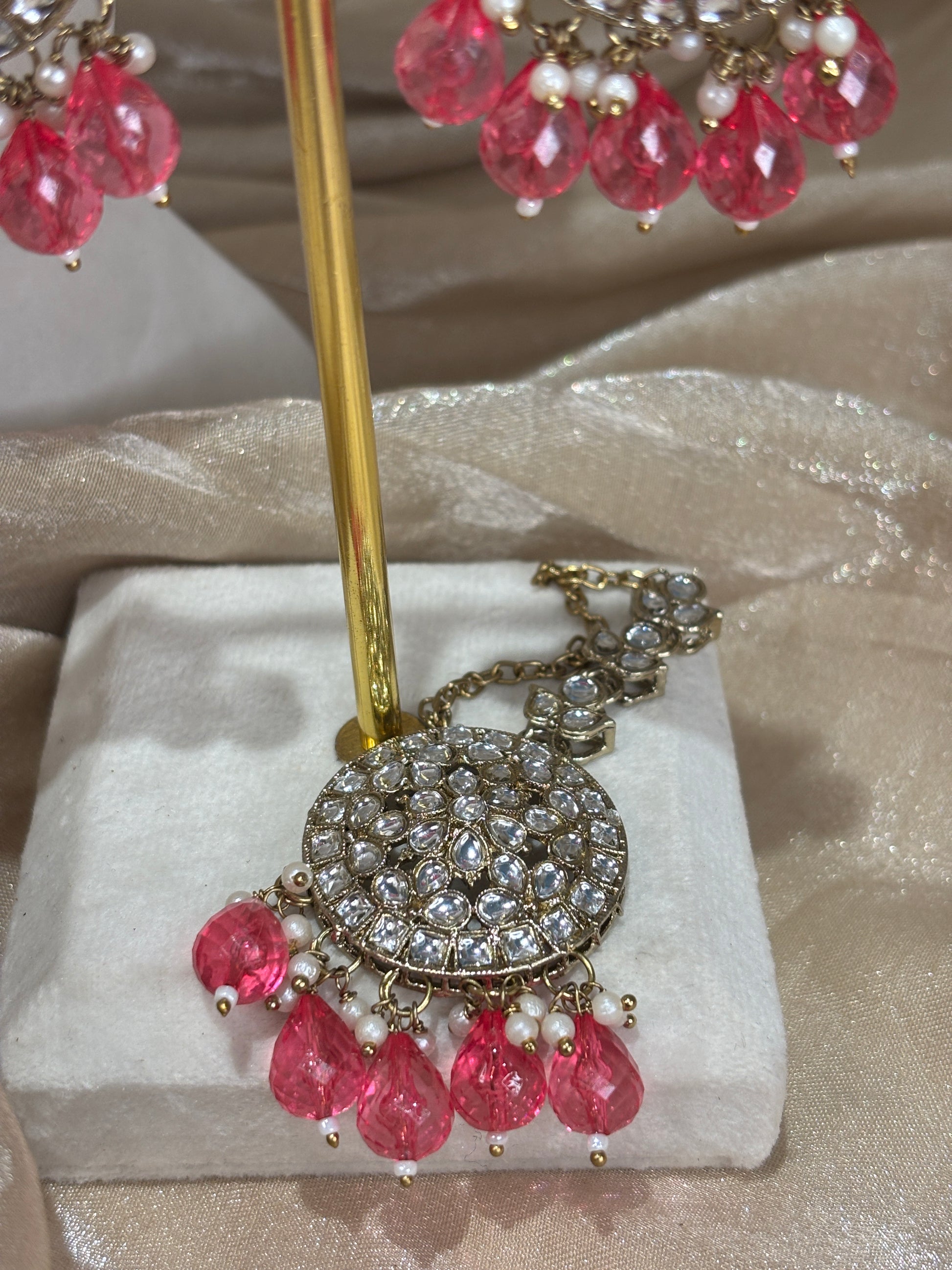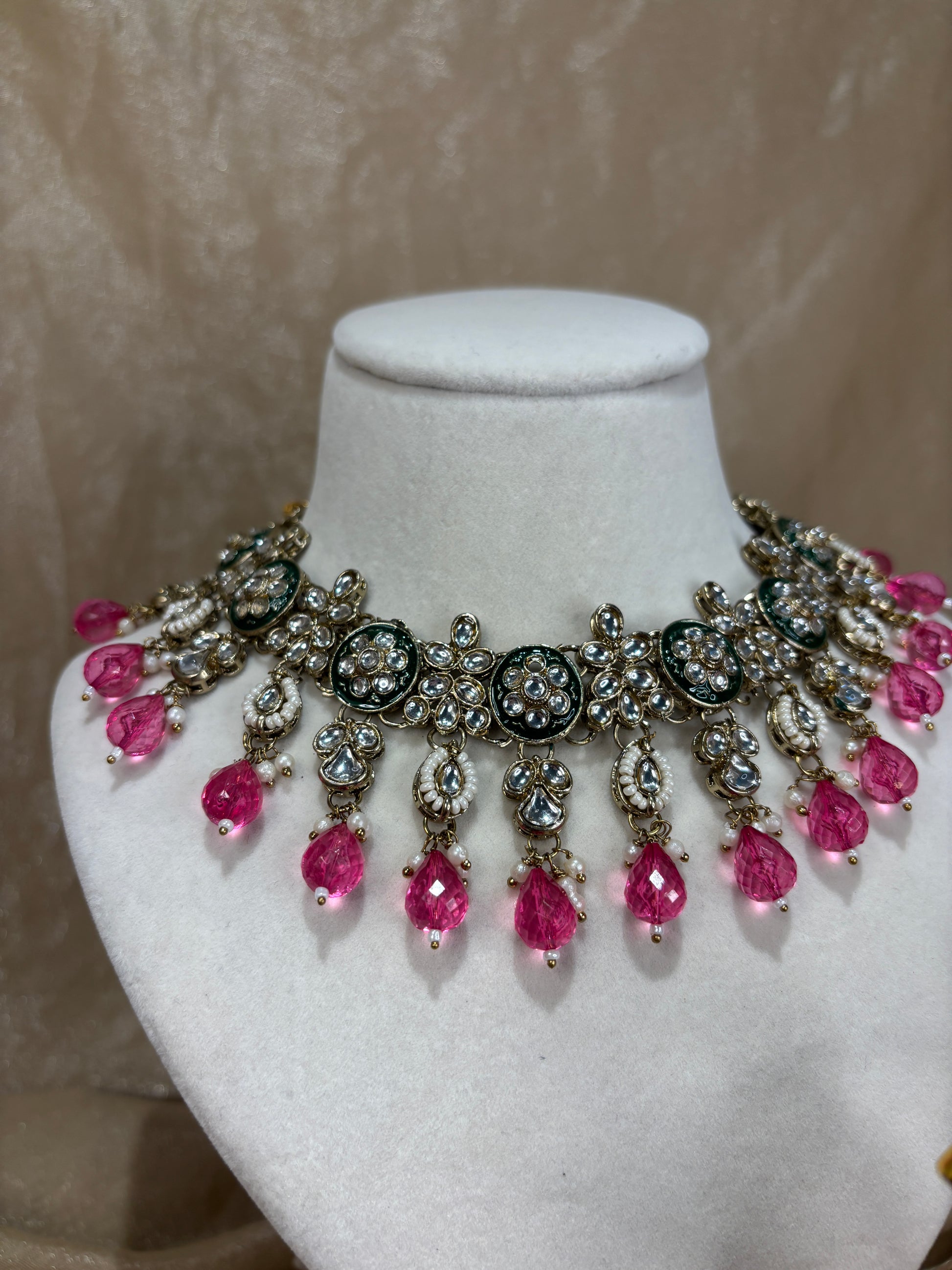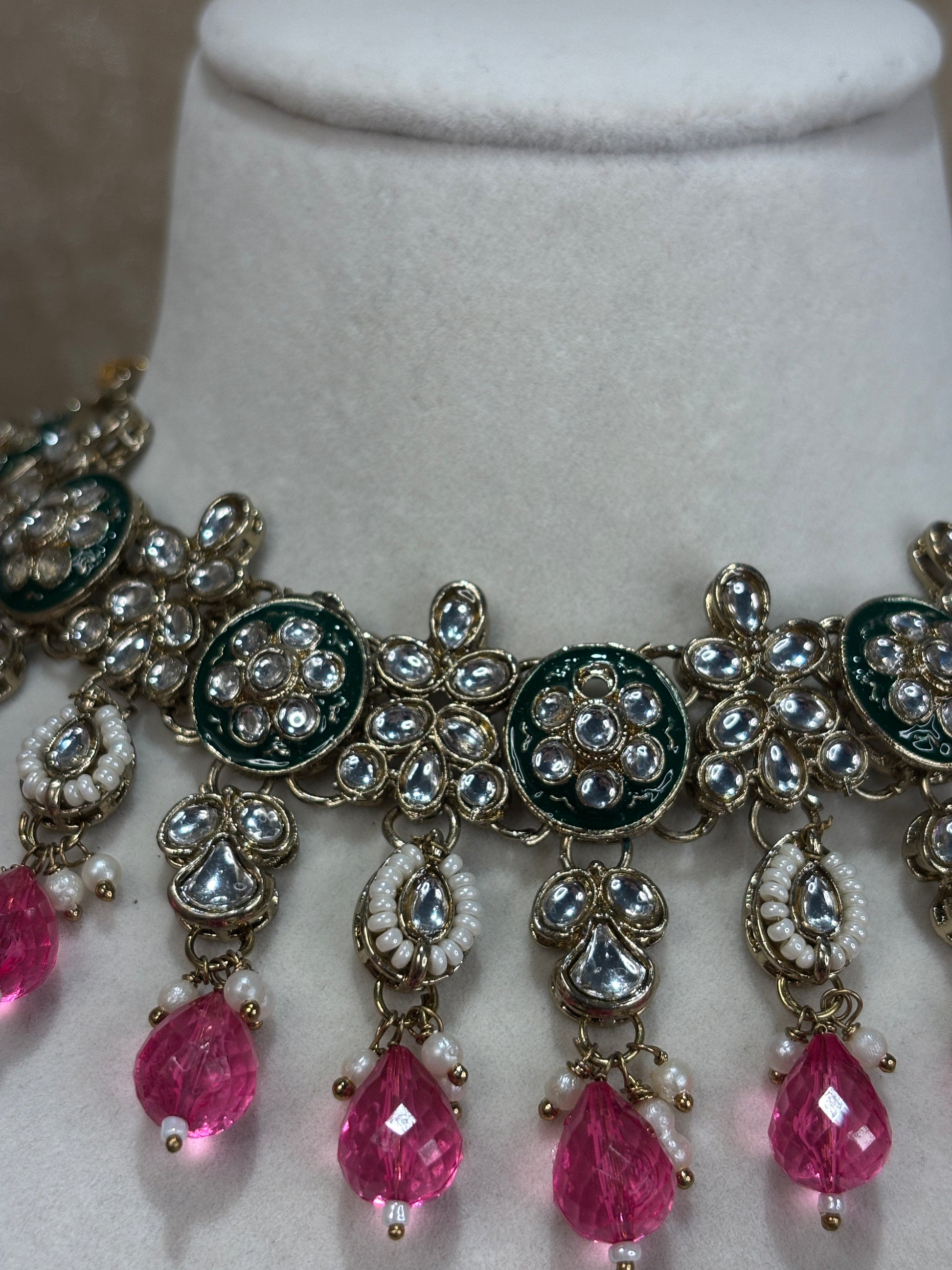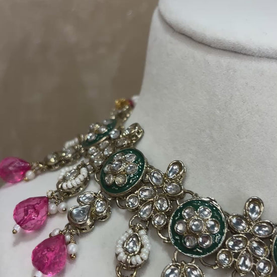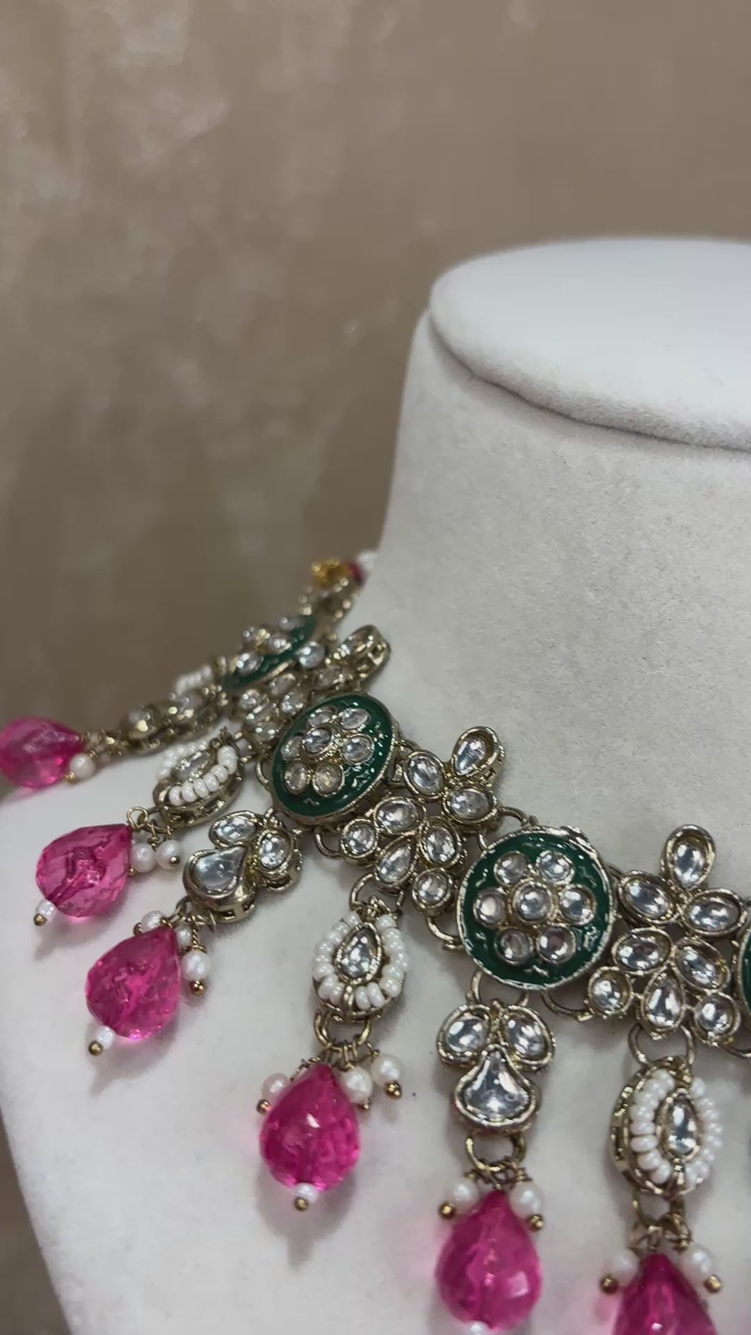 Hot pink white kunda necklace set with emearld green accents comes with earrings and tikka