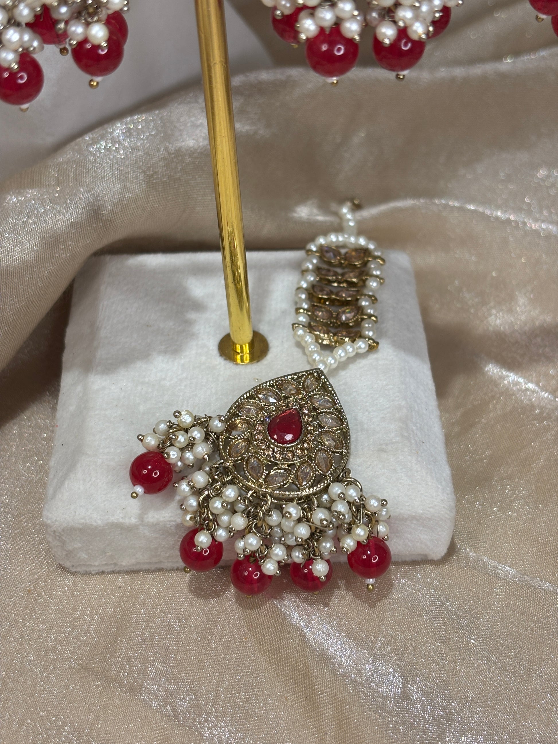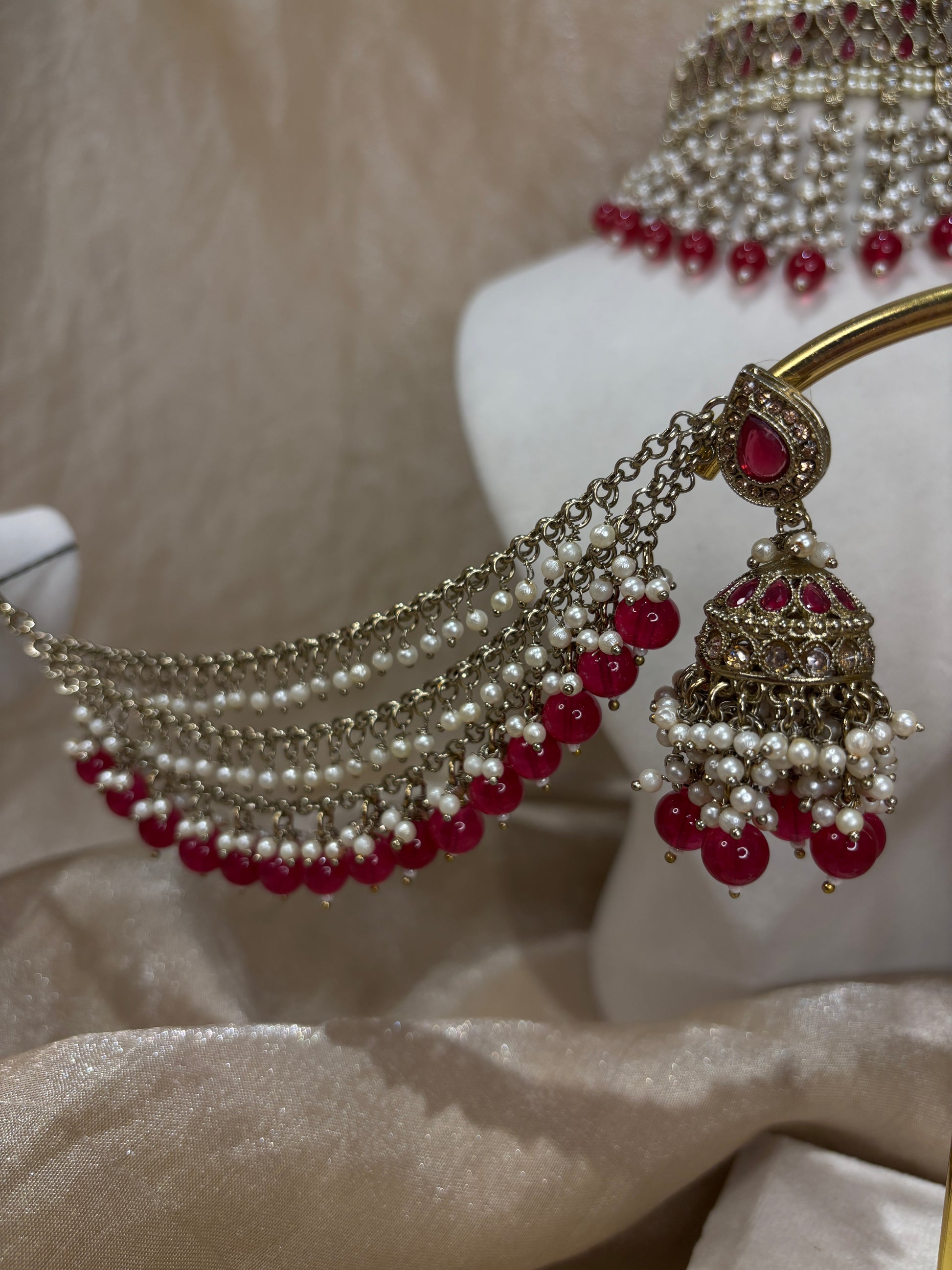 Vibrant hot pink choker with heavy pearl details comes in v-shape details; sahare jhumki earrings and tikka