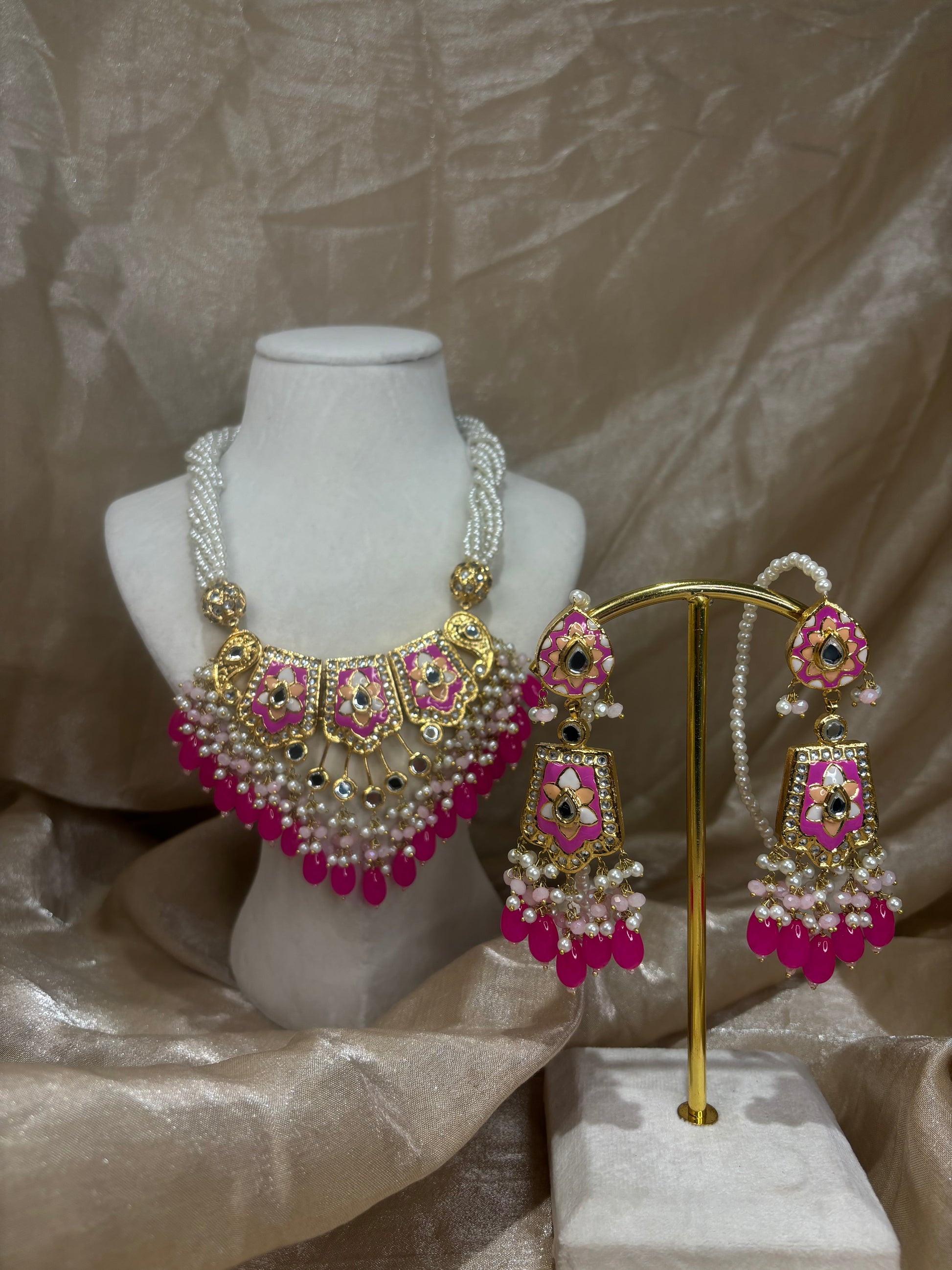 22k gold plated Pakistani thappa kundan necklace in hot pink with meenakari (hand painted) and heavy pearl details. Comes with sahare earrings.