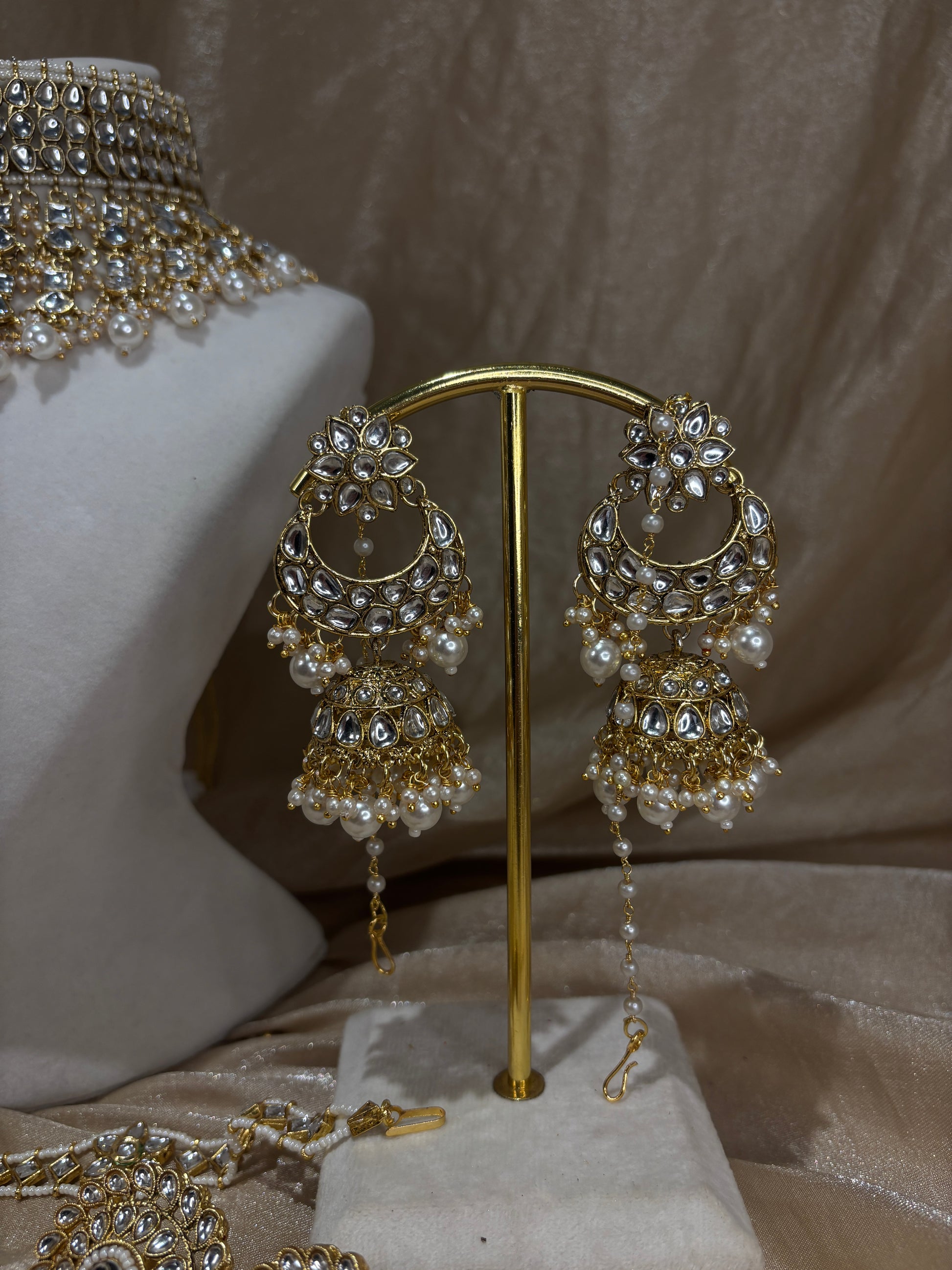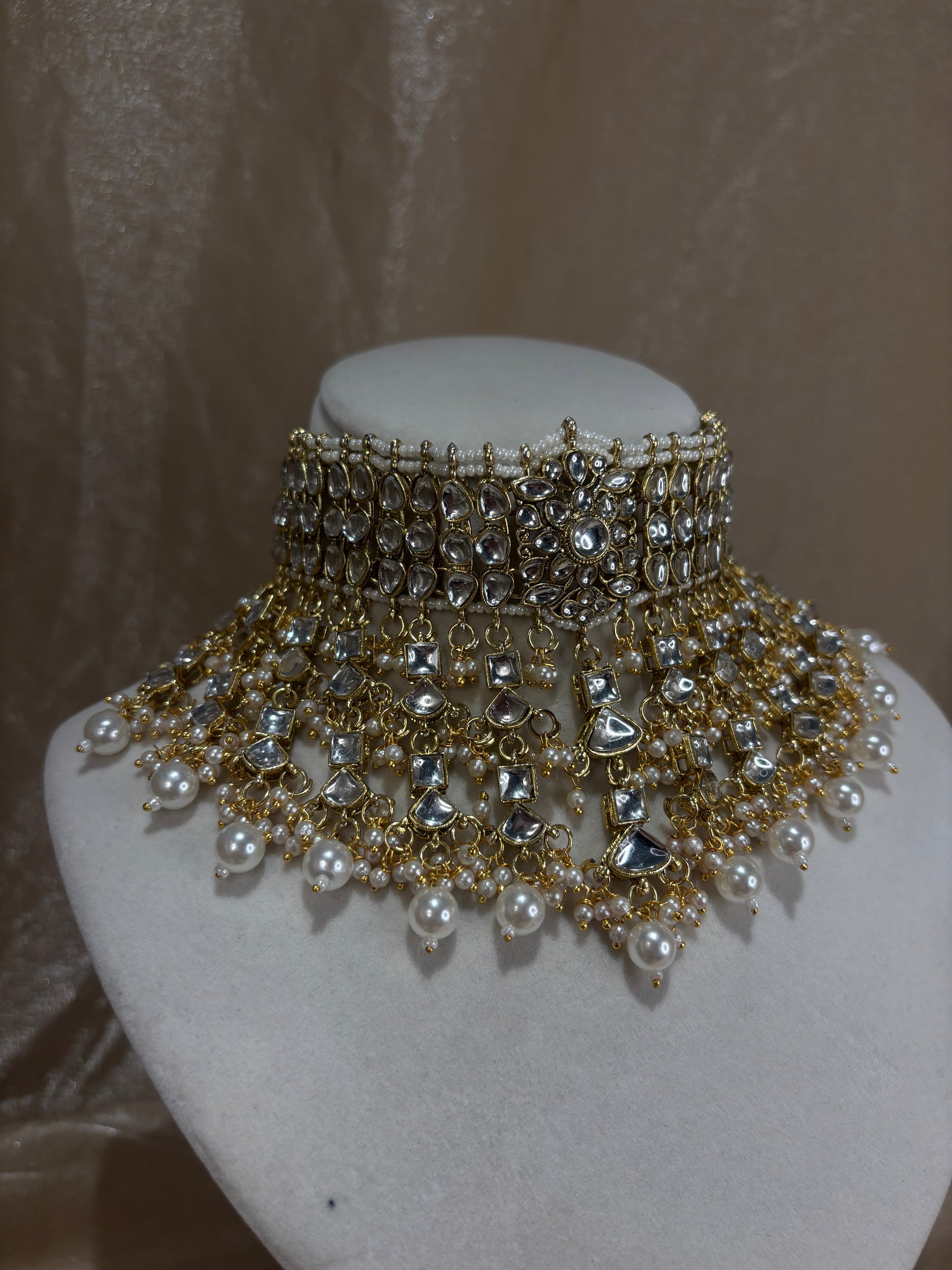 Gold kundan bridal choker set with pearl details; comes with earrings, tikka, matha Patti, two statement rings, and large nose rings