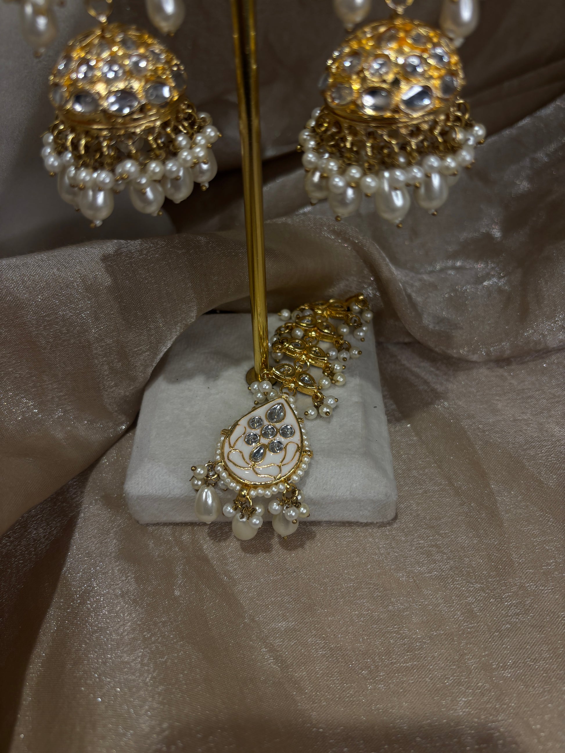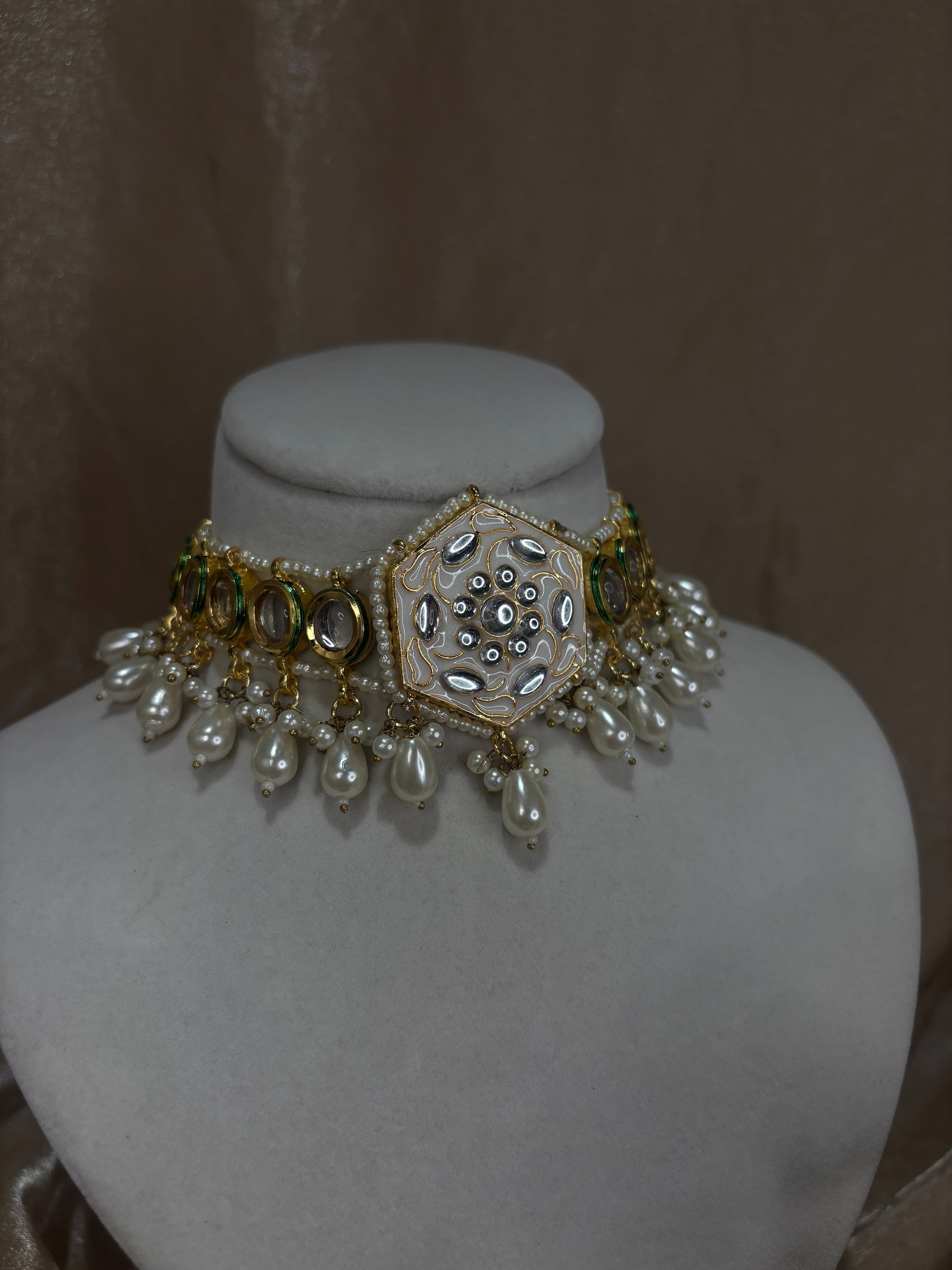 Kundan choker set in white with meenakari (hand painted) details; comes with earrings and tikka