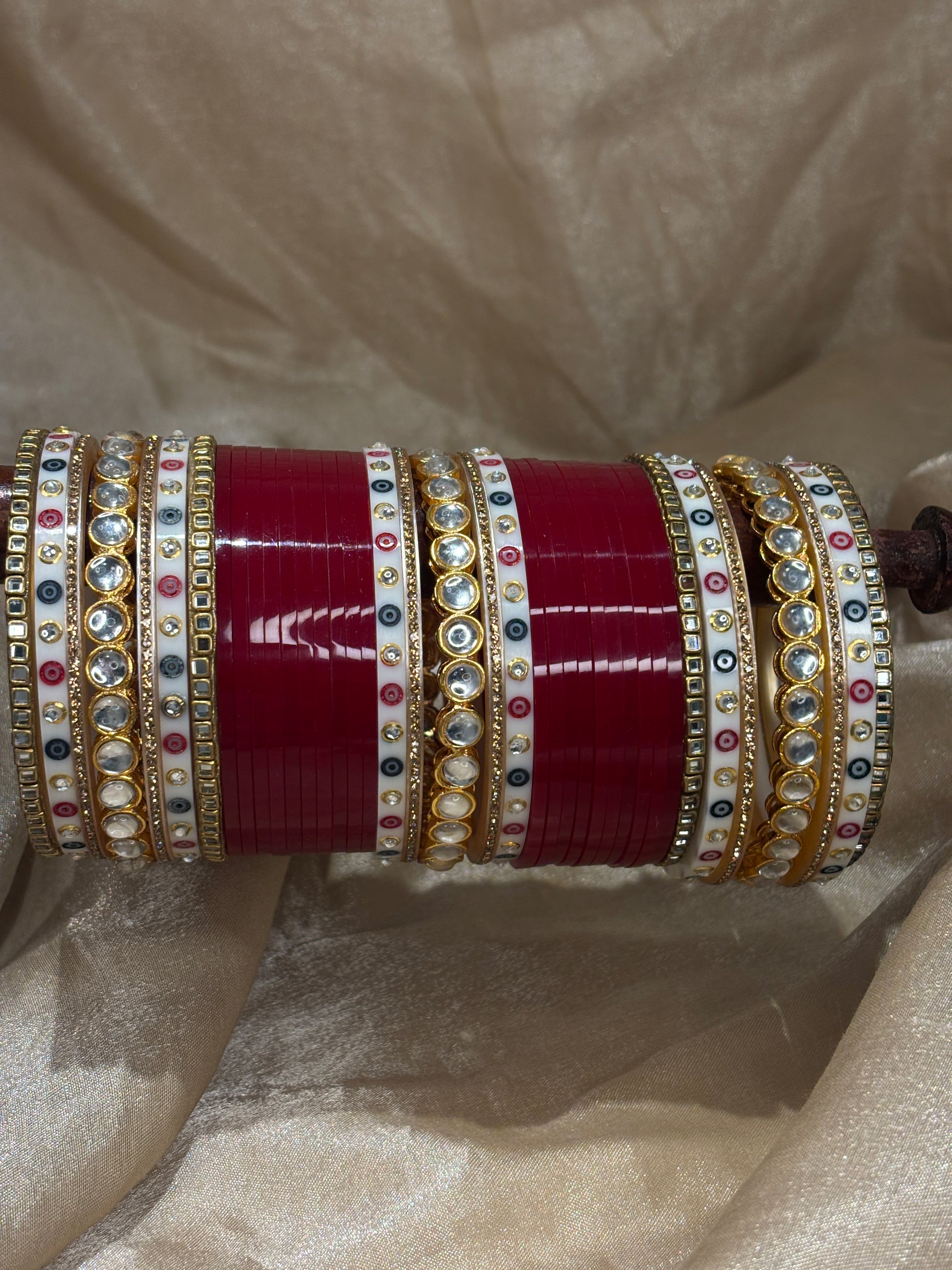 Our textured kundan detail choora with our cherry red choora grinder bangles; for two hands