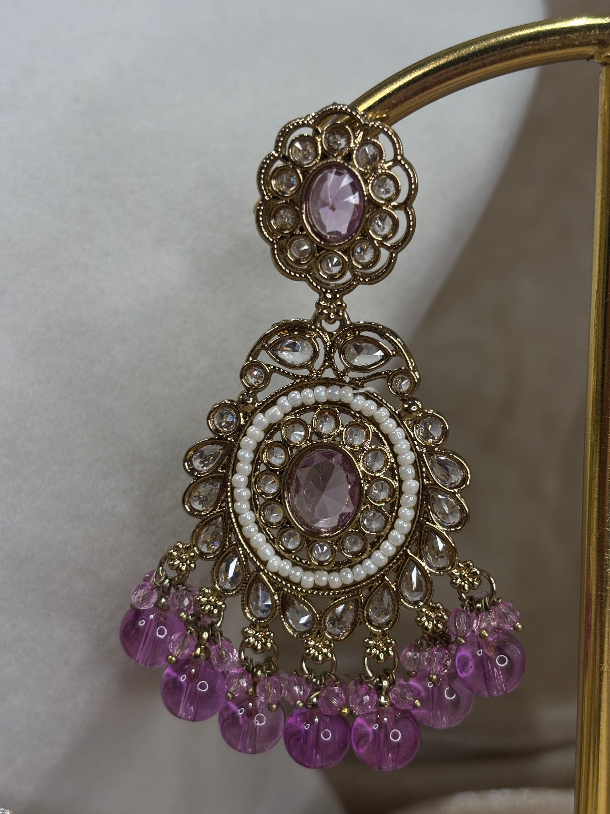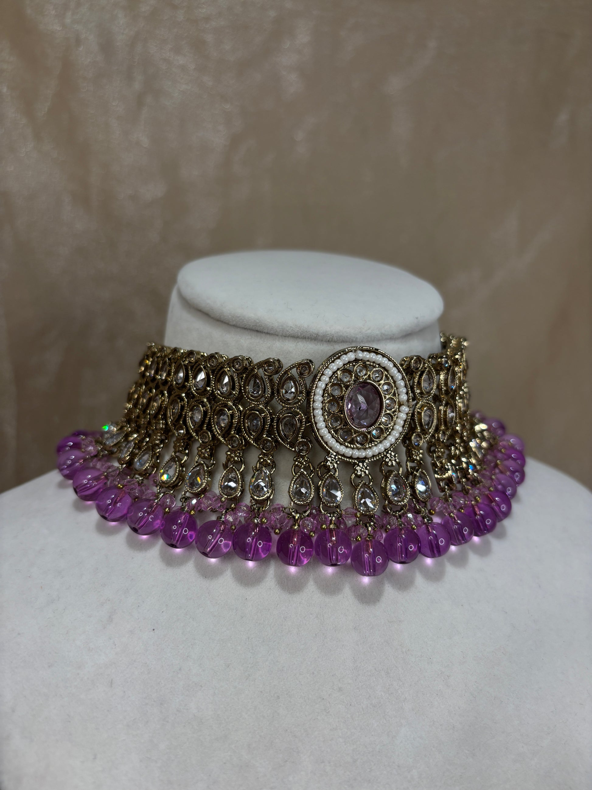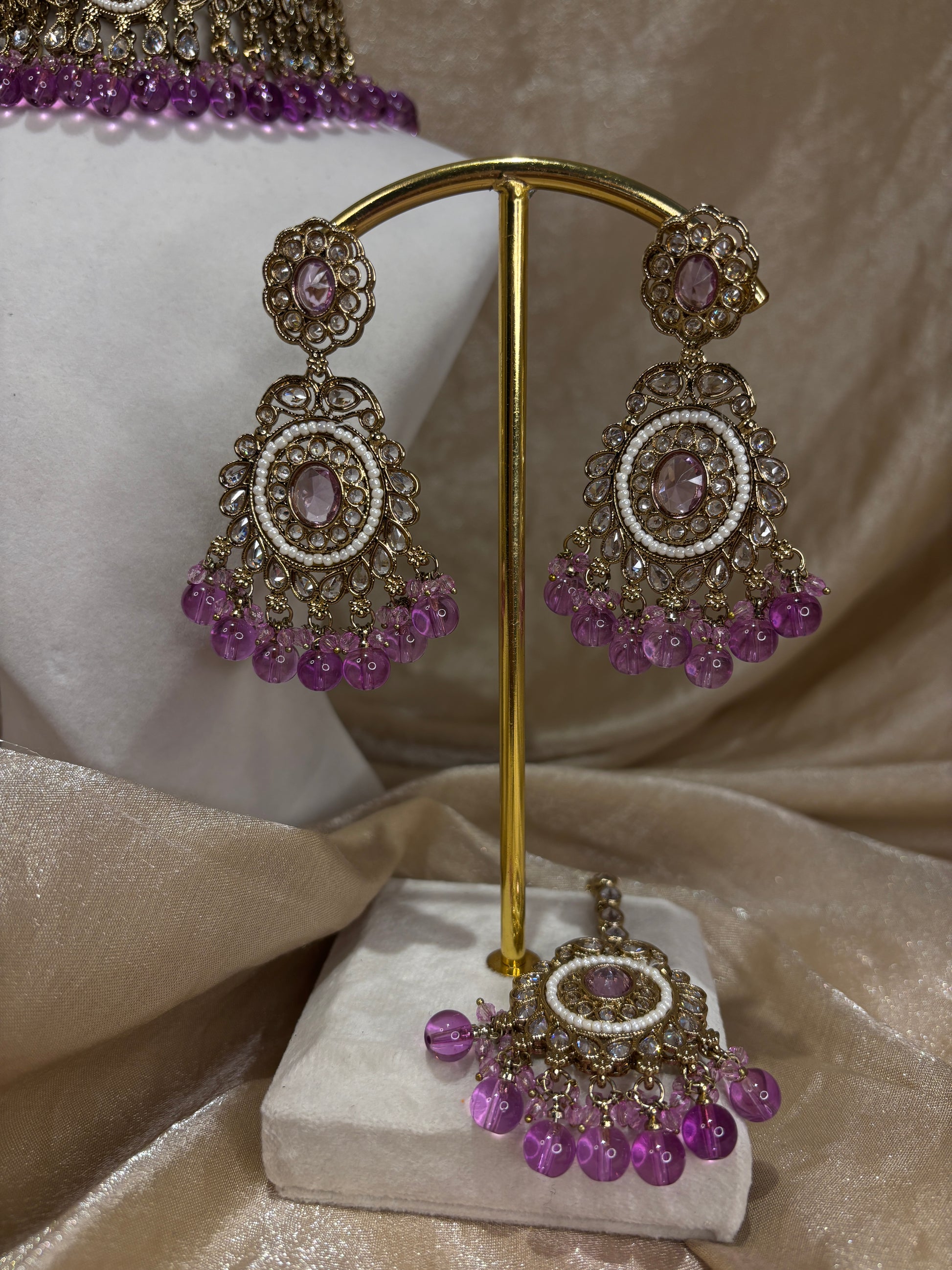Lavender choker set with small pearl details; comes with earrings and tikka