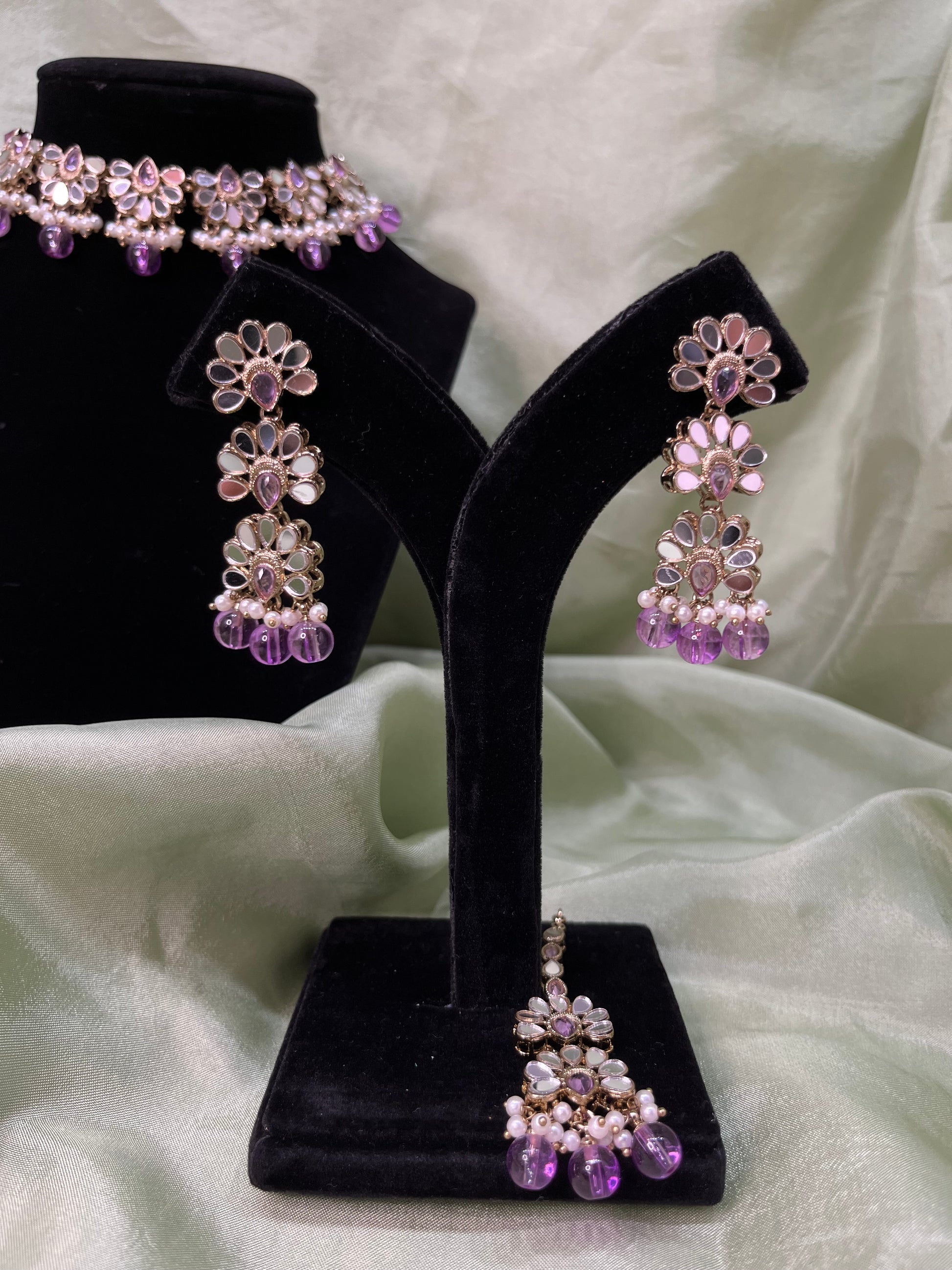 Lavender choker with mirror work details; comes with earrings and tikka